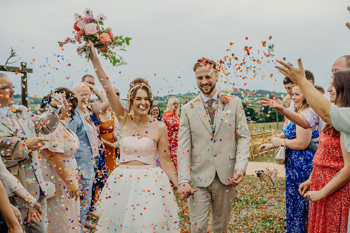 The al fresco ceremony took place under an arch framing the rolling Devon hills. “We were lucky the weather stayed dry enough for our ceremony outside,” says Rebecca. “I was walked down the aisle by Rachel, my best friend of 25 years.” With vows exchanged and confetti thrown, guests enjoyed popsicle Prosecco and nibble pots while soaking in the countryside views.