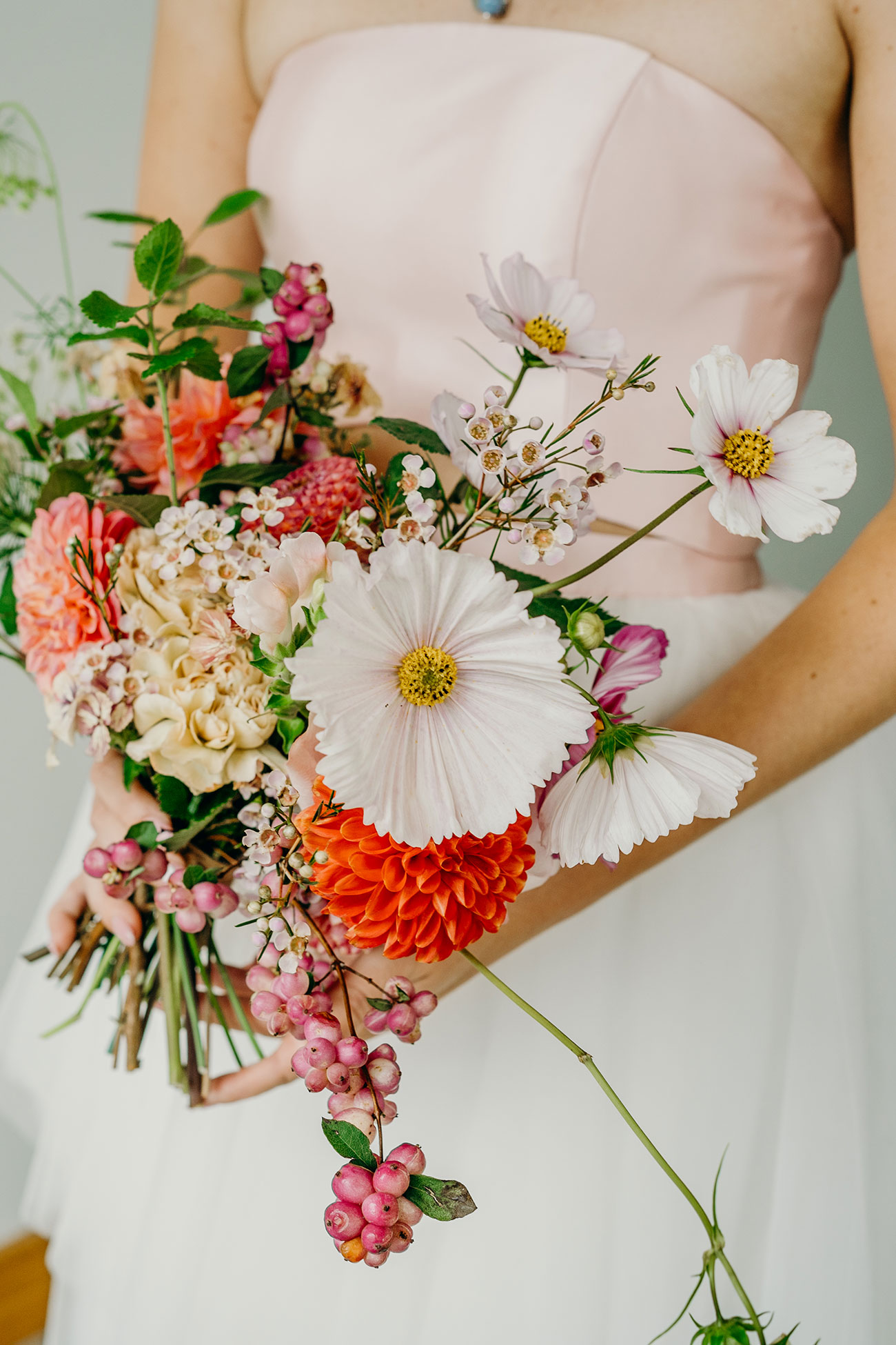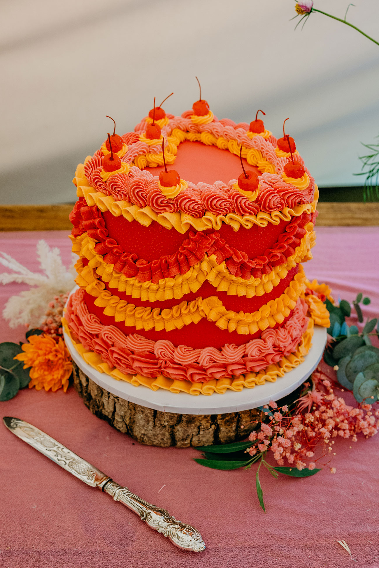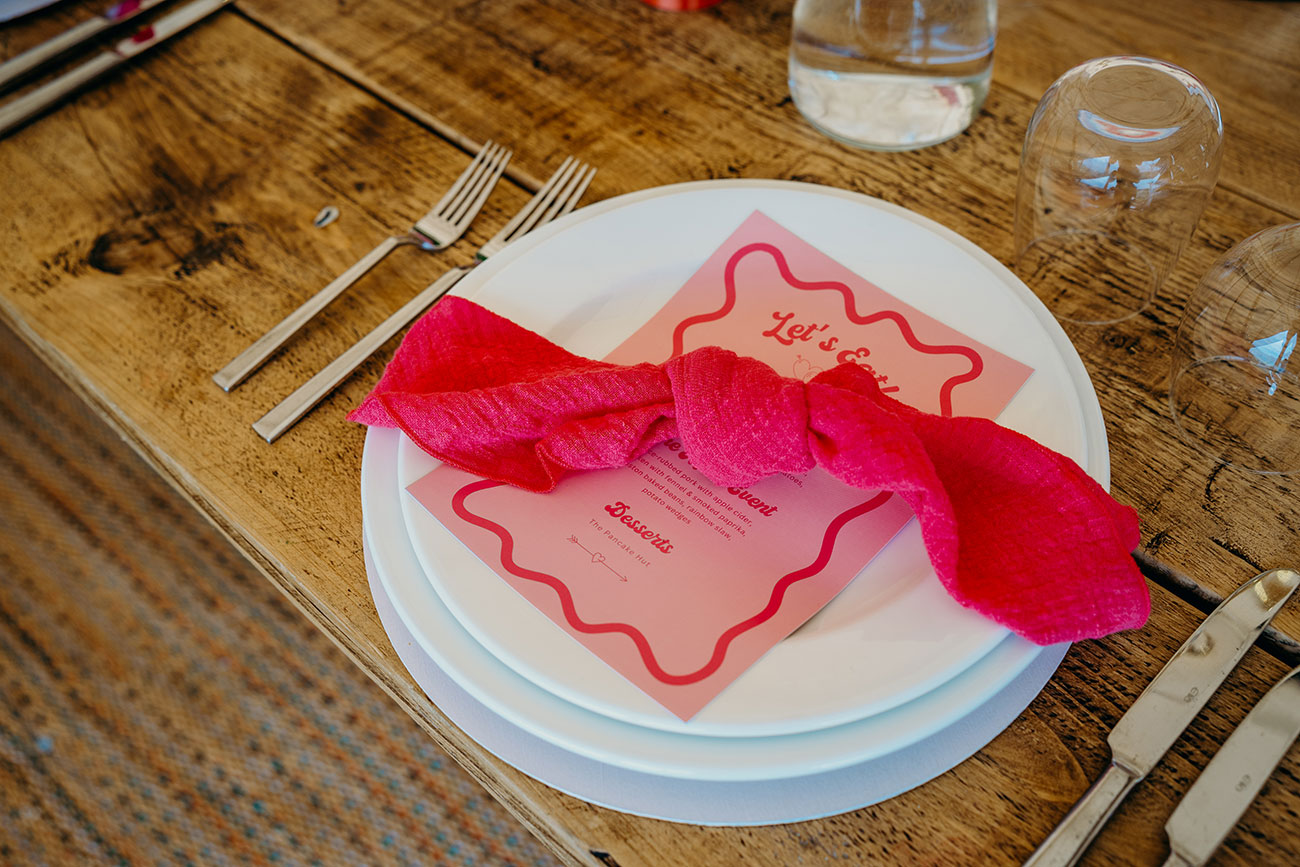 The colour palette was a bold blend of cerise, blush and burnt orange, inspired by sunset festival vibes. The theme carried through the playful stationery, vibrant floral arrangements and a statement cake adorned with colourful piping and cherries. Even Rebecca’s bridal look reflected the fun, free-spirited mood, wearing a two-piece gown, paired with fluffy mules and stacked headbands. Later in the evening, she changed into a party-ready dress with a statement back bow and sequined Prada sneakers. “We chose neutral suits for Tom and his groomsmen to complement the bright bridesmaids’ dresses,” she adds.
