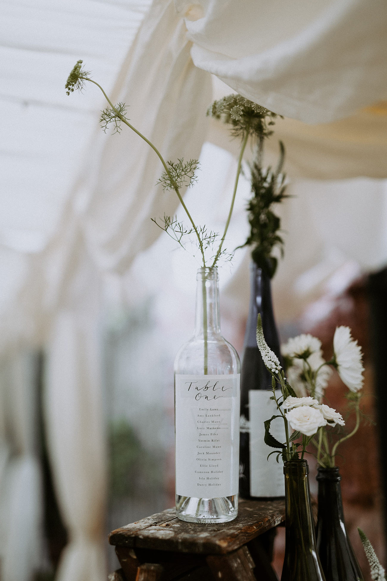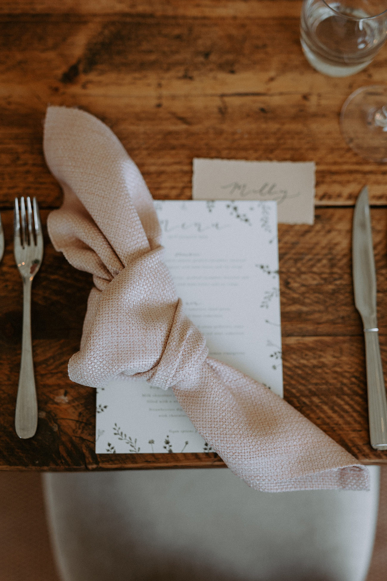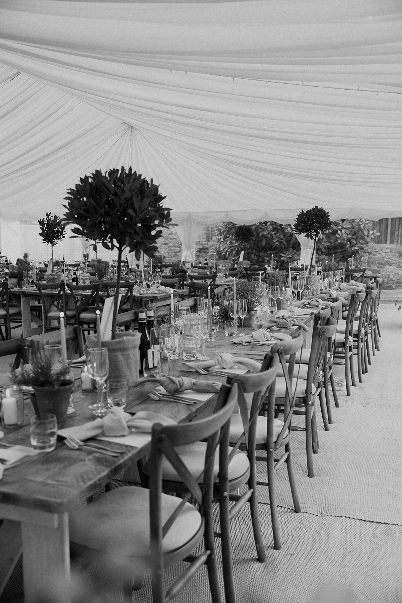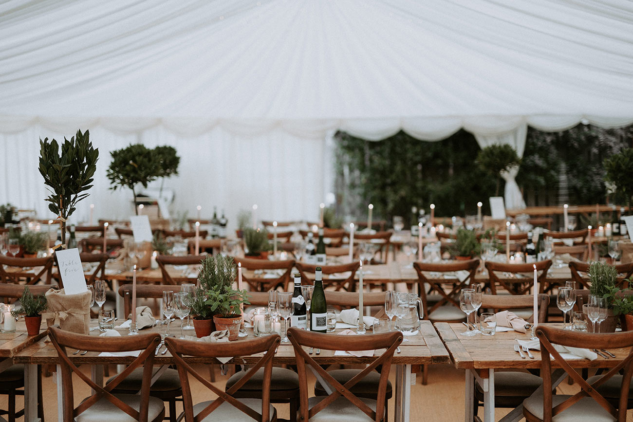 Her cousin created all the stationery, from the invitations to the table numbers, while Milly and Edd bought bay trees and herbs that they placed in terracotta pots and scattered throughout. “I liked the idea of the plants being used again after the day,” she says. “We have repotted a lot of them and given some to family and friends to remember the day.”