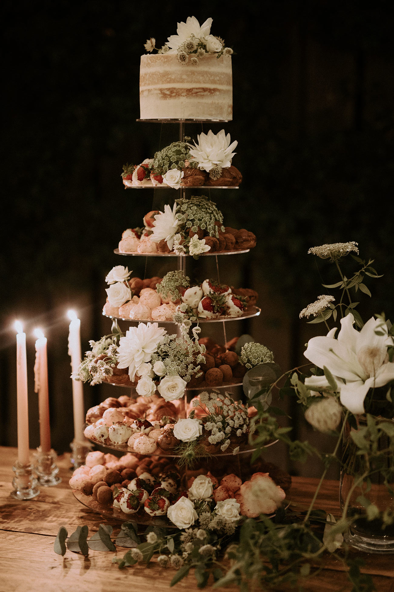 Guests gathered at Milly’s parents’ house for canapés and a live saxophonist, after which the speeches were delivered before the wedding breakfast “so the boys could all relax”. Spinach, goat’s cheese and red onion pithivier was followed by sirloin of beef served with herby new potatoes and green salad. A smorgasbord of sweets then rounded off the feast in the delectable form of dark chocolate and rum truffles, milk chocolate and salted caramel choux buns, and strawberries dipped in white chocolate.