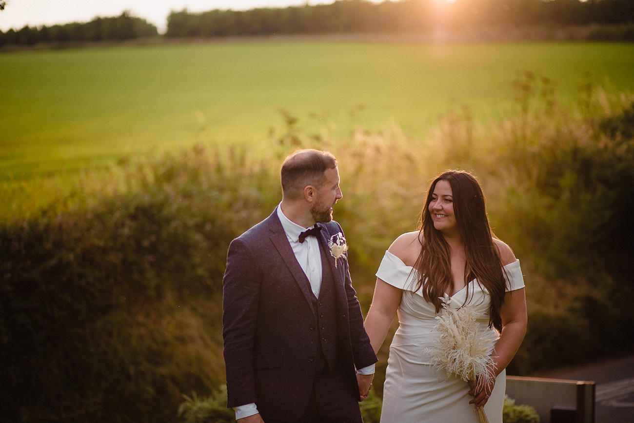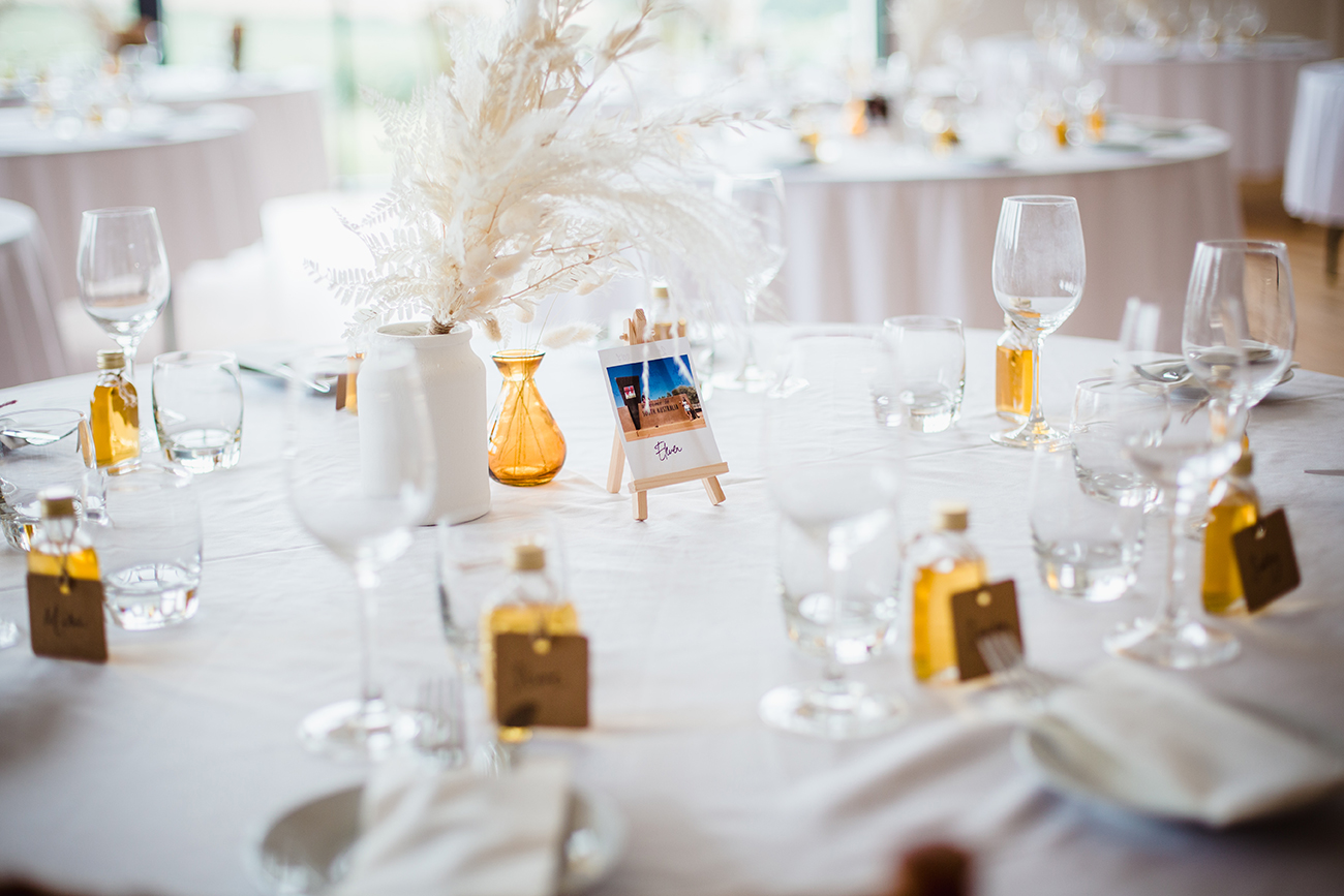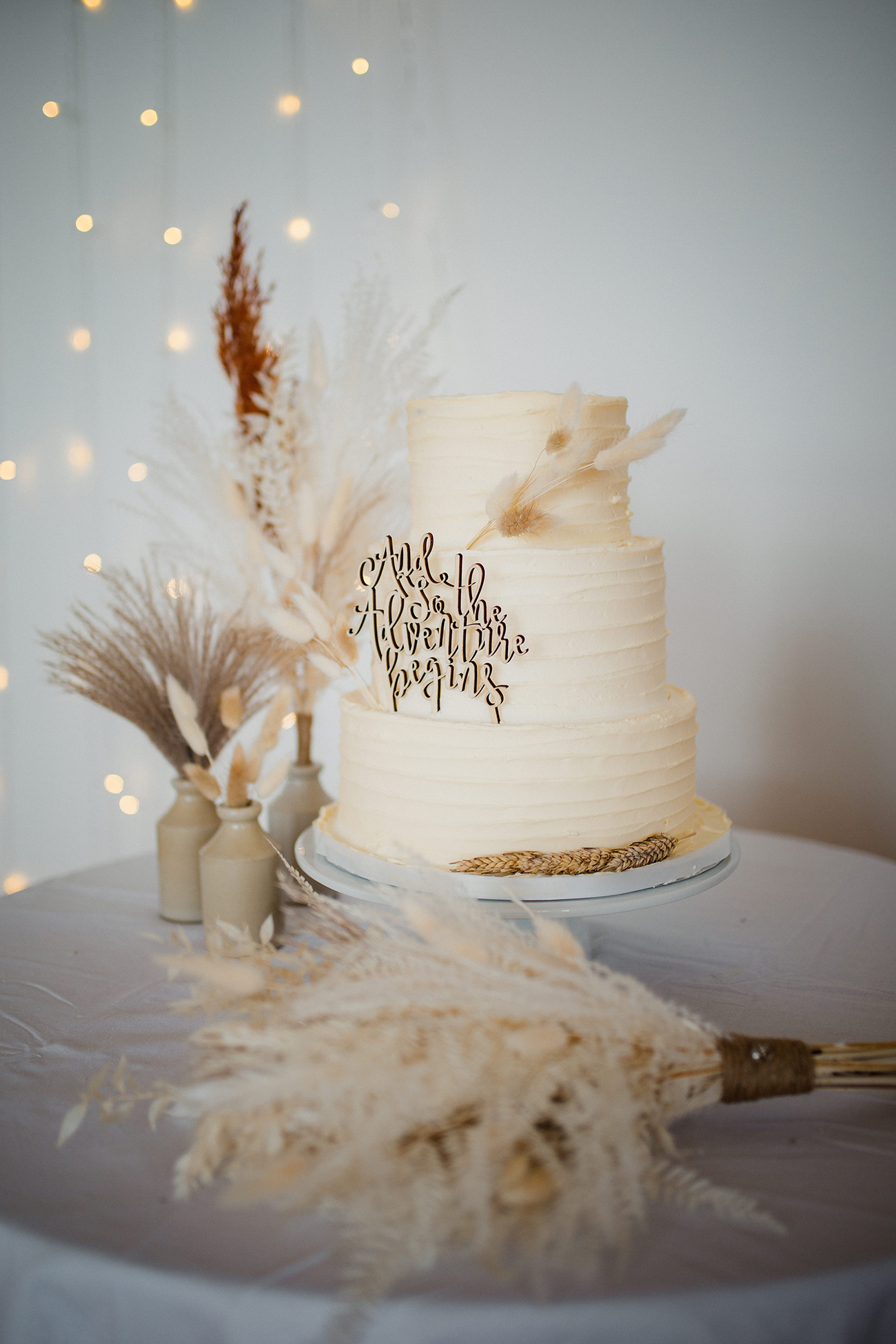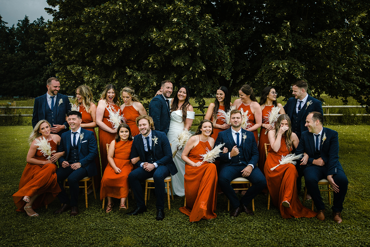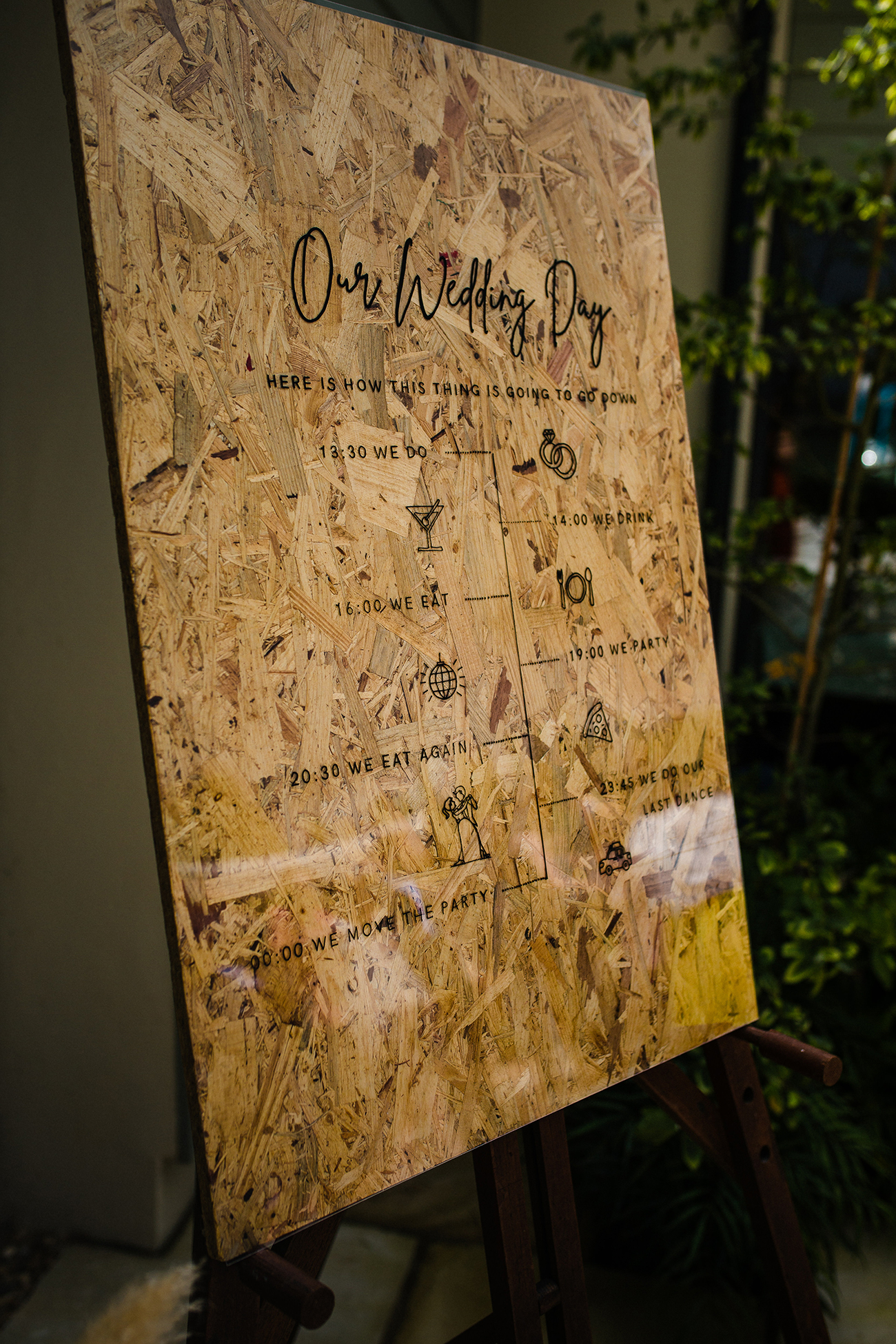 Ruth and Anthony relished the opportunity to put their stamp on their big day. “After the pandemic we were all just in need of some good quality time with friends and family, so we focused on great food, fun games, minimal formalities, and the best sangria recipe,” she says. The styling celebrated both the season and rural setting through a burnt orange hue paired with natural textures such as chipboard signage and bundles of dried flowers.