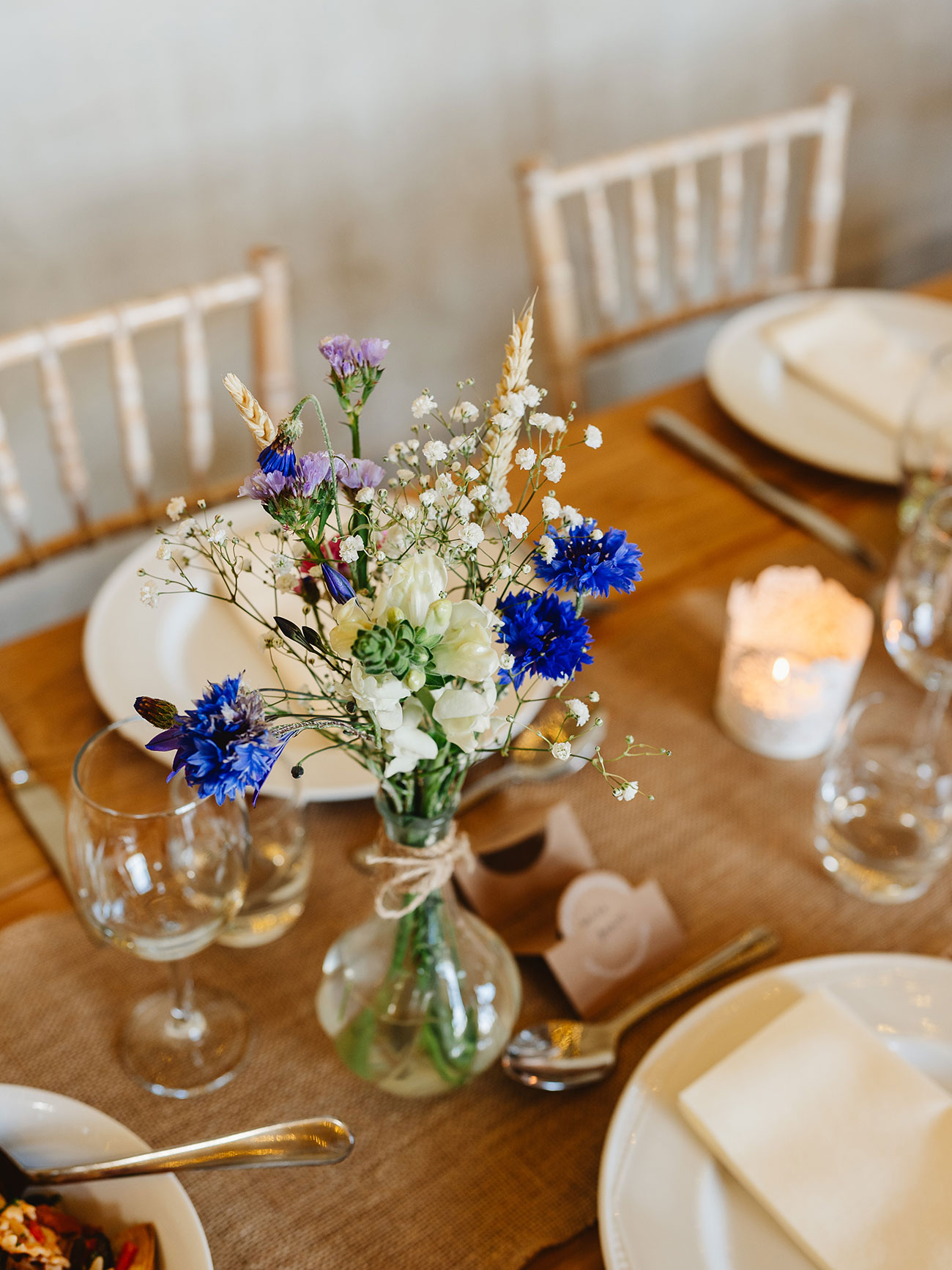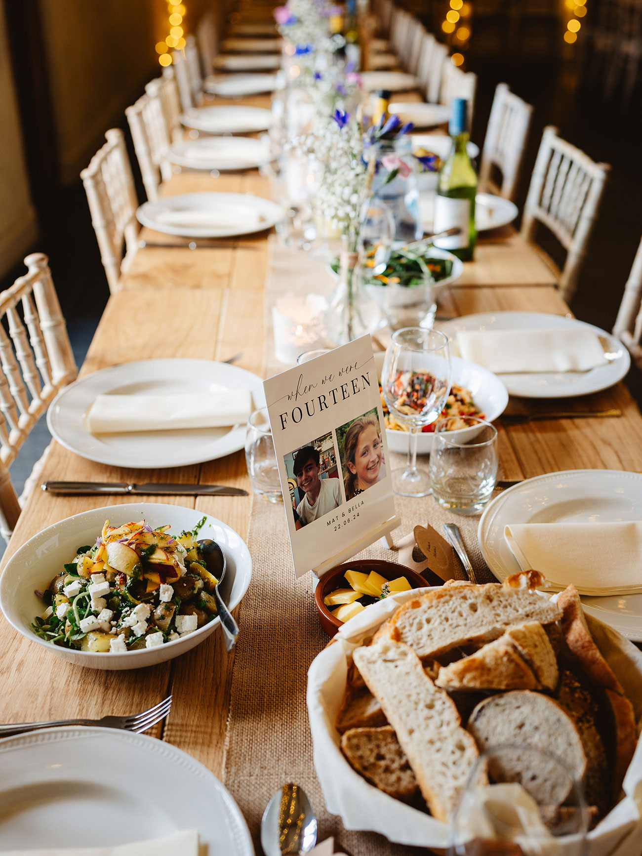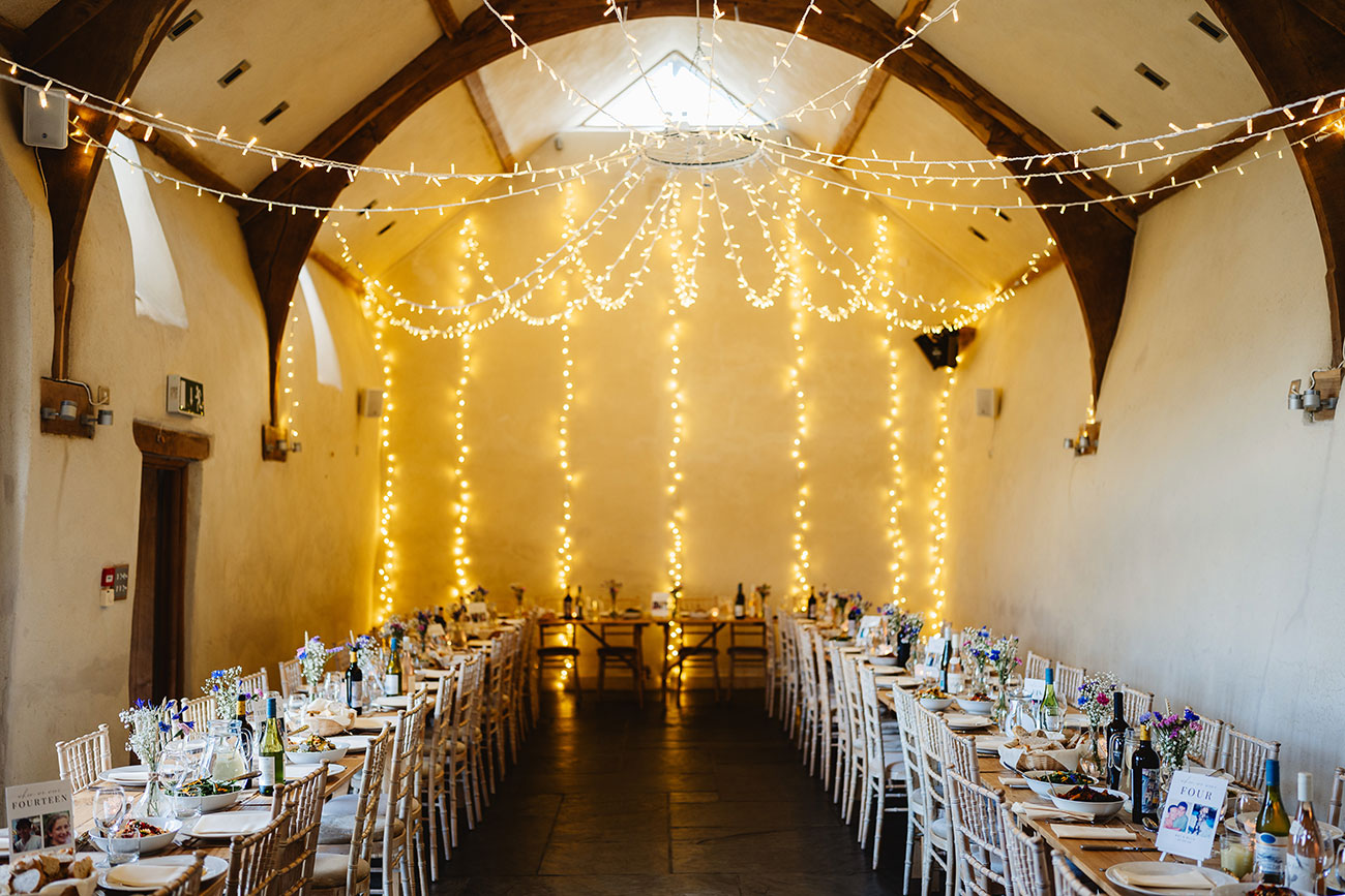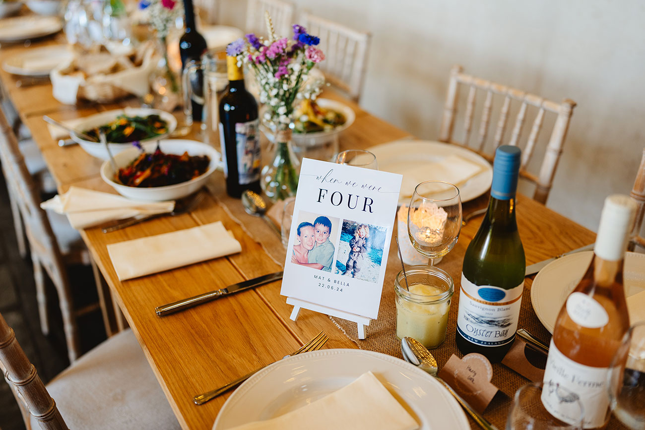 Personal touches and nods to Devon were woven throughout their celebrations, which stretched across four days. "The lead-up to the wedding included exploring the beautiful countryside of Dartmoor and a cocktail masterclass,” says Bella. Opting for a palette of pastel shades to complement the rustic spaces of the barn, the couple dotted the tables with posies of wildflowers they had arranged themselves. “We collected candles, candleholders and table decorations,” she says. “We received lots of compliments for our personal choice of table numbers. We made a series of 'when we were one, two, three…’ cards with photos of us at that age. This small touch went a long way!”
