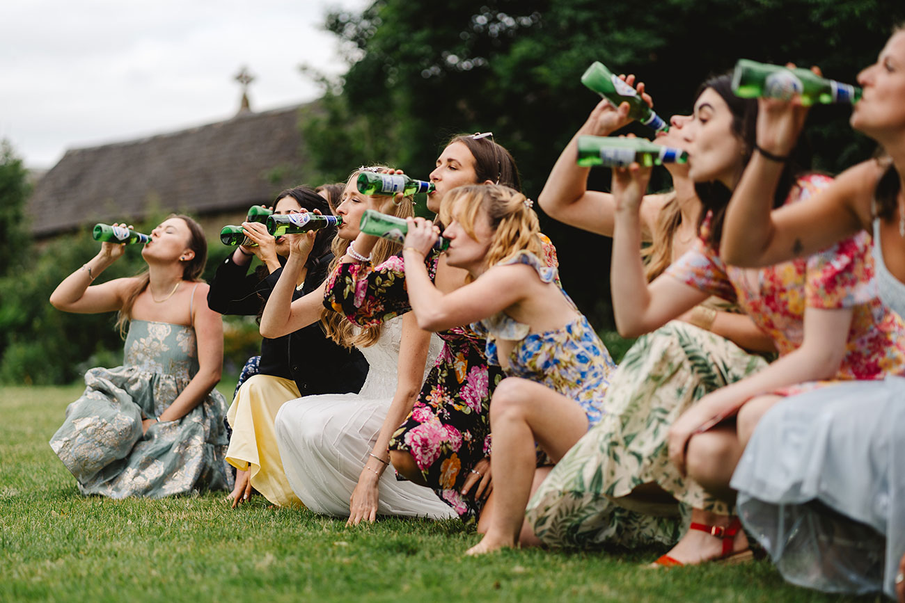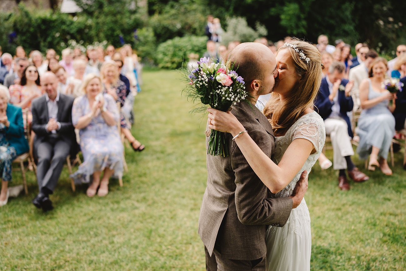 After the ceremony, guests tucked into a homemade cream tea served on vintage china followed by a hog roast and fresh salads. A dessert table filled with cakes, brownies and cookies homemade by friends and family provided the sweet endnote to the flavoursome feast before guests spilled out into the scenic grounds for mingling and garden games in the late afternoon sun. A 30-person competitive game of Flunkyball – a German game testing your hand-eye coordination and drinking skills – proved a highlight. “We were enjoying this space so much we kept pushing our first dance back to enjoy the last of the evening sun!” says Bella.