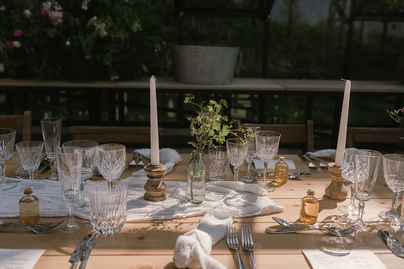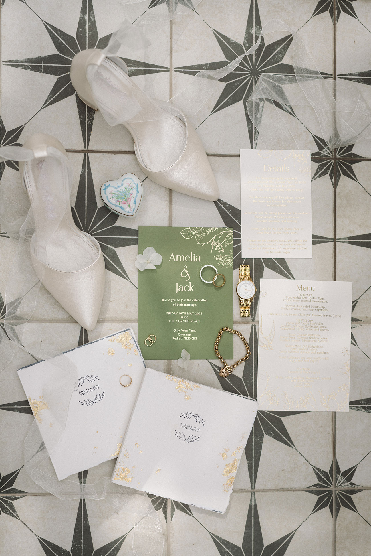 With no set theme in mind, the couple’s brief for their intimate wedding at The Cornish Place was simple: to be as sustainable as possible. From Amelia’s jewellery and the ring box to the table décor, everything was either vintage or sourced second-hand, while Amelia requested her florist use seasonal blooms and lots of greenery – “so it had a wild hedgerow vibe which made everything seem so magical,” she says. “In the end, it had a romantic vintage feel which was so relaxed, but stunning!”