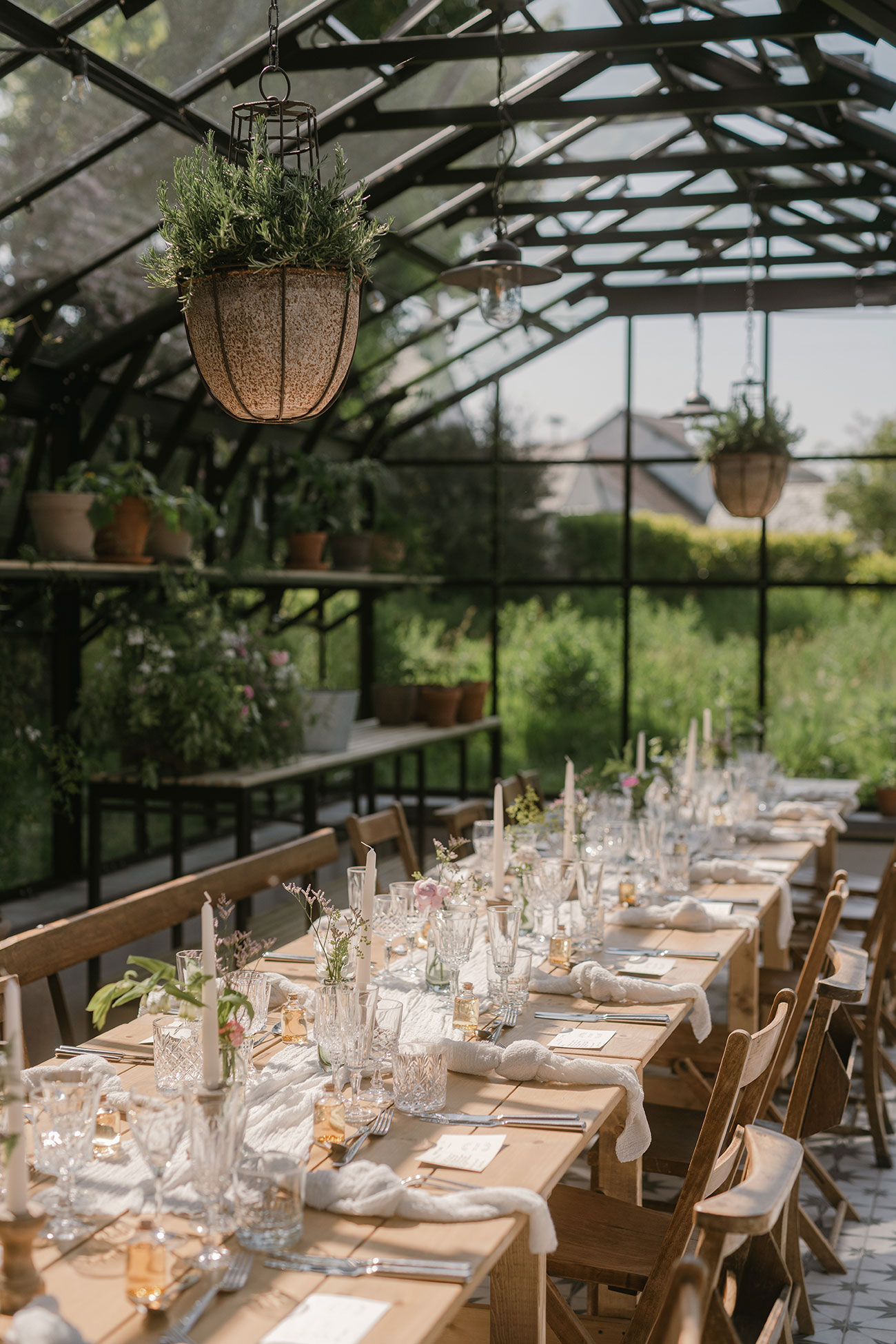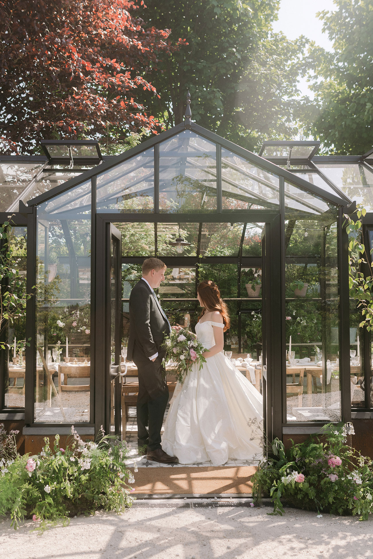 Drinks, canapés and live music followed in the paddock while the newlyweds slipped away for photos. The wedding breakfast was served in the glasshouse, where guests feasted on teriyaki pork belly, smoked duck salads, halloumi fries, beef fillet, chicken, sticky toffee pudding and lemon posset.