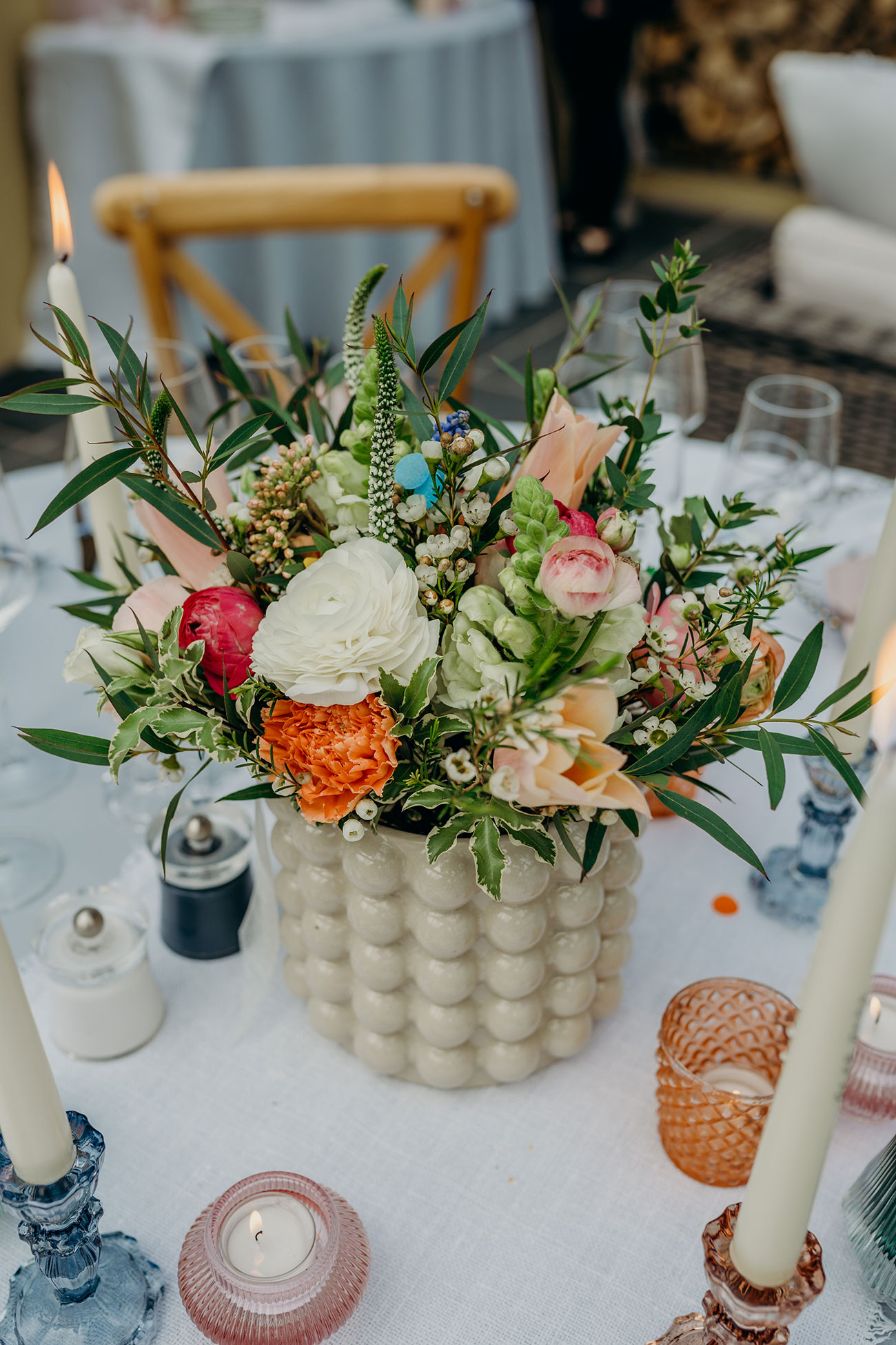 When it came to the décor, the couple wanted to add as many personal touches as possible, including “personalised candles made with dates, our new surname and ‘in jokes’ between the two of us”, says Lydia.