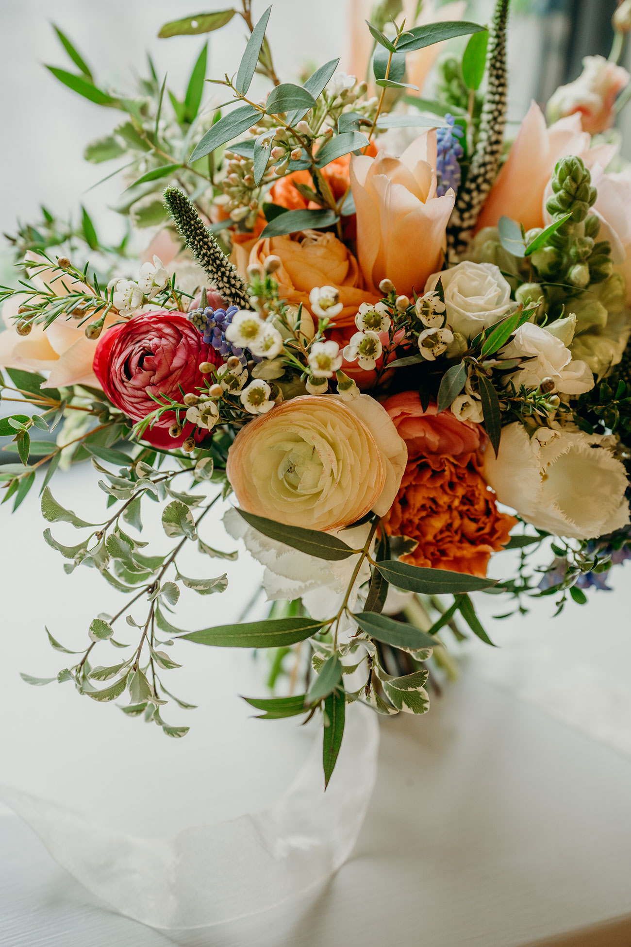 A gorgeous medley of peonies, hyacinths, hydrangeas and eucalyptus carried from the bouquets to the wedding arch. “We were absolutely over the moon with the outcome!” says Megan.