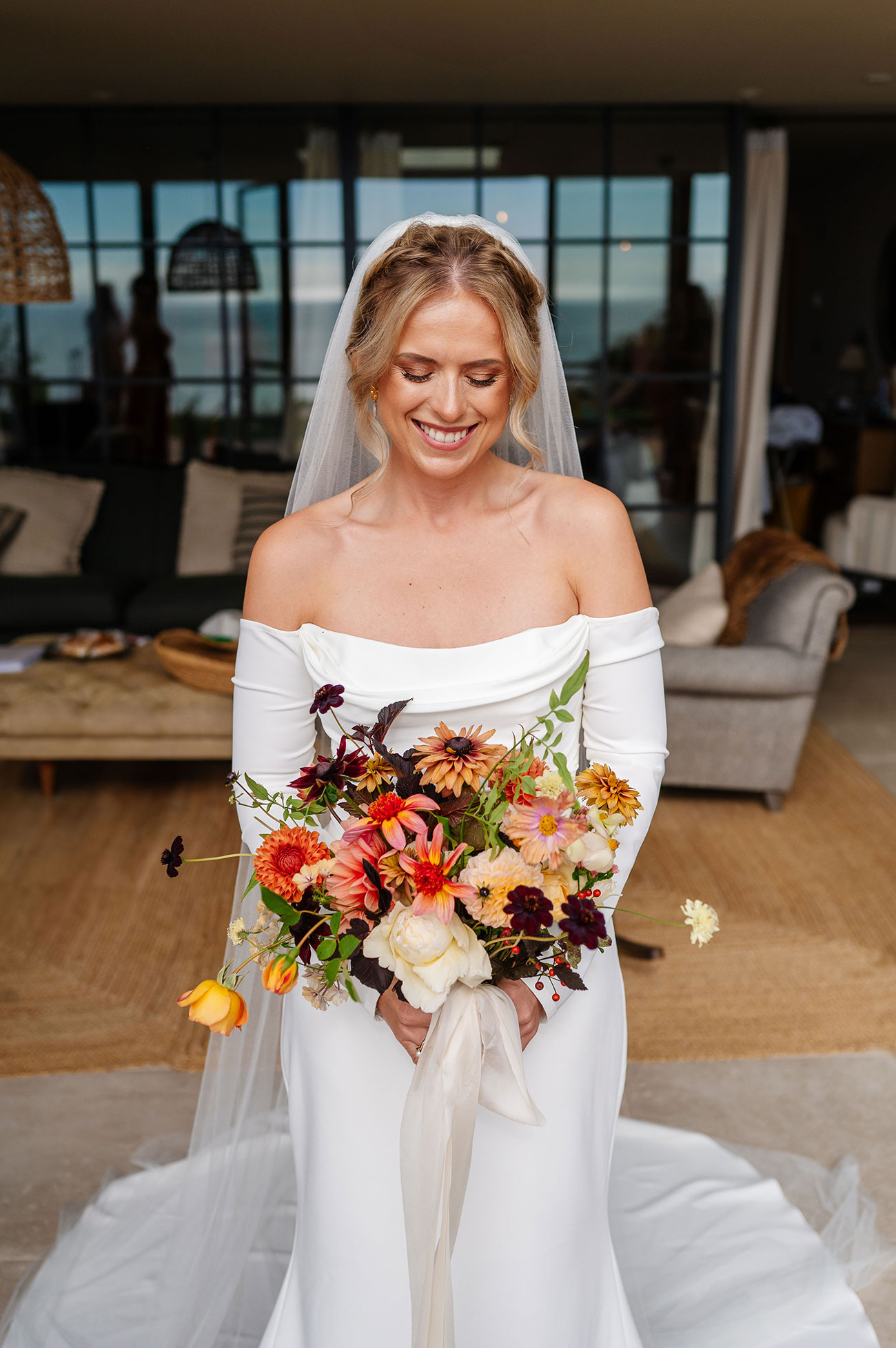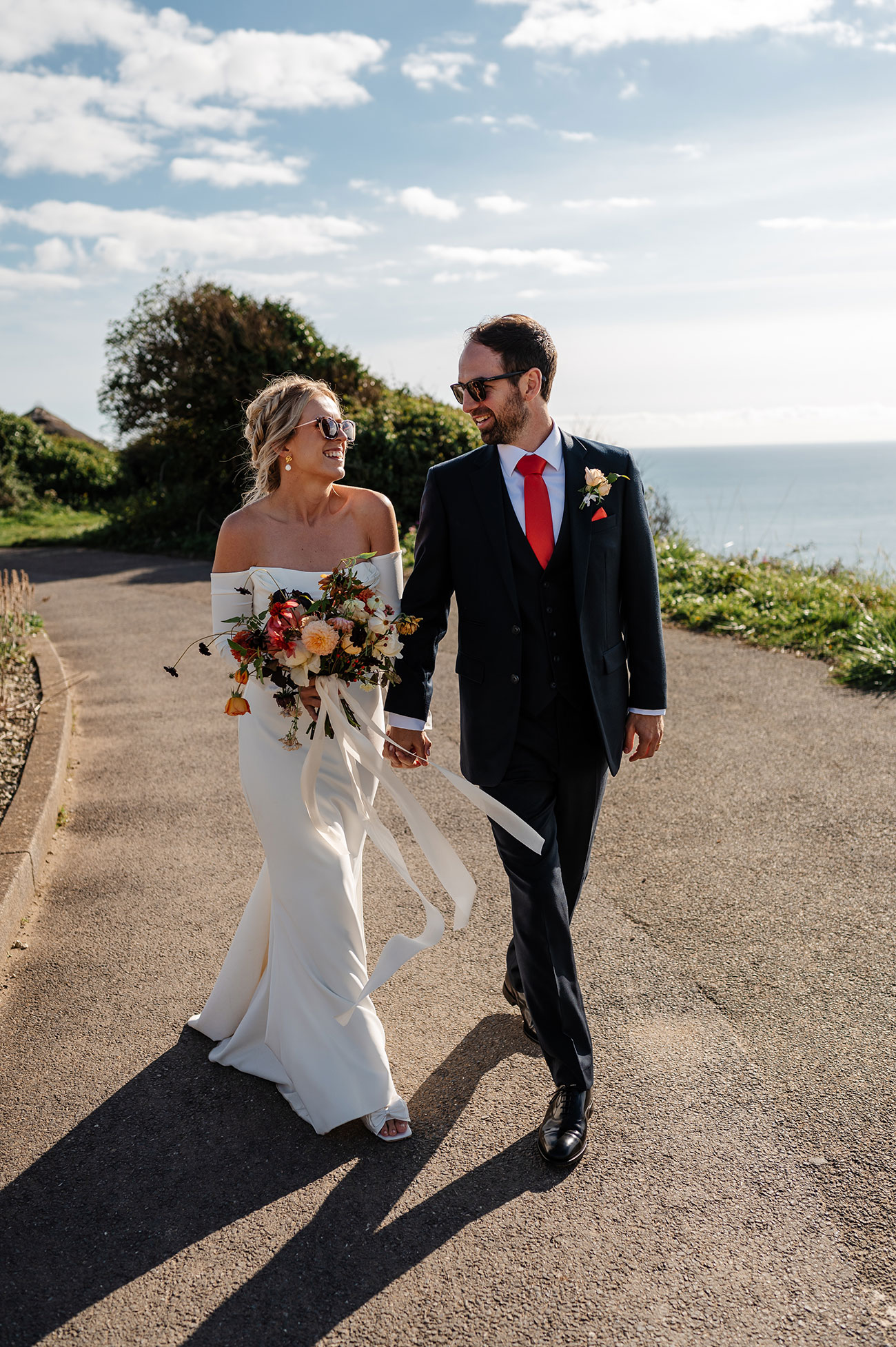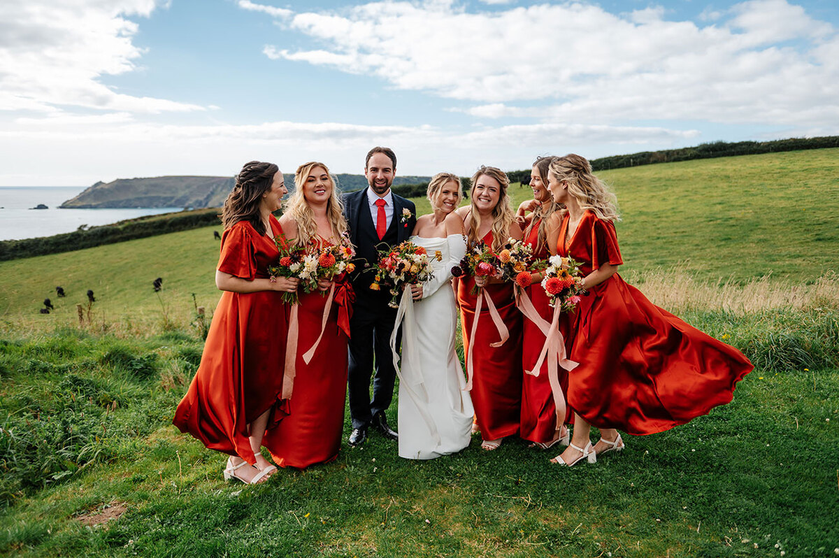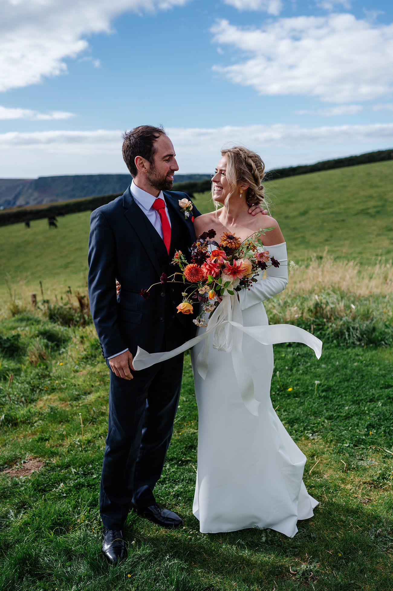 Flanked by bridesmaids in burnt orange dresses, Amie donned a gorgeous minimalist, off-the-shoulder gown for the ceremony, when the couple exchanged their own vows before the south Devon seascape. “My childhood friend, Emmalene, read a poem by one of our favourite authors, Elizabeth Day, called Love is Not a Grenade,” she says. “And Jack’s friend, Ben, read a poem called The Giraffe and the Monkey by Daniel Thompson.”