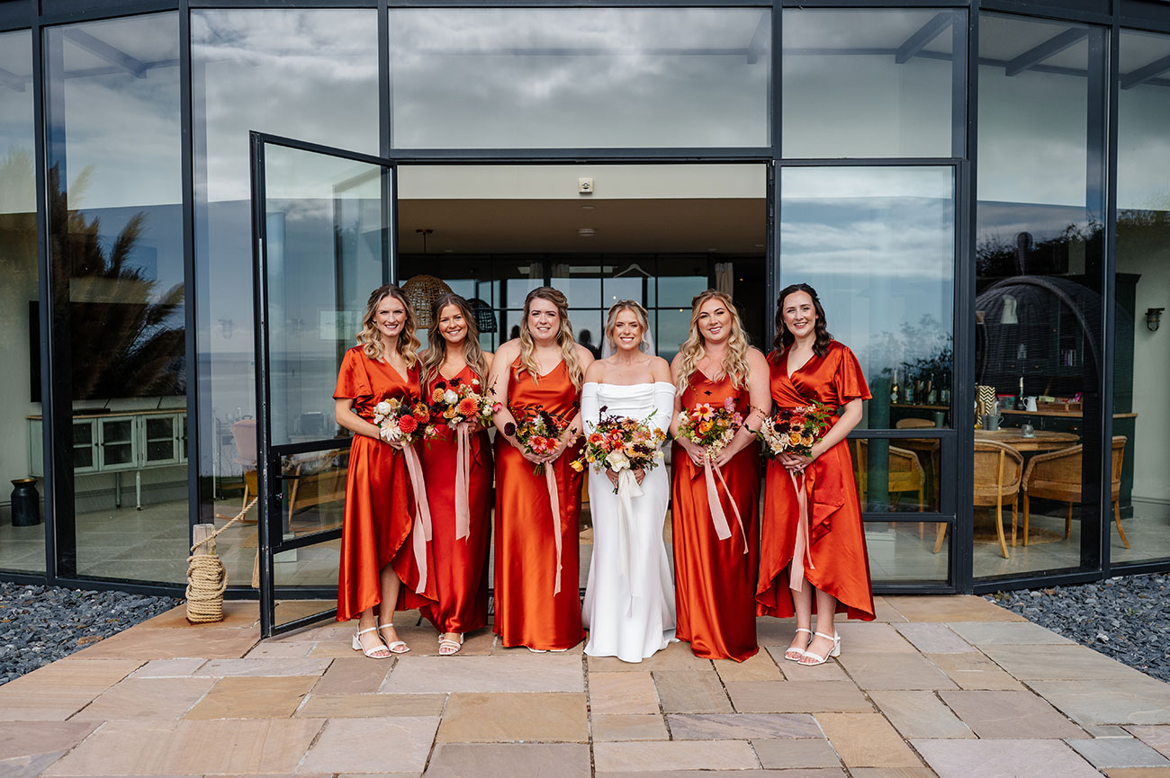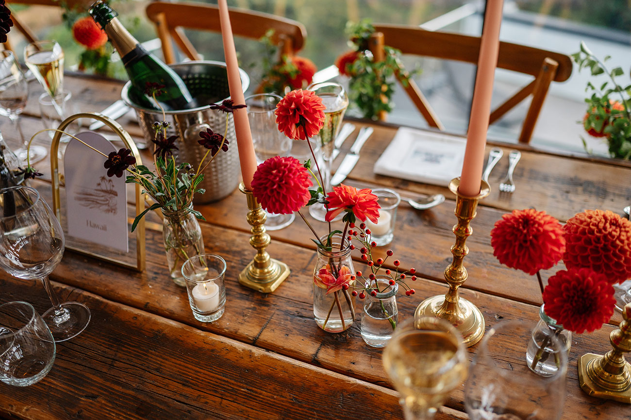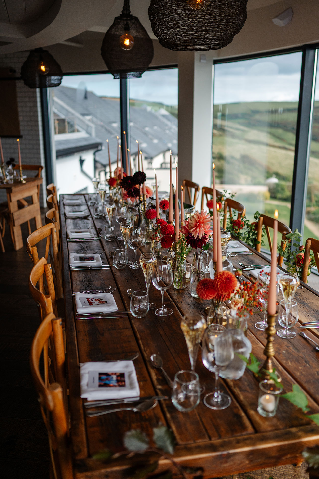 Their late September wedding date inspired a palette of warm autumnal shades – incorporating lots of orange, which is Amie’s favourite colour – while the stationery nodded to the coastal location. The combination of wooden tables, glorious florals and gold candlesticks and table name frames made for stunning tablescapes.
