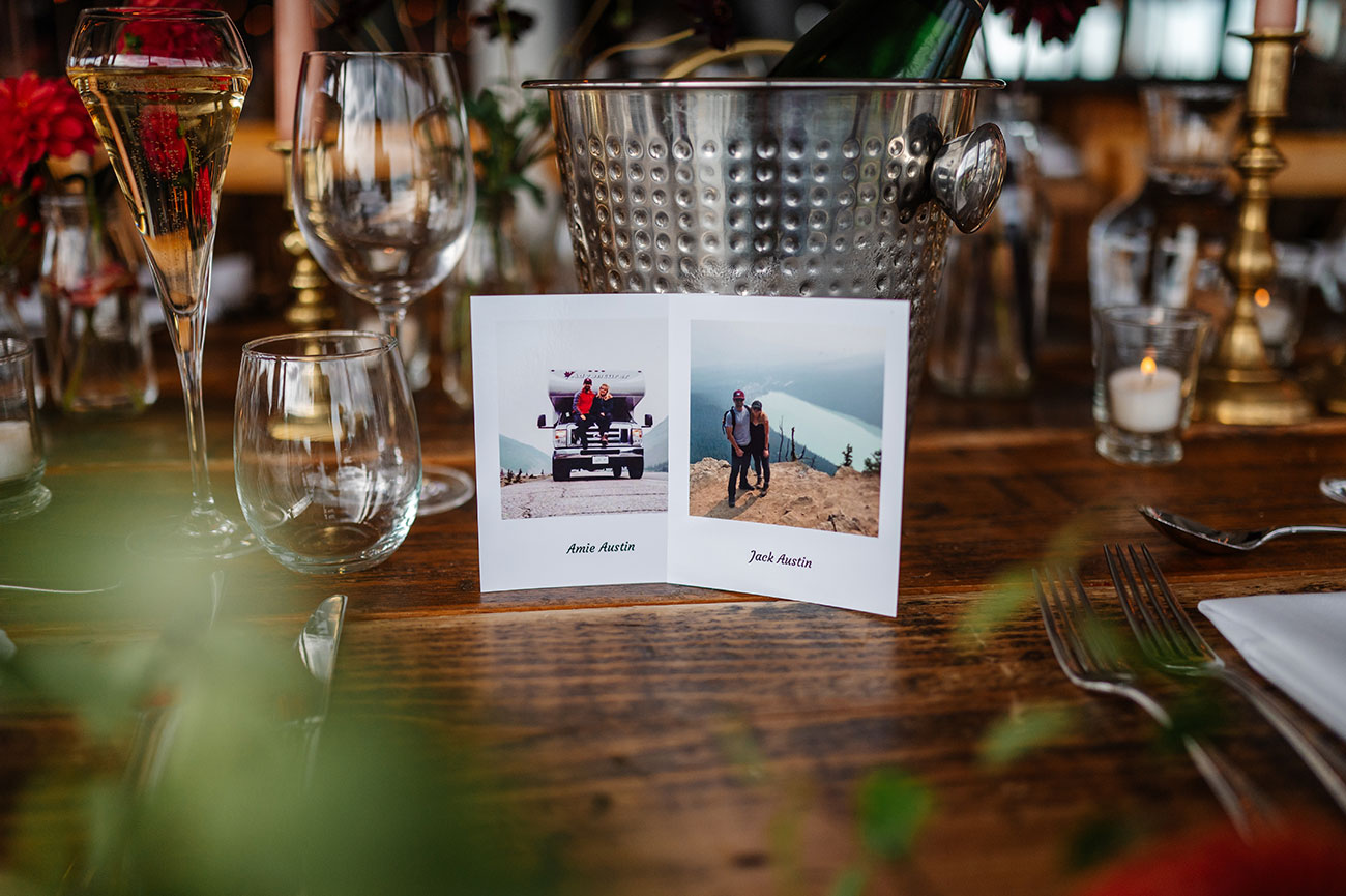 Moving to the terrace for drinks served alongside ocean views, the newlyweds took some quiet moments to themselves to enjoy champagne and a sneak peek of the table set-up. “We wanted to do something personal for the place settings and decided on Polaroid photos for each guest,” says Jack. “It was lovely seeing everyone remembering when each was taken; it was also a good conversation starter!”