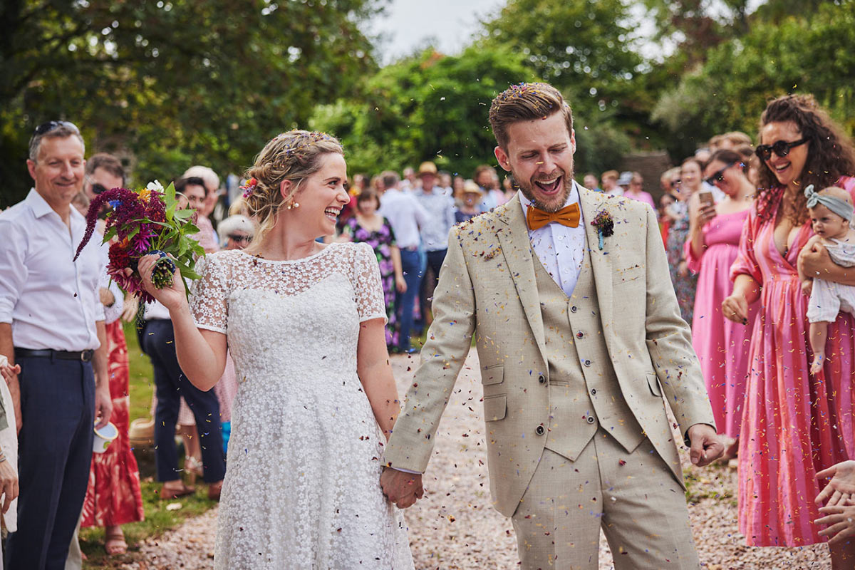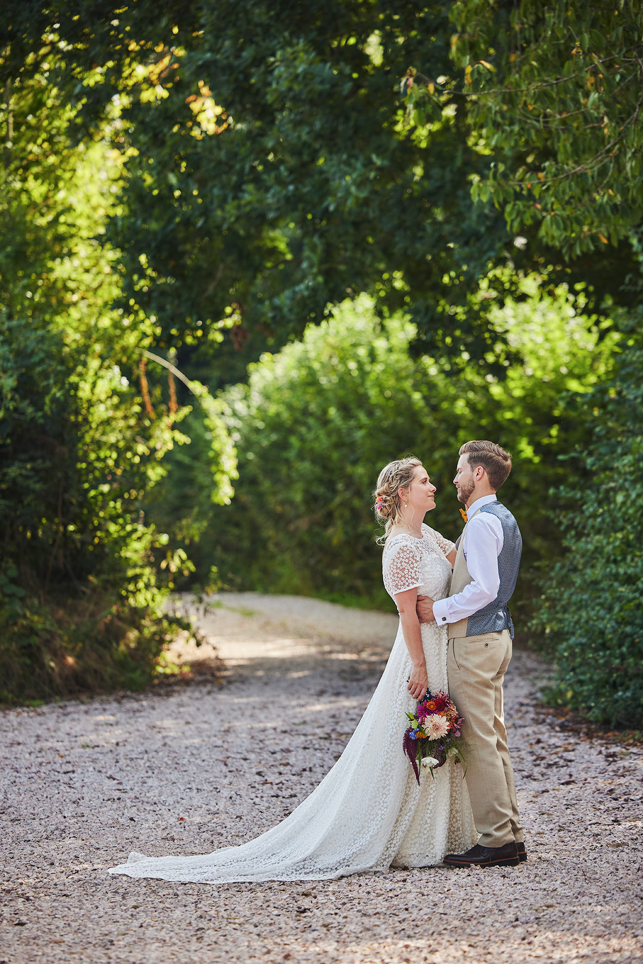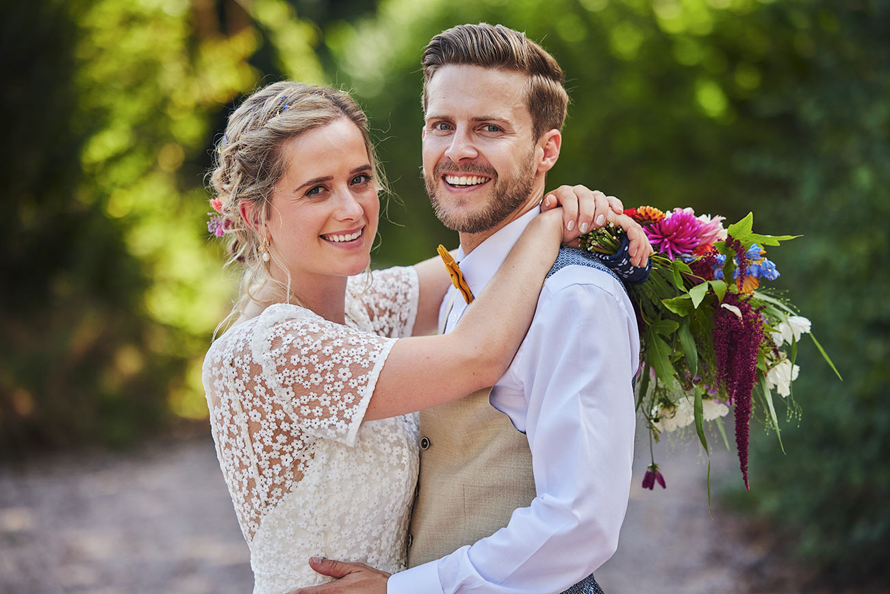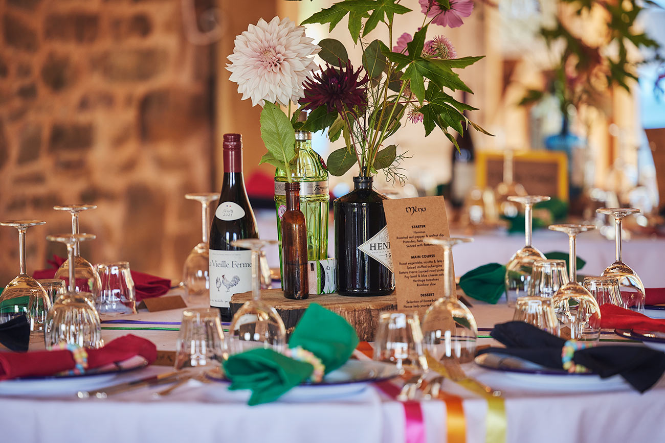 Hayne Devon was the idyllic setting for their colourful country wedding, which blended a variety of themes from The Lord of the Rings to “our love of the mountains, camping, travel and other people’s weddings we had been to!”. Vibrant displays of homegrown wildflowers were paired with handmade and secondhand décor to create a fun, personal and sustainable scene full of unique character. “This was exactly the sustainable country vibe we were after,” comments Ellie.