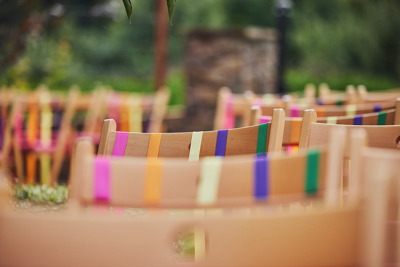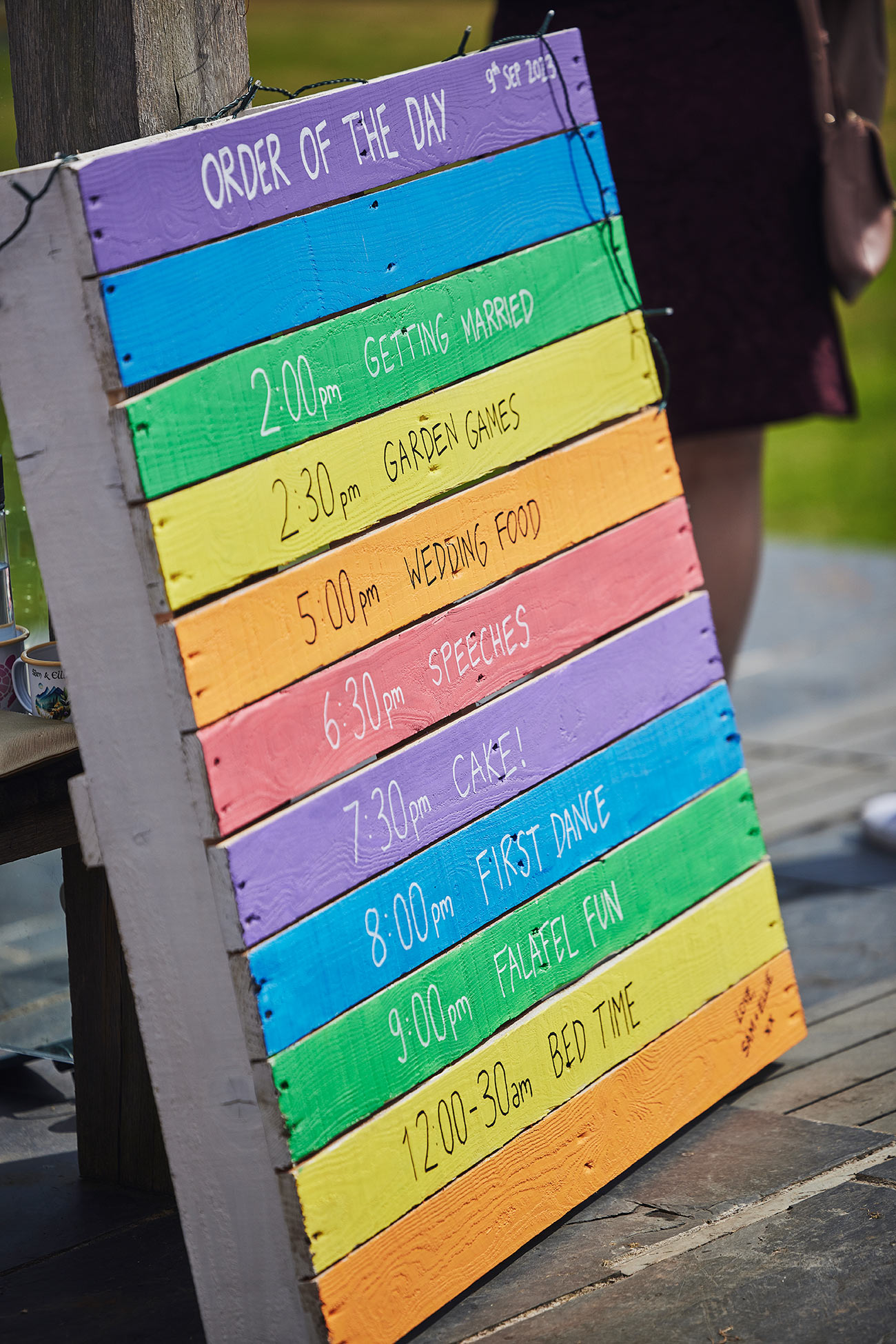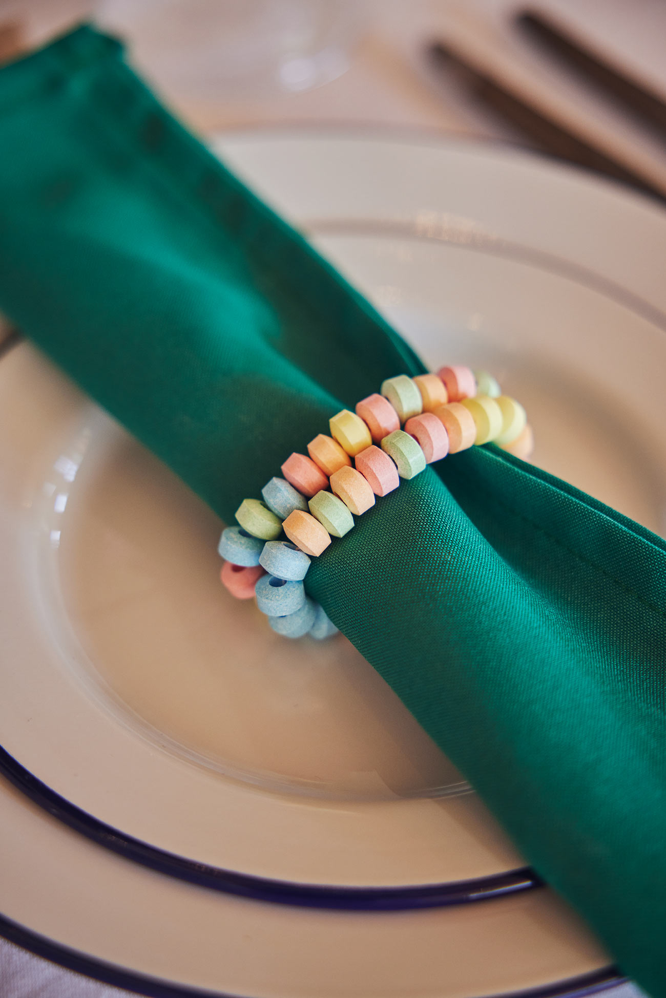 Sam took the corkboard from their kitchen to display the seating plan, which he printed along with the Lord of the Rings-inspired table names and place settings using sustainably sourced card. There was also an abundance of ‘something borrowed’, including the wooden centrepieces and Ellie’s friend’s 150 handmade coloured napkins. “For a fun touch we used candy necklaces as napkin rings,” says Ellie. “The guests loved this and it also made the whole room smell amazing.”