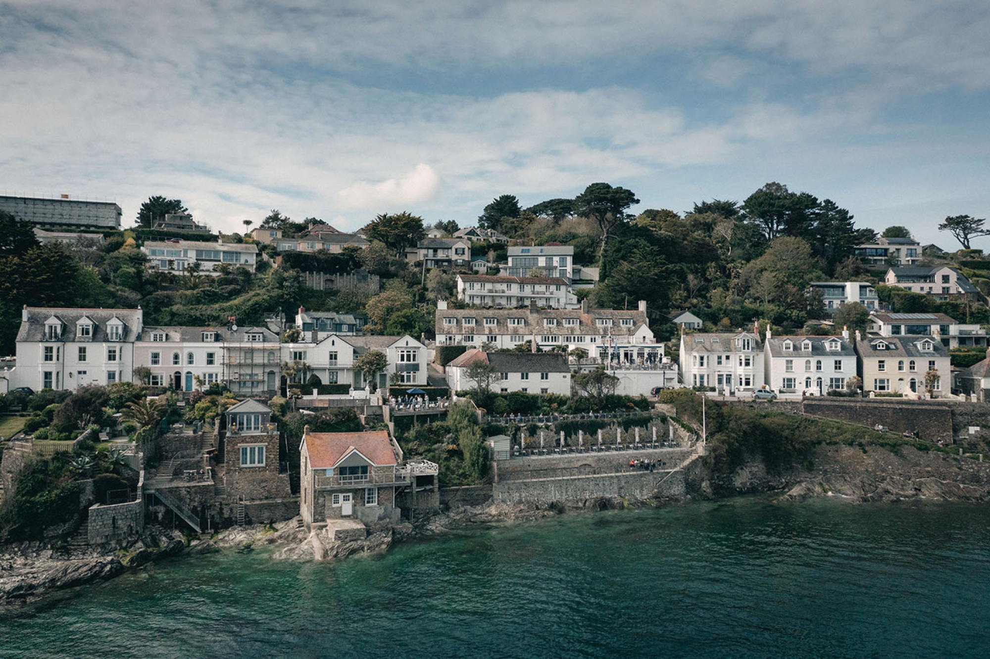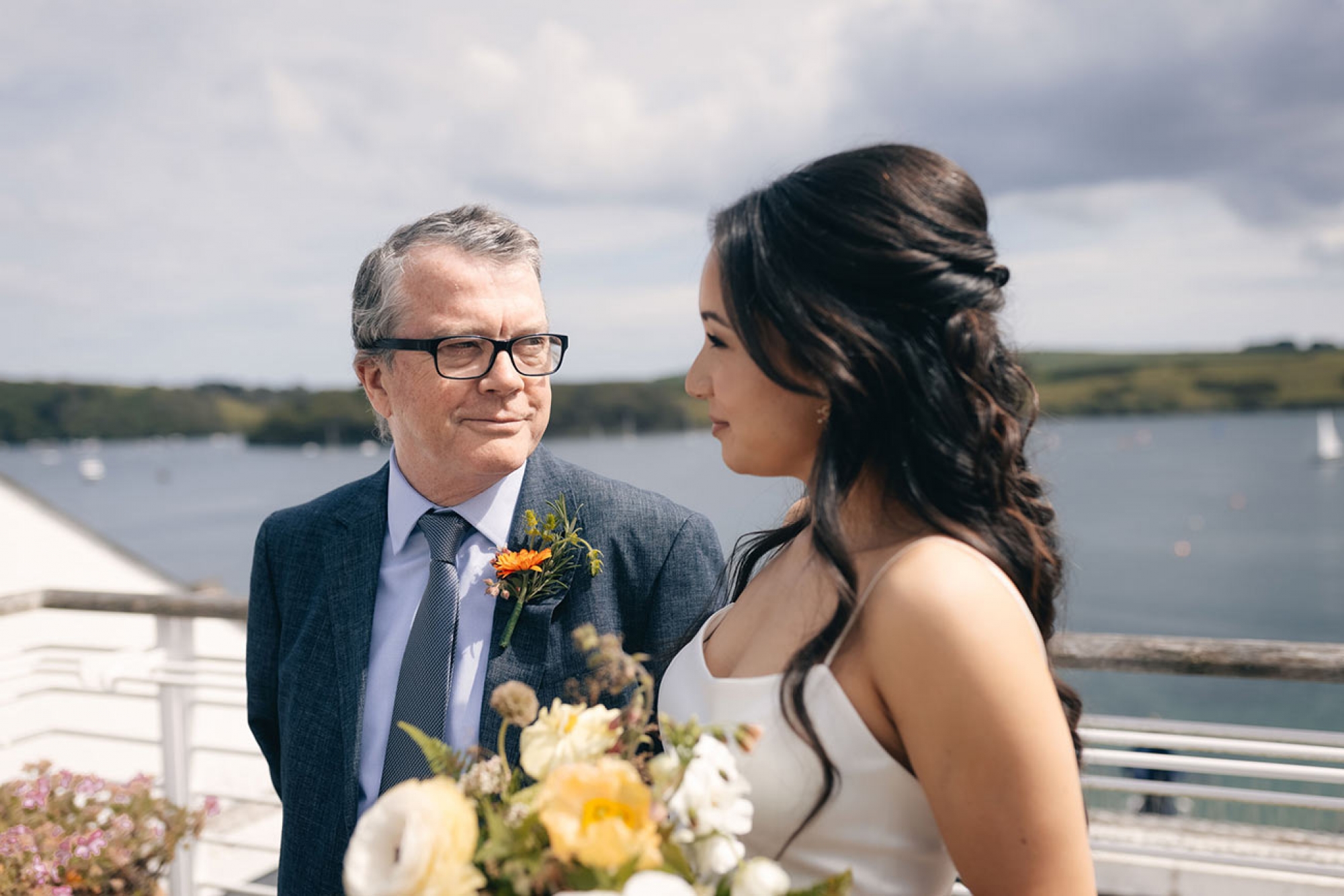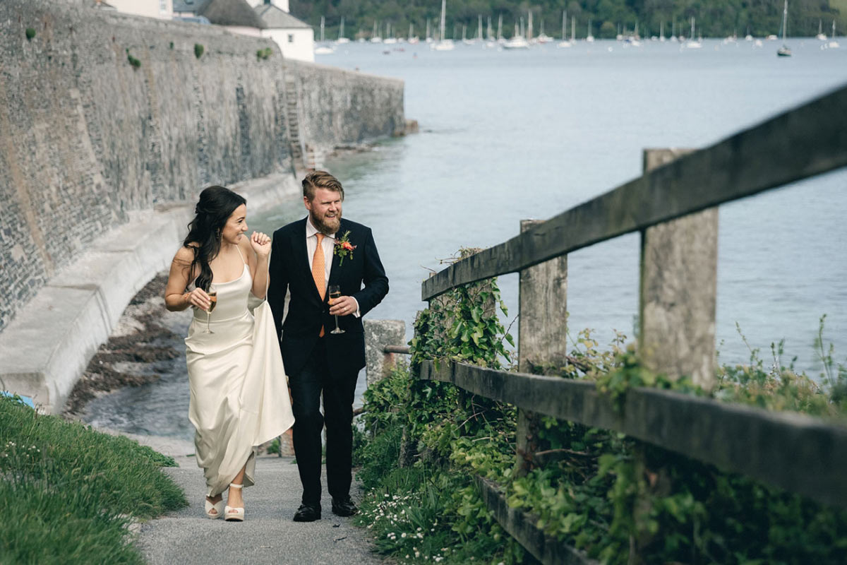 The newly-weds headed off for photos during the waterside drinks reception, returning to tuck into a wedding breakfast of Fal scallops and lobster croquettes, beef fillet and apple tarte Tatin.