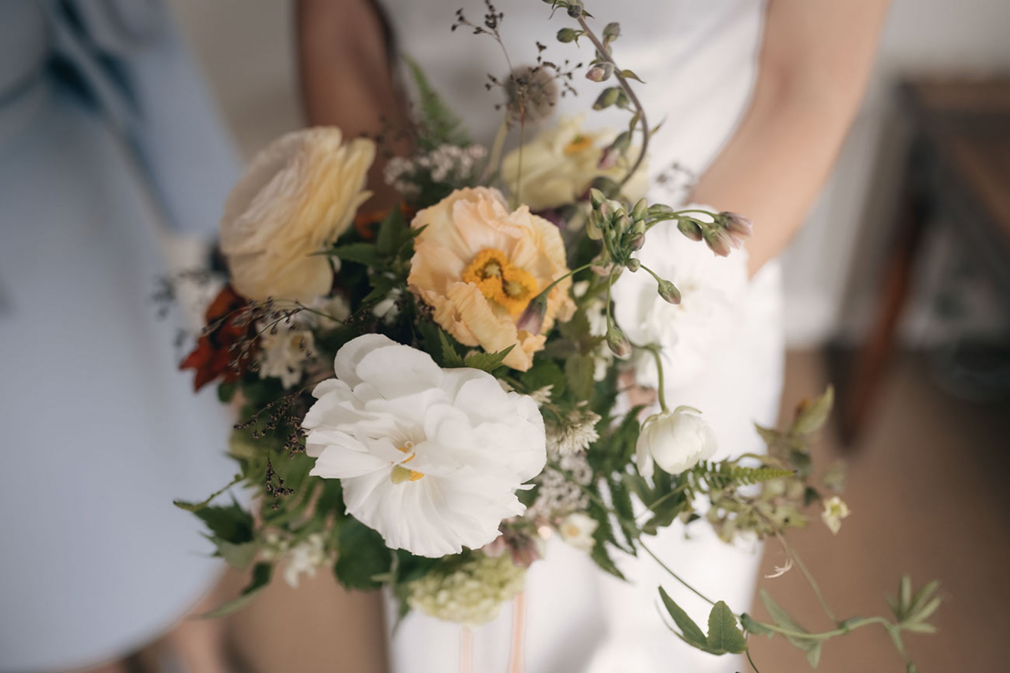For their afternoon ceremony, Hannah slipped into a gorgeously pared back gown while Will’s navy blue suit was punctuated with orange socks and an orange silk tie that complemented the bridal party’s vibrant bouquets.