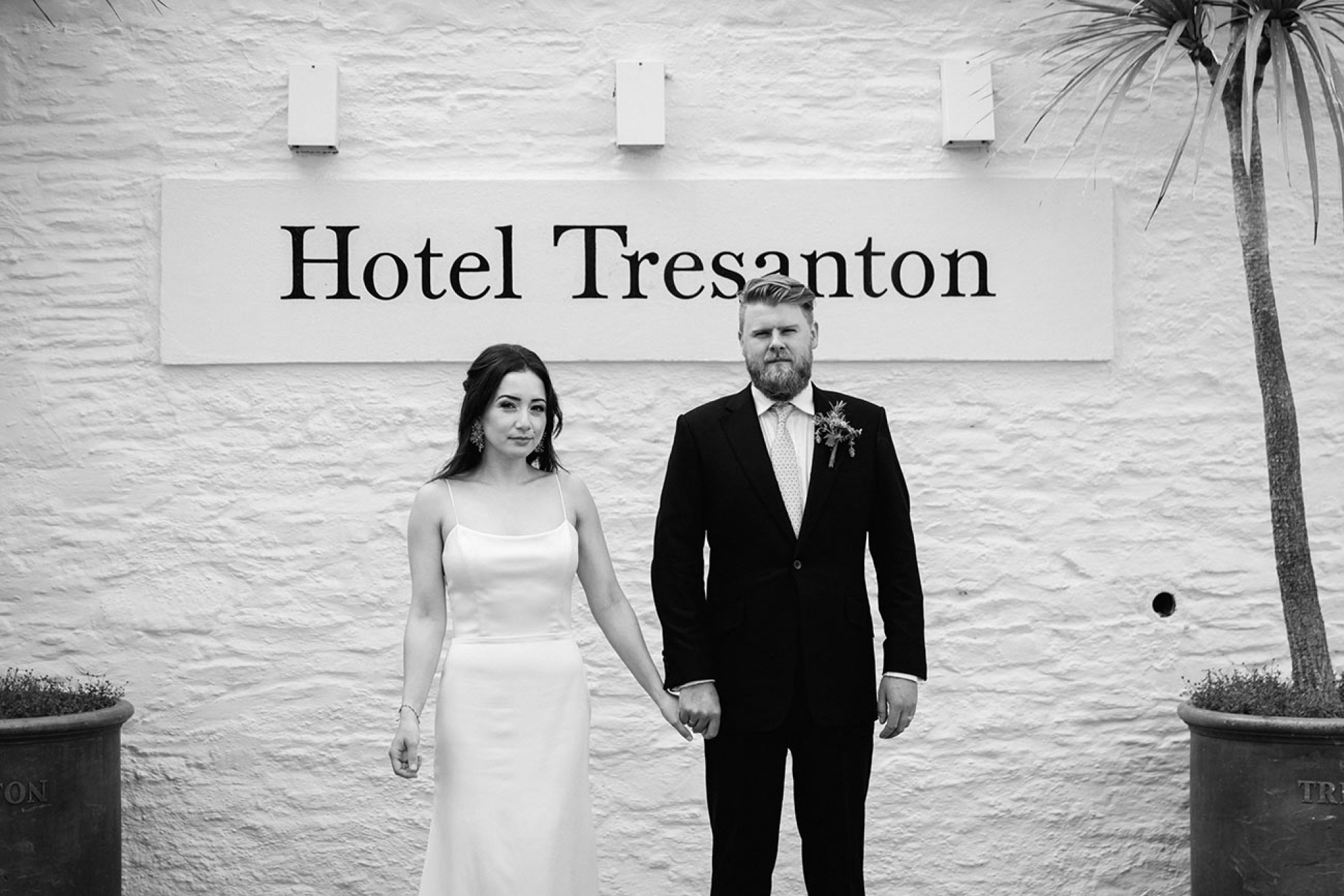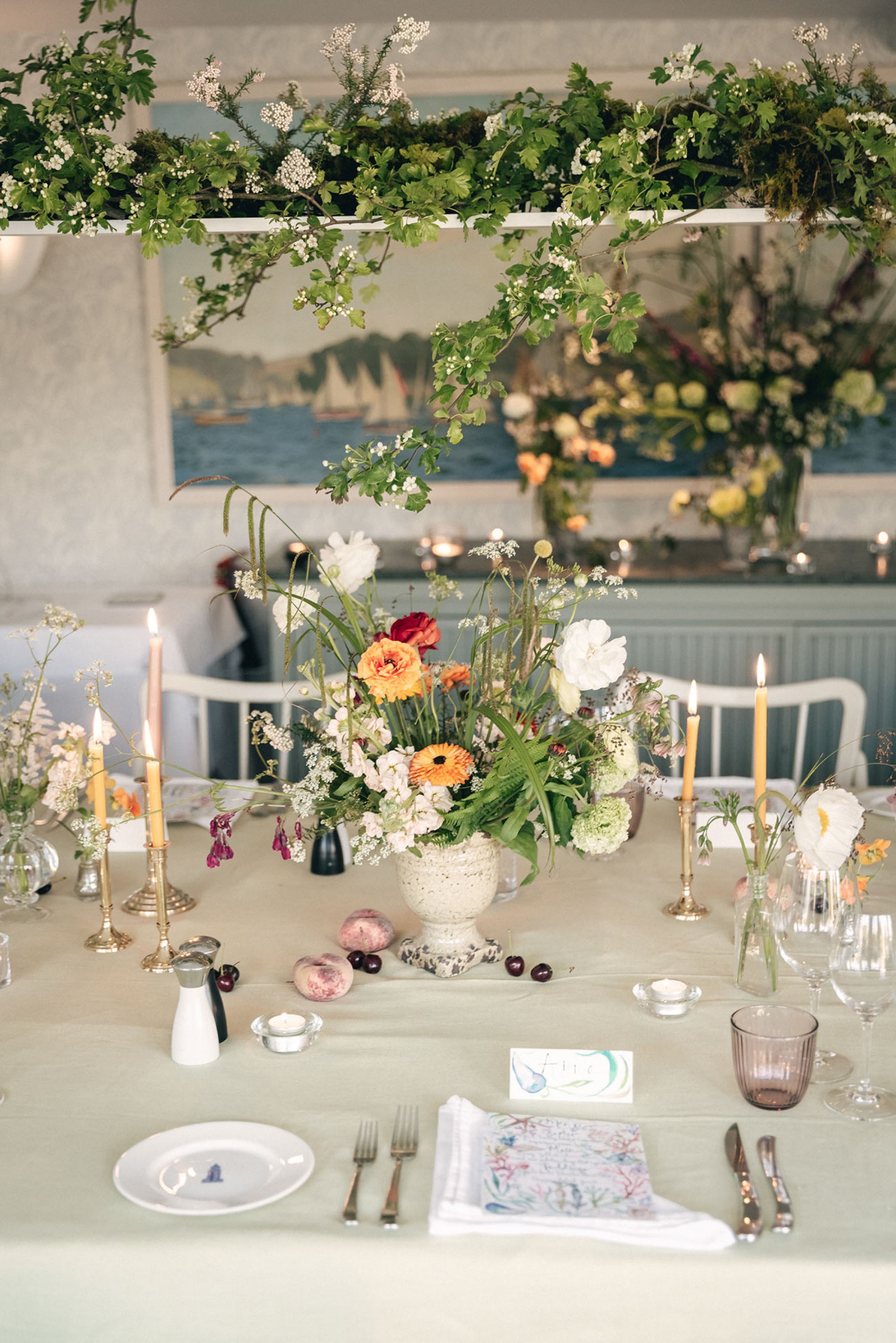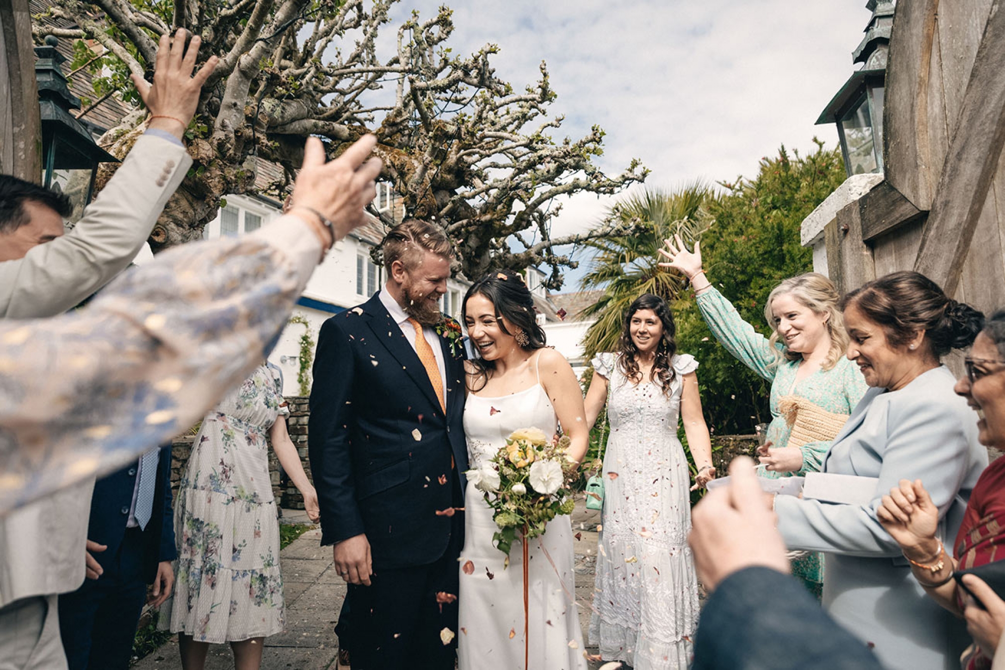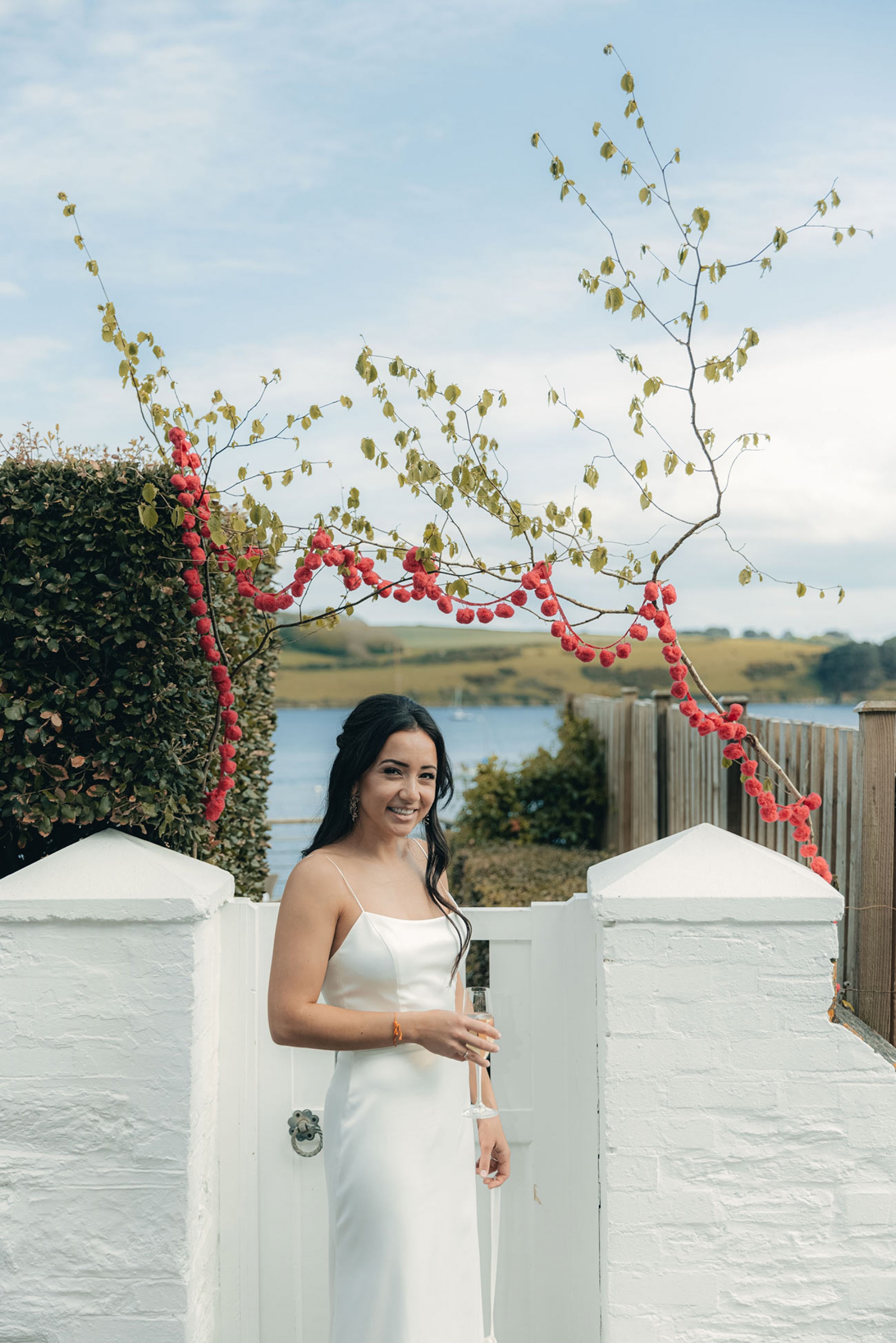 Hotel Tresanton was the venue for their colourful by-the-sea celebrations. “My mum is from India and Will and I had taken a long holiday there not long before we got engaged, so there were elements that were certainly India-inspired: marigolds, orange and pink pom-pom garlands, the mixture of fruit and brassware on the table,” says Hannah.