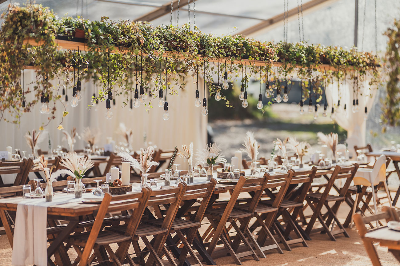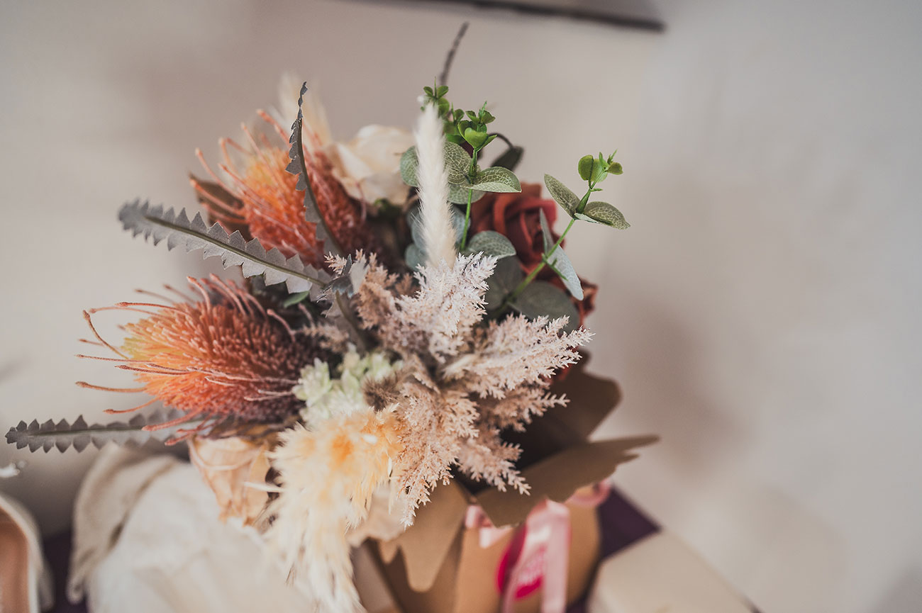 A bohemian theme with an autumnal colour scheme of green, beige and rust orange saw the venue dressed with lots of pampas grass and wildflowers, with hanging plants and lights suspended above the banquet-style tables. Summer’s bouquet featured a mix of flowers including peonies and roses in earthy tones, plus pampas grass, dried elements and proteas, the national flower of South Africa, as a nod to her heritage.