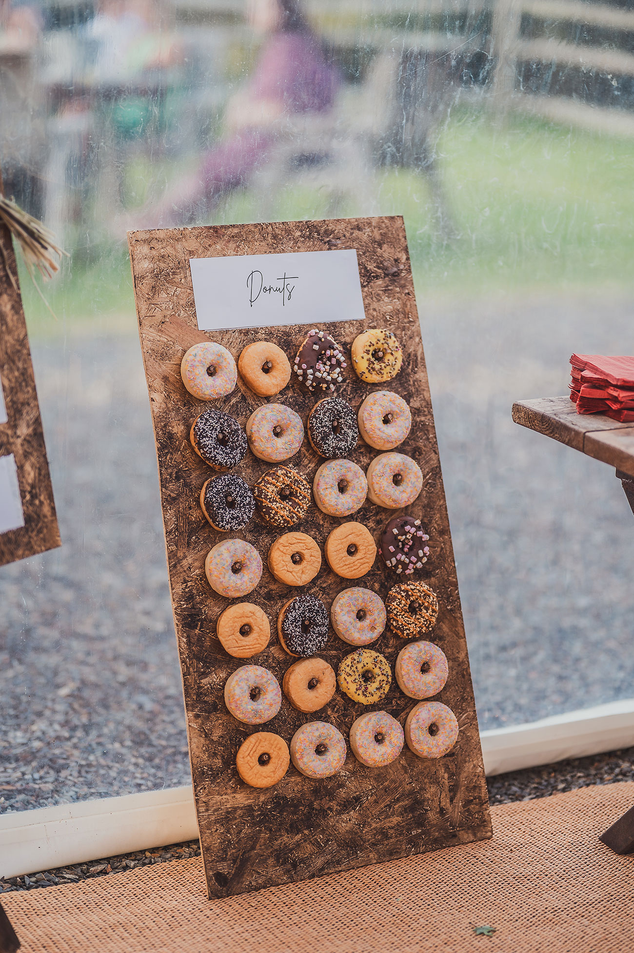 Taking some time away for photos around the picturesque grounds, the newlyweds rejoined the party in time for the reception to begin. Speeches gave way to delicious food including beef and vegan burgers, lentil curry, hot dogs and chicken shawarma, which was rounded out with a dessert table. “We didn’t have a traditional cake and instead went with a doughnut board, cupcakes, brownies and cheesecakes, along with some traditional South African desserts such as koeksisters and peppermint crisp tart,” says Summer.