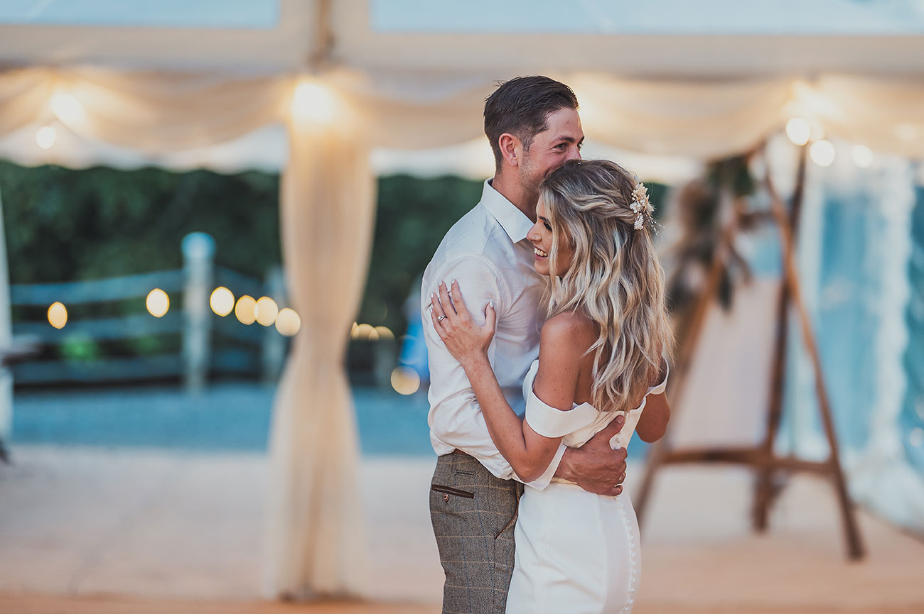 The couple's outdoor ceremony was an intimate affair with 15 guests. “We had Bloom by Paper Kites playing as I walked down the aisle to Dan and our son, Marley, with our daughter Lana as the flower girl,” says Summer, who teamed her off-the-shoulder gown with soft beachy waves and a floral hairpiece made by Dan’s mum. “All my nerves left my body and a wave of calm washed over me. Looking at Dan waiting for me at the end of the aisle, with Marley smiling at me too – everything felt perfect.” she reflects.