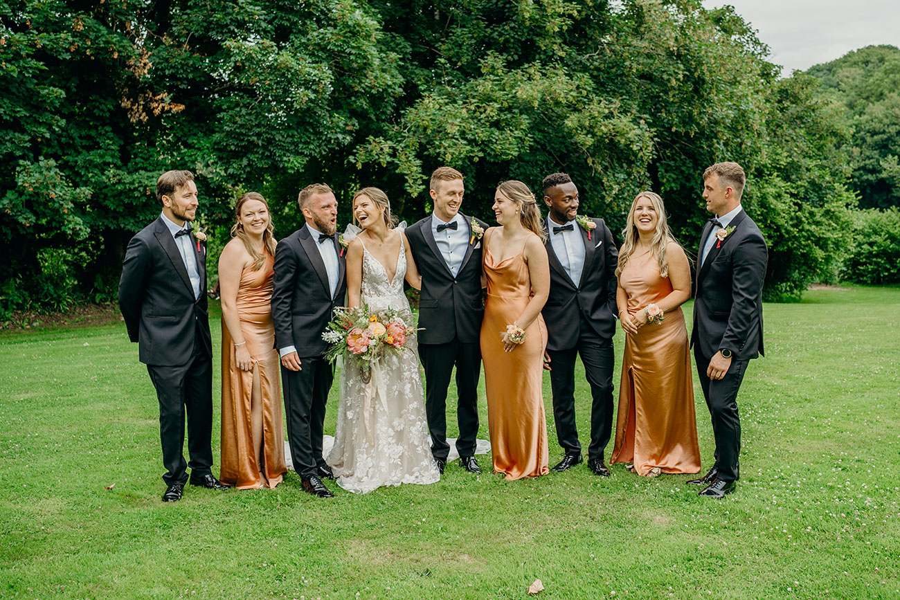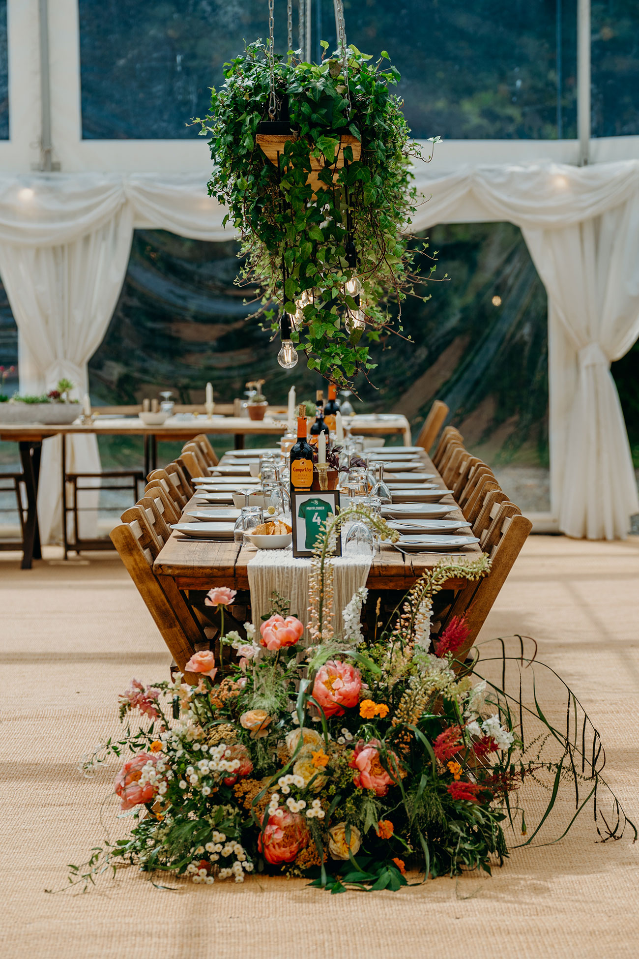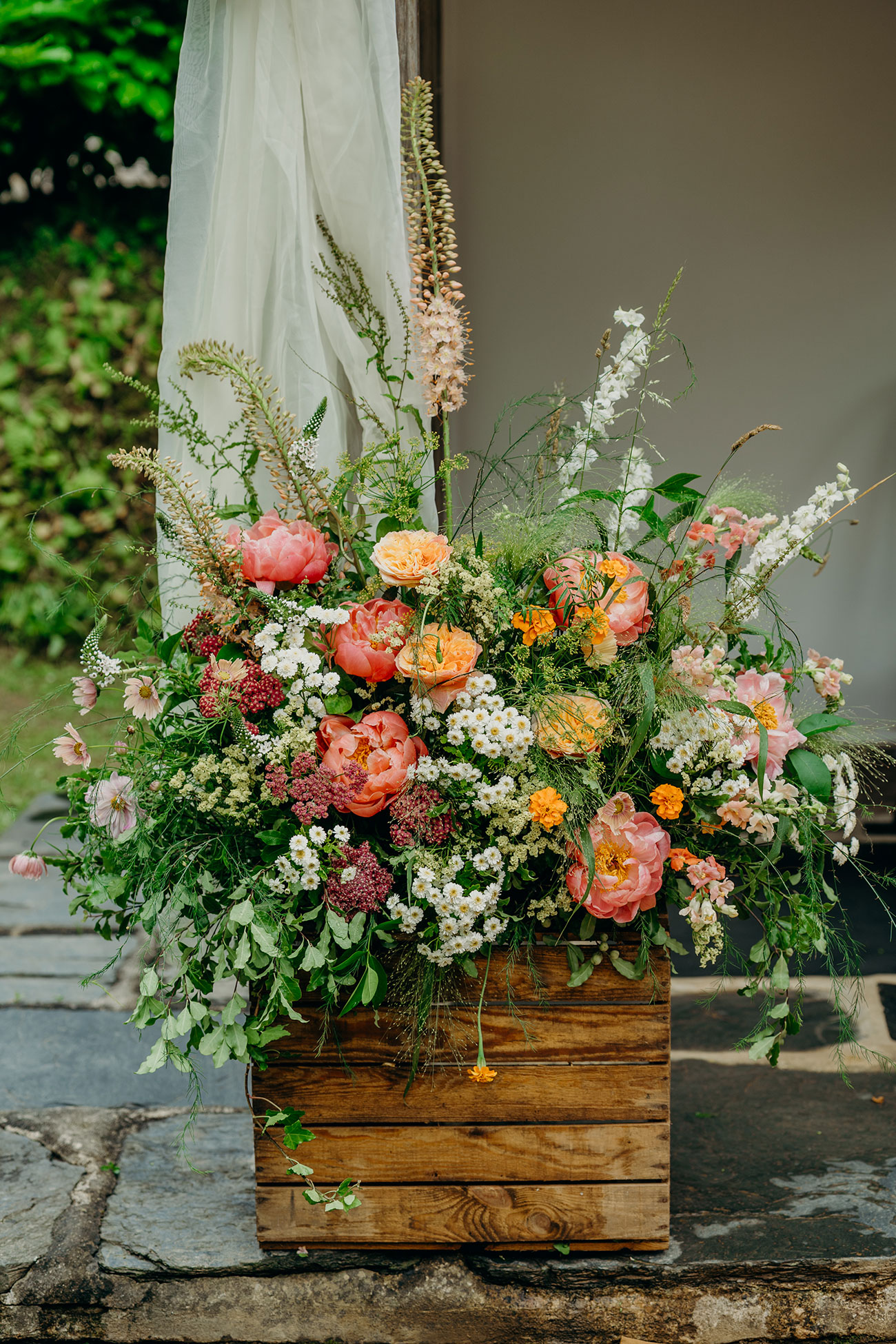 The secluded country estate of Kilminorth was the perfect backdrop for a relaxed, weekend-long summer gathering. The aesthetic was effortlessly chic, defined by warm tones of orange, soft pink, yellow, rust and green. “You could call our colour scheme ‘summer sorbet’,” says Hannah. “We didn’t want much fuss – we just wanted the day to truly reflect our spirits.” Seasonal florals carried the palette beautifully, with abundant arrangements of textured blooms and blousy peonies adding a romantic softness to the setting.