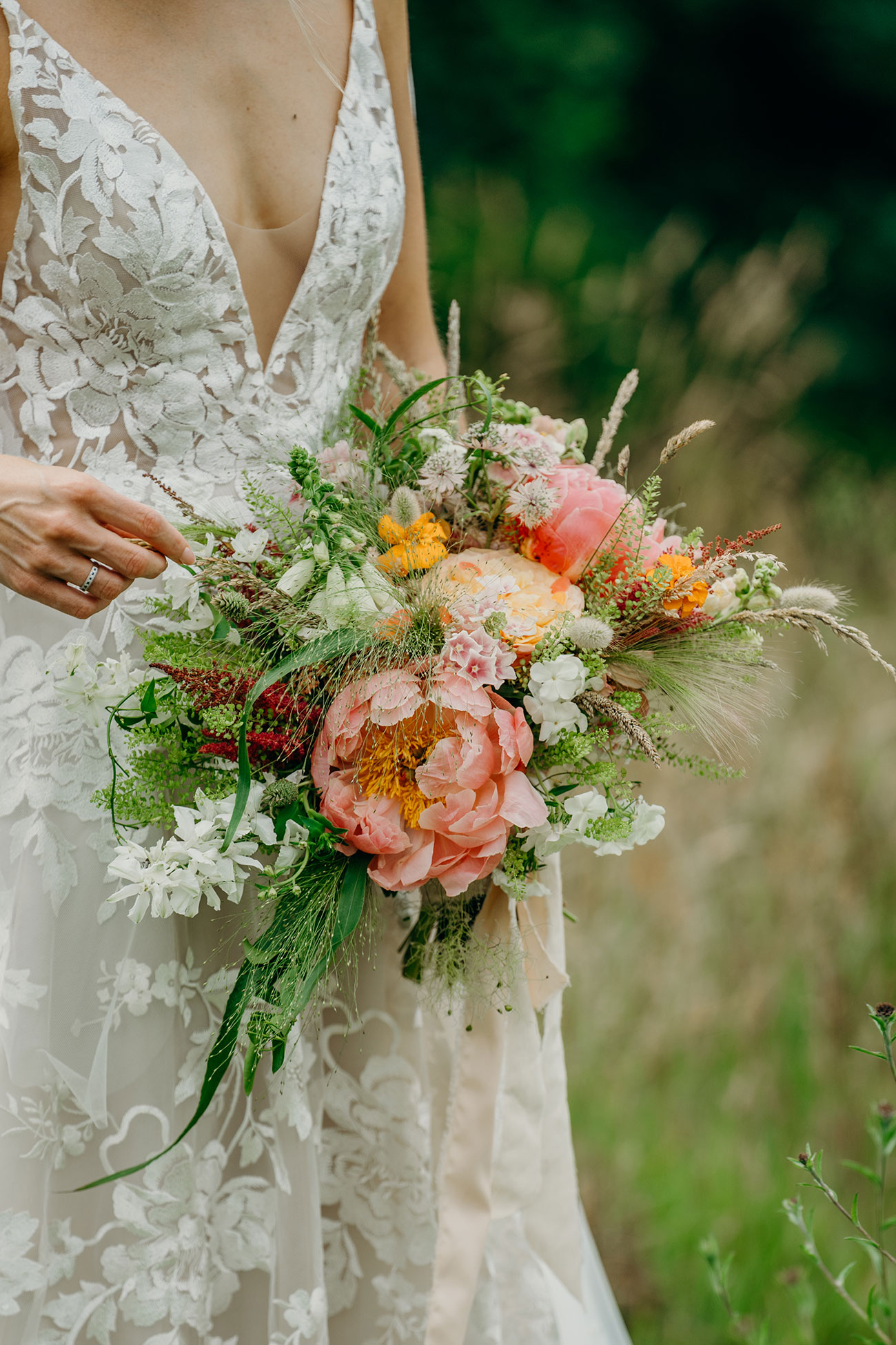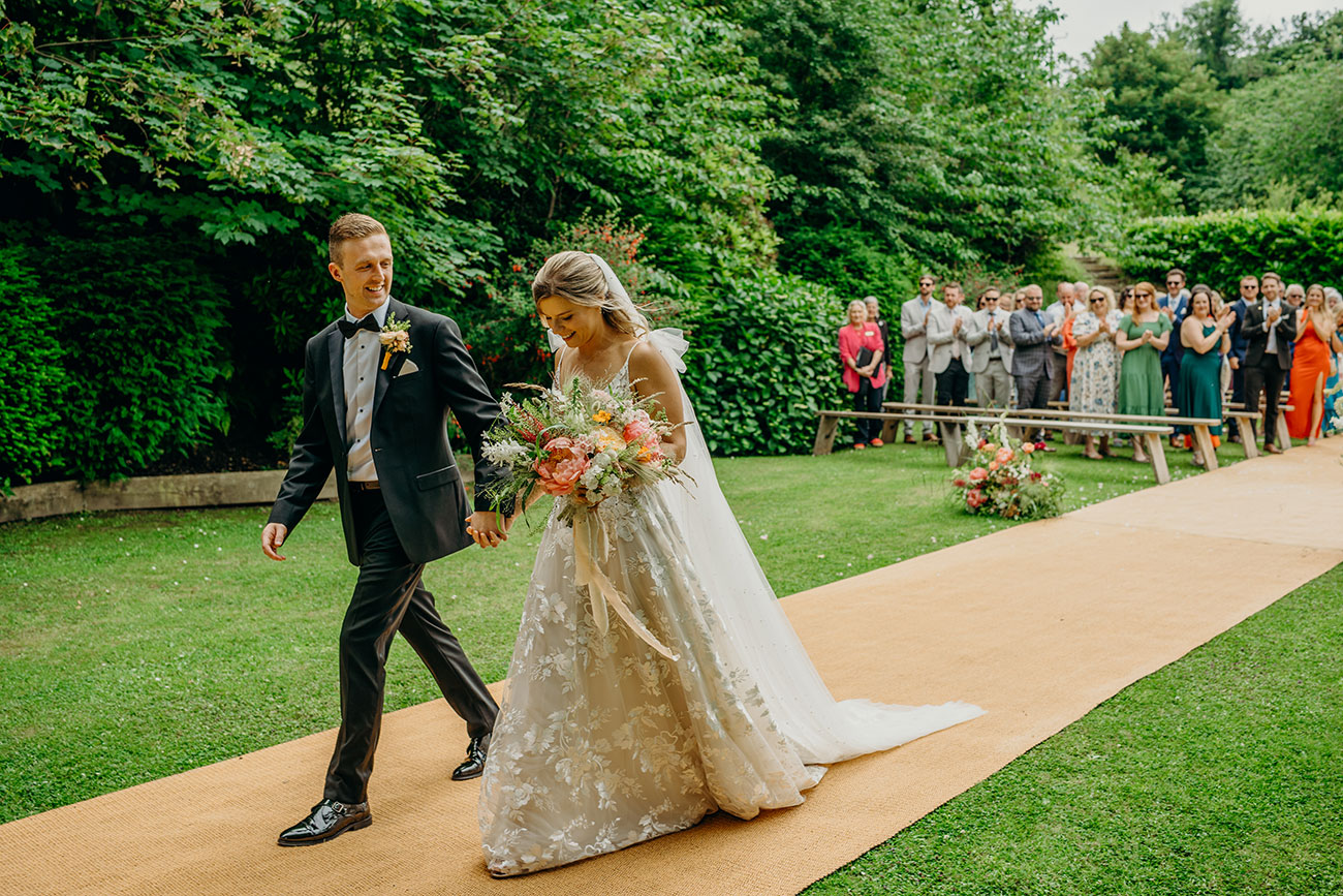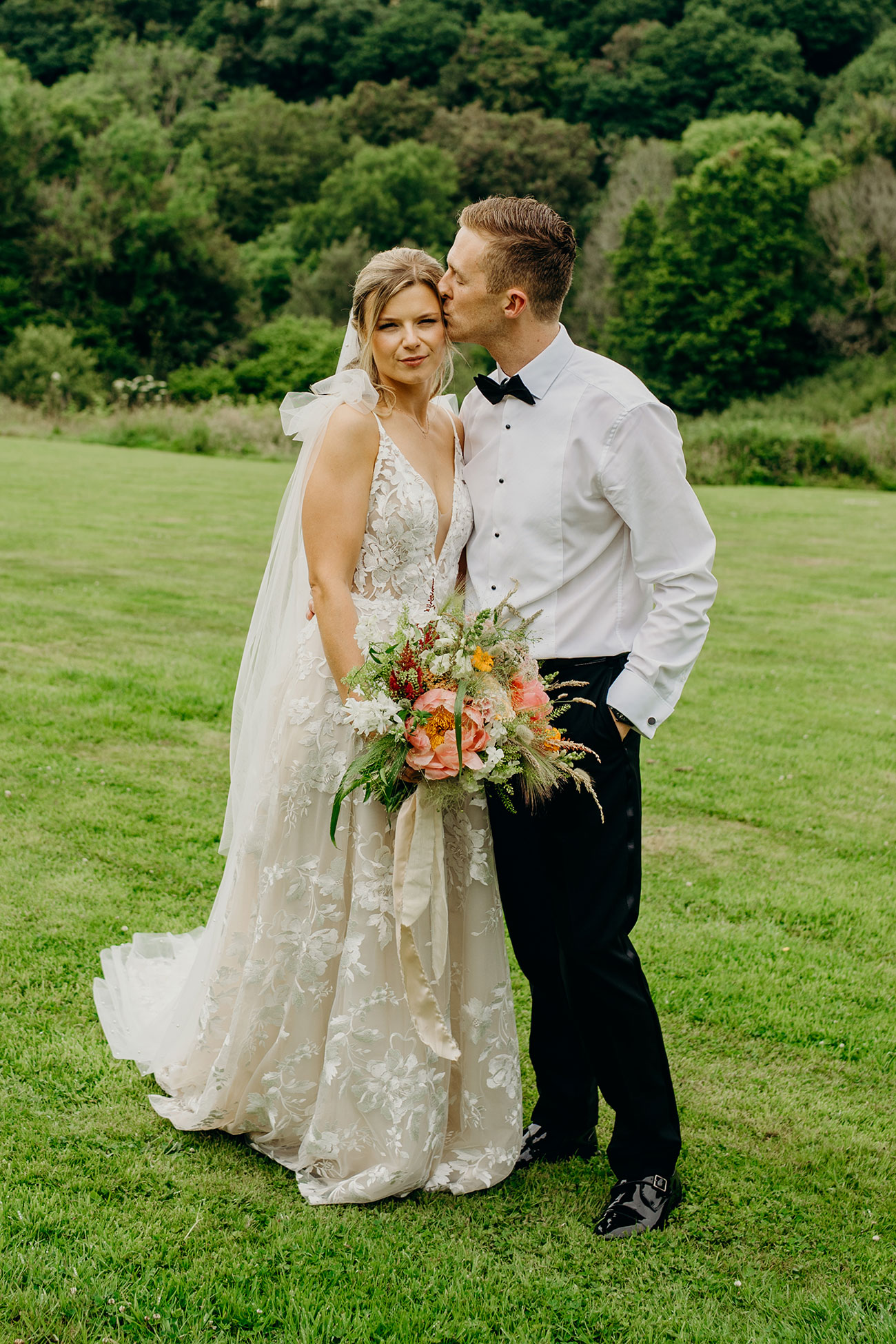 The secluded country estate of Kilminorth was the perfect backdrop for a relaxed, weekend-long summer gathering. The aesthetic was effortlessly chic, defined by warm tones of orange, soft pink, yellow, rust and green. “You could call our colour scheme ‘summer sorbet’,” says Hannah. “We didn’t want much fuss – we just wanted the day to truly reflect our spirits.” Seasonal florals carried the palette beautifully, with abundant arrangements of textured blooms and blousy peonies adding a romantic softness to the setting.