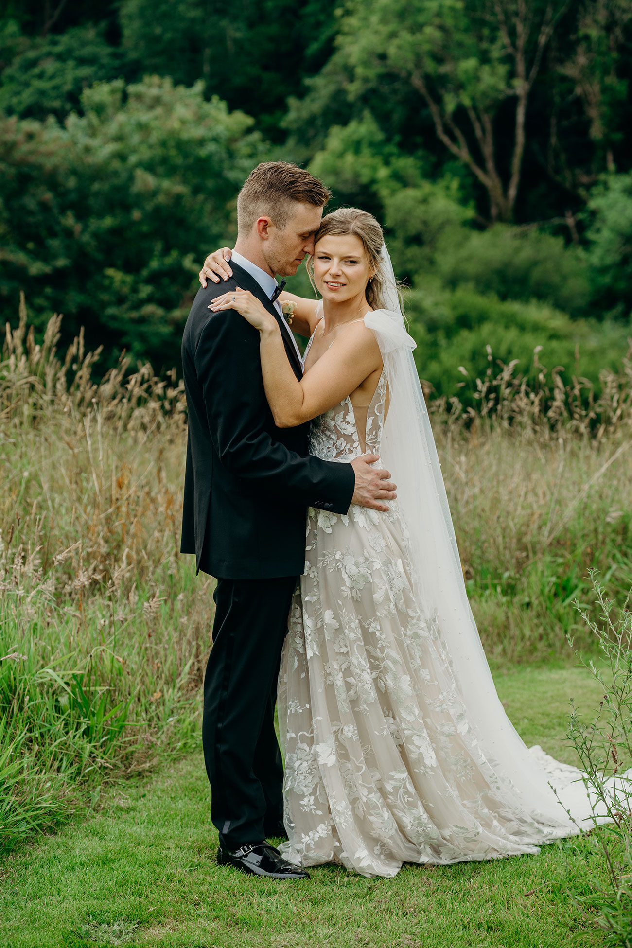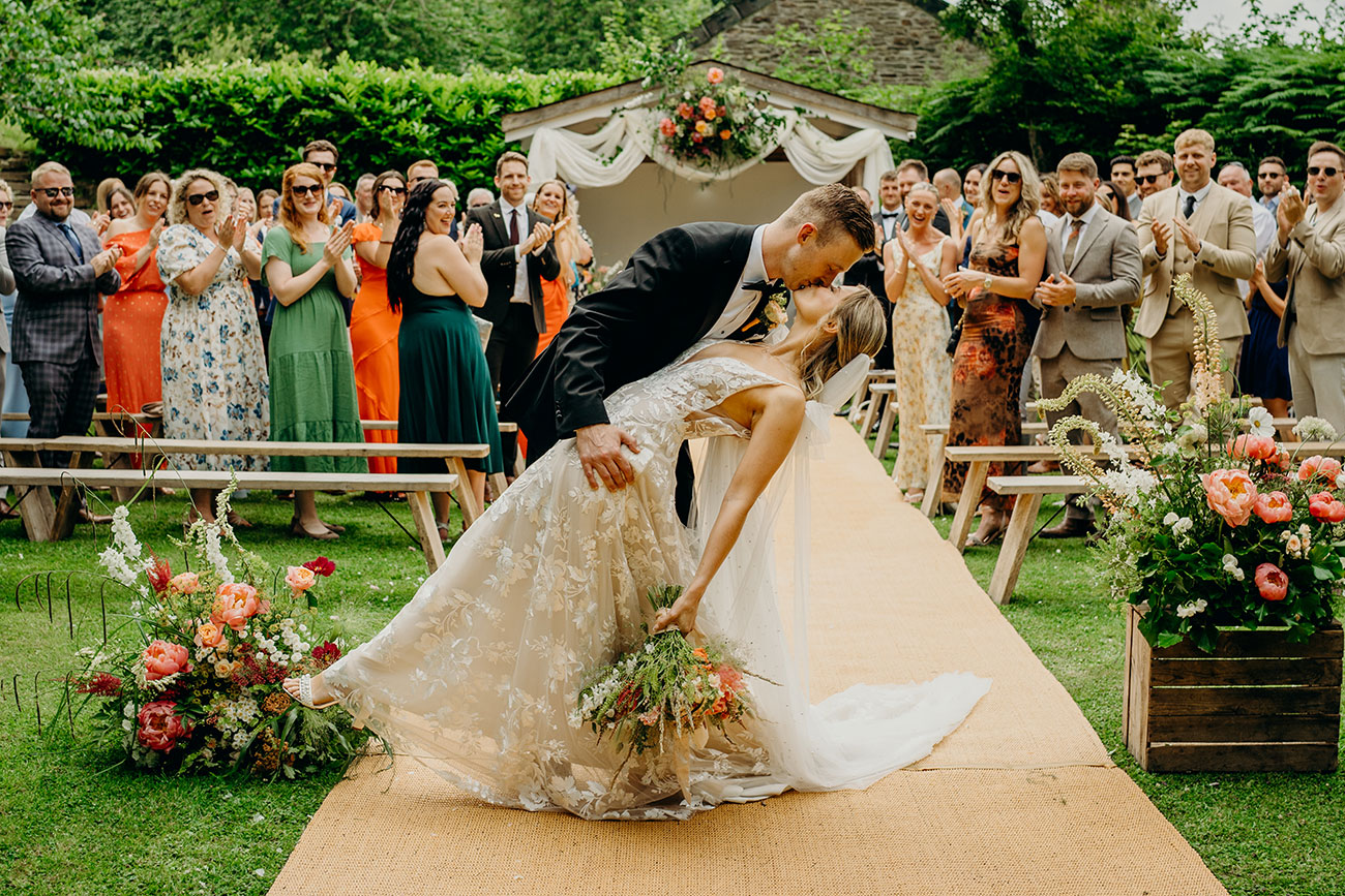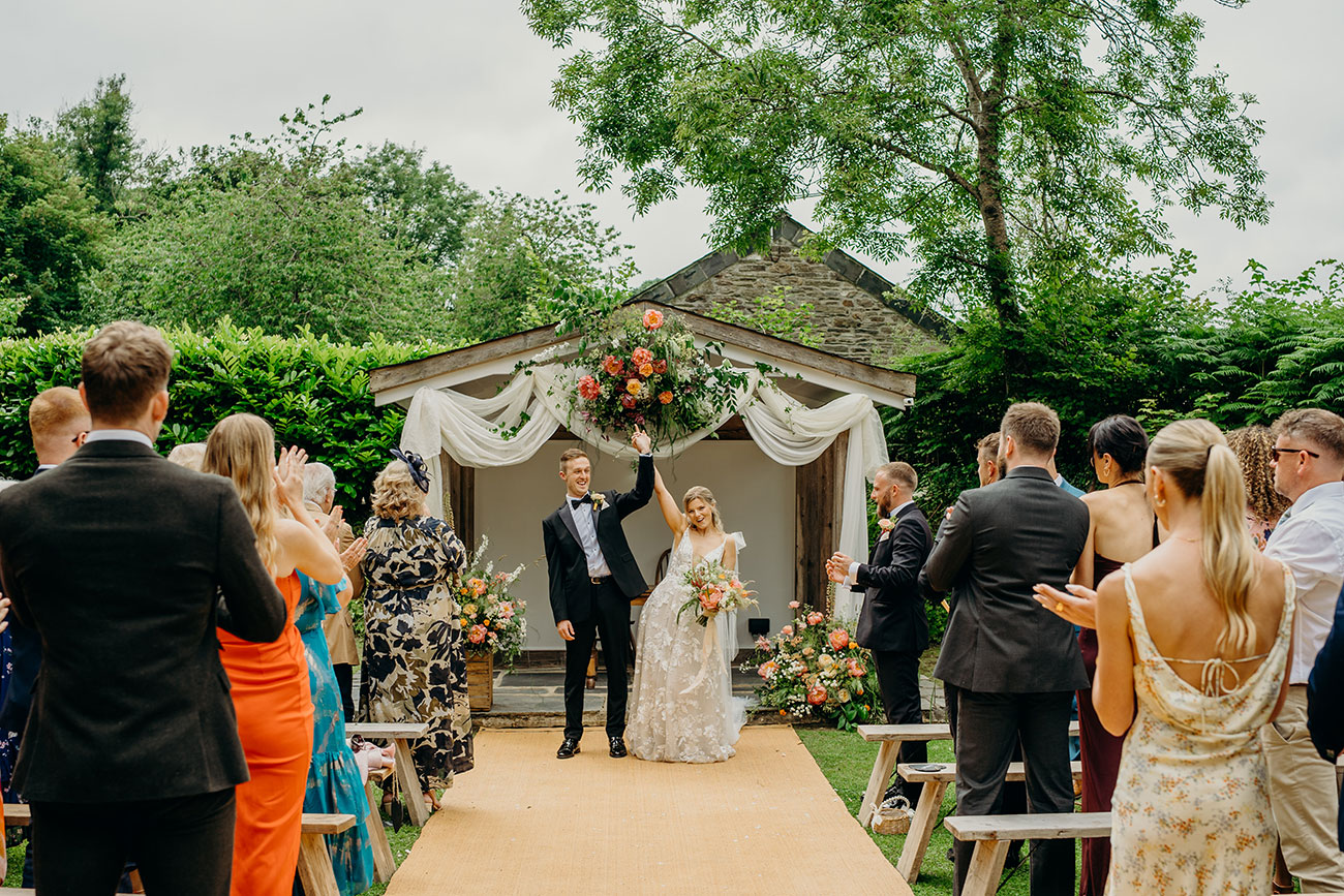 Festivities began on the Friday evening – pizzas, a quiz and a soak in the cottage hot tubs setting the tone for the weekend ahead.The wedding day itself dawned misty, but the skies cleared just in time for Hannah and George to exchange vows in the outdoor Chy Hos space. Dressed with flowing drapes, grasses and colourful summer blooms, it was a beautifully romantic setting. “I walked down the aisle with my grandad and mum to All of Me by John Legend,” says Hannah of her favourite moment of the day. “Seeing everyone there and George waiting at the front – that was magical.” The ceremony featured handwritten vows and a reading penned by the couple, inspired by their shared love of the film Interstellar.