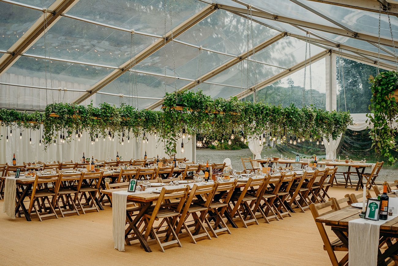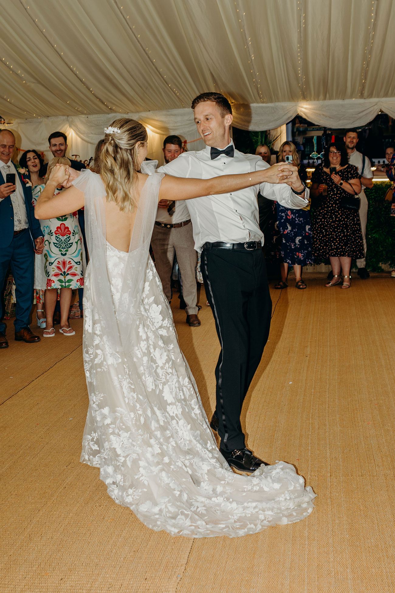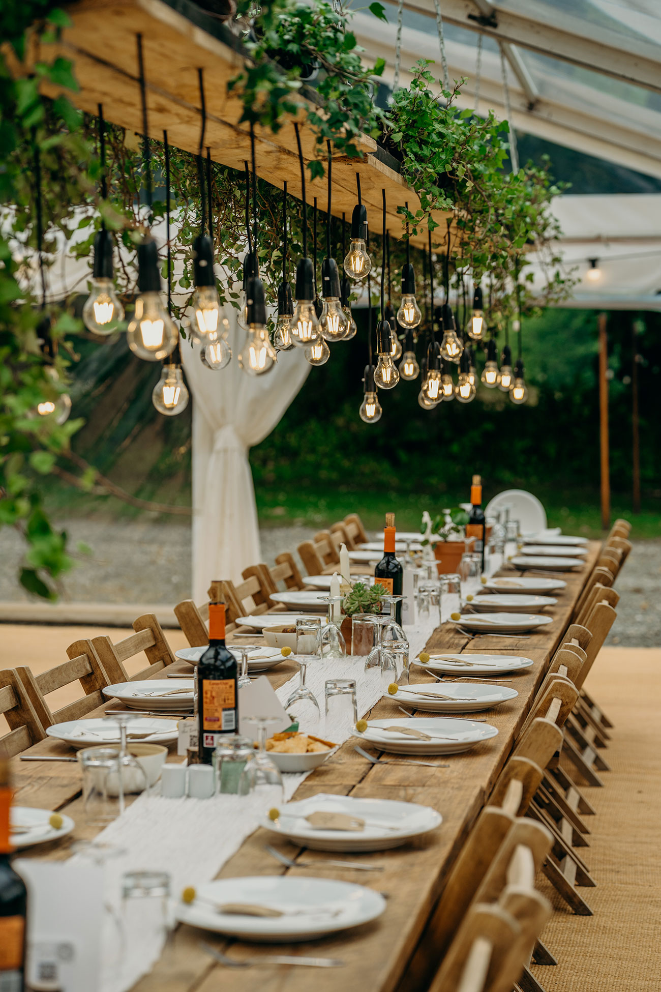 After the vows, the newlyweds slipped away for photos while guests enjoyed canapés, drinks and live music. Celebrations then moved into the marquee for a feast of relaxed sharing boards – from chicken thigh shawarma and slow-cooked beef brisket to falafel, flatbreads and Greek salad. As dusk fell, live band The Busketeers filled the dance floor, before a silent disco kept revellers partying into the early hours.