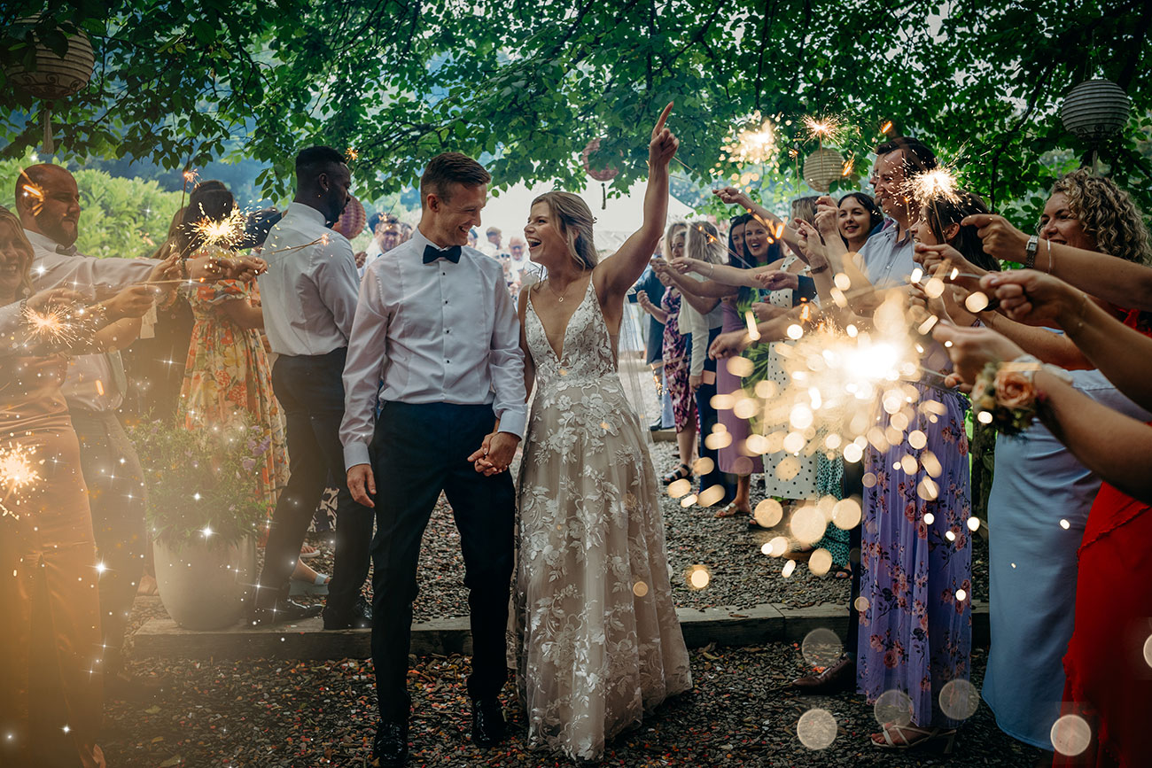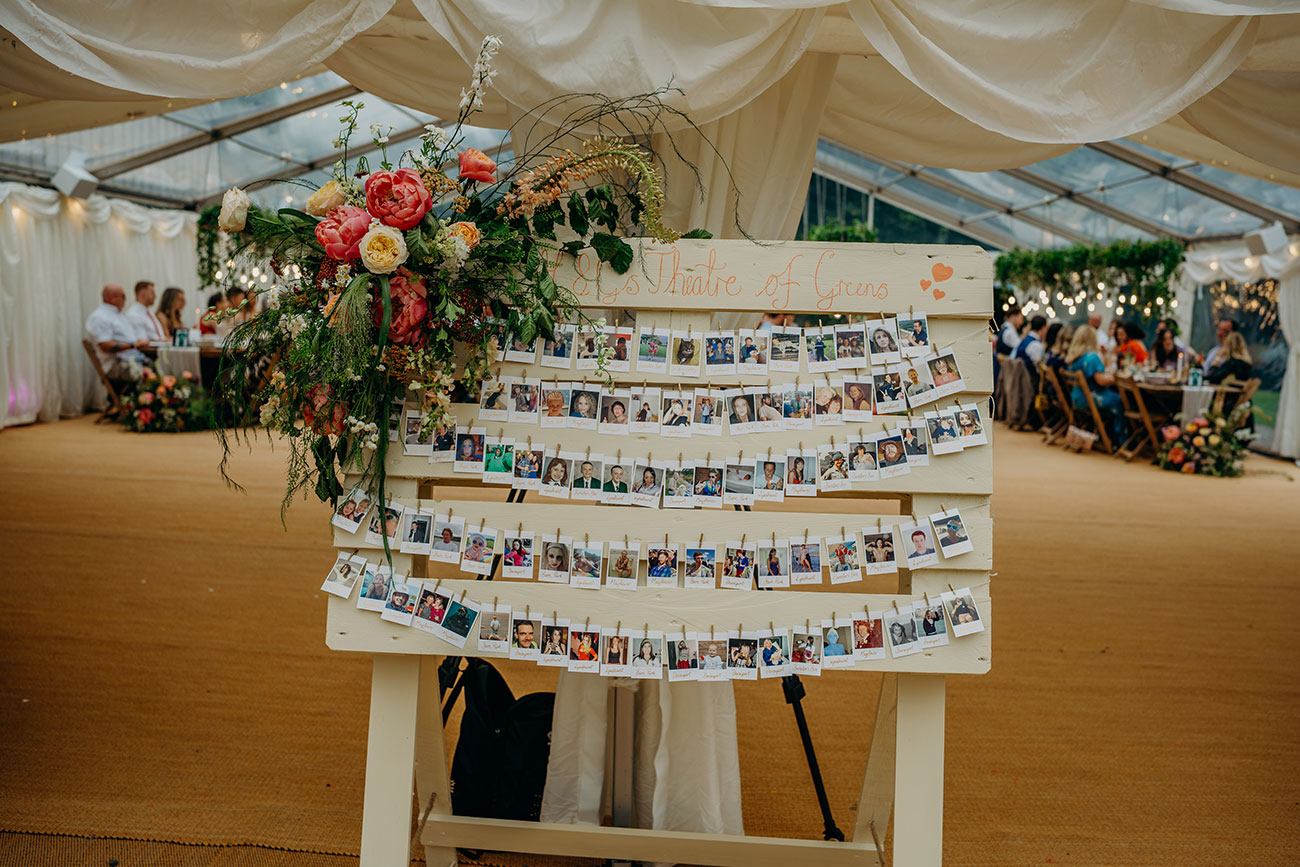 Much of the décor was sourced and created by the couple themselves, including a DIY photo booth, a crowd-pleasing Aperol Spritz bar and a seating plan crafted from a wooden pallet and adorned with photos of every guest.