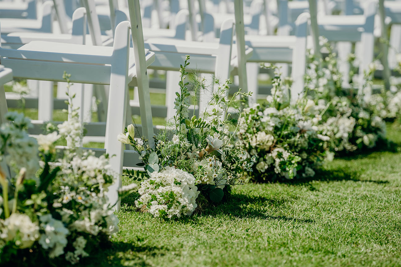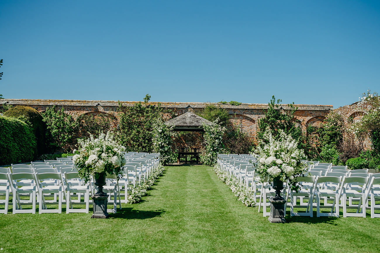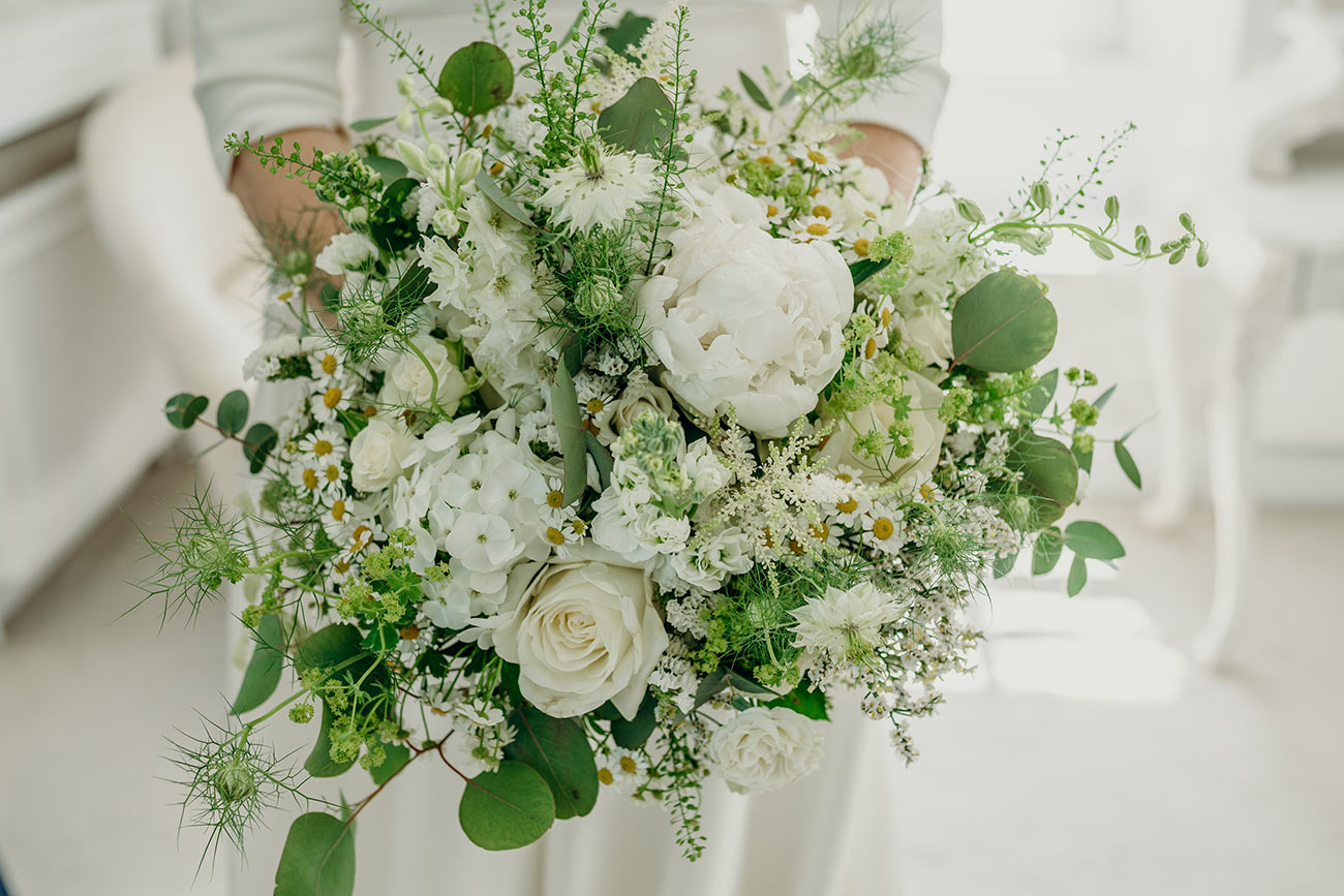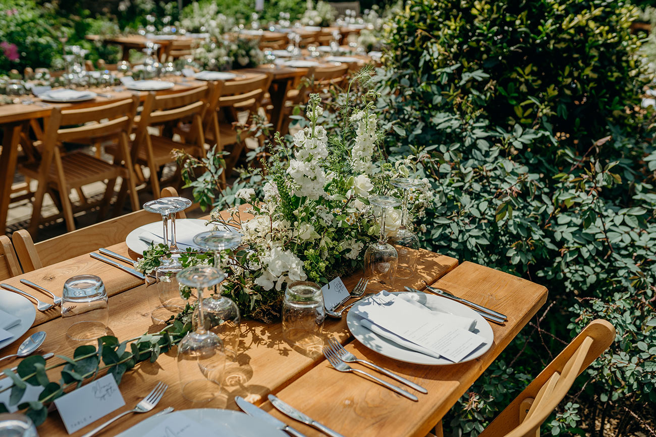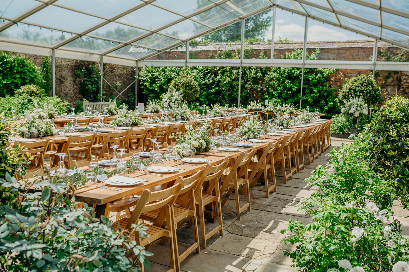 Choosing a palette of white, cream and green, bountiful arrangements of blooms and foliage complemented the garden setting perfectly, lining the aisle, adorning the ceremony arbor and decorating the trestle tables of the glass house where the wedding feast took place.