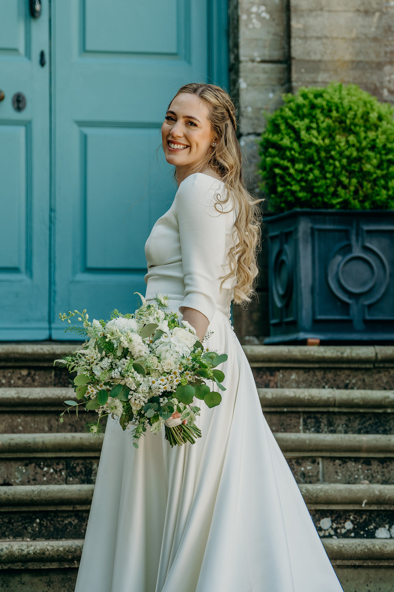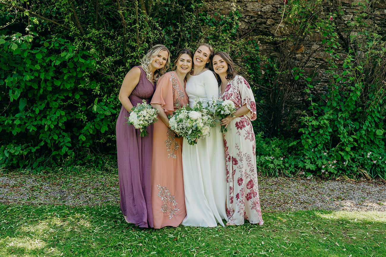 Flanked by her bridesmaids donning mismatched dresses in summery hues, Valentina teamed her elegant Jesus Peiro gown with relaxed waves at her shoulders and a stunning bouquet of creamy florals and foliage for the garden ceremony.