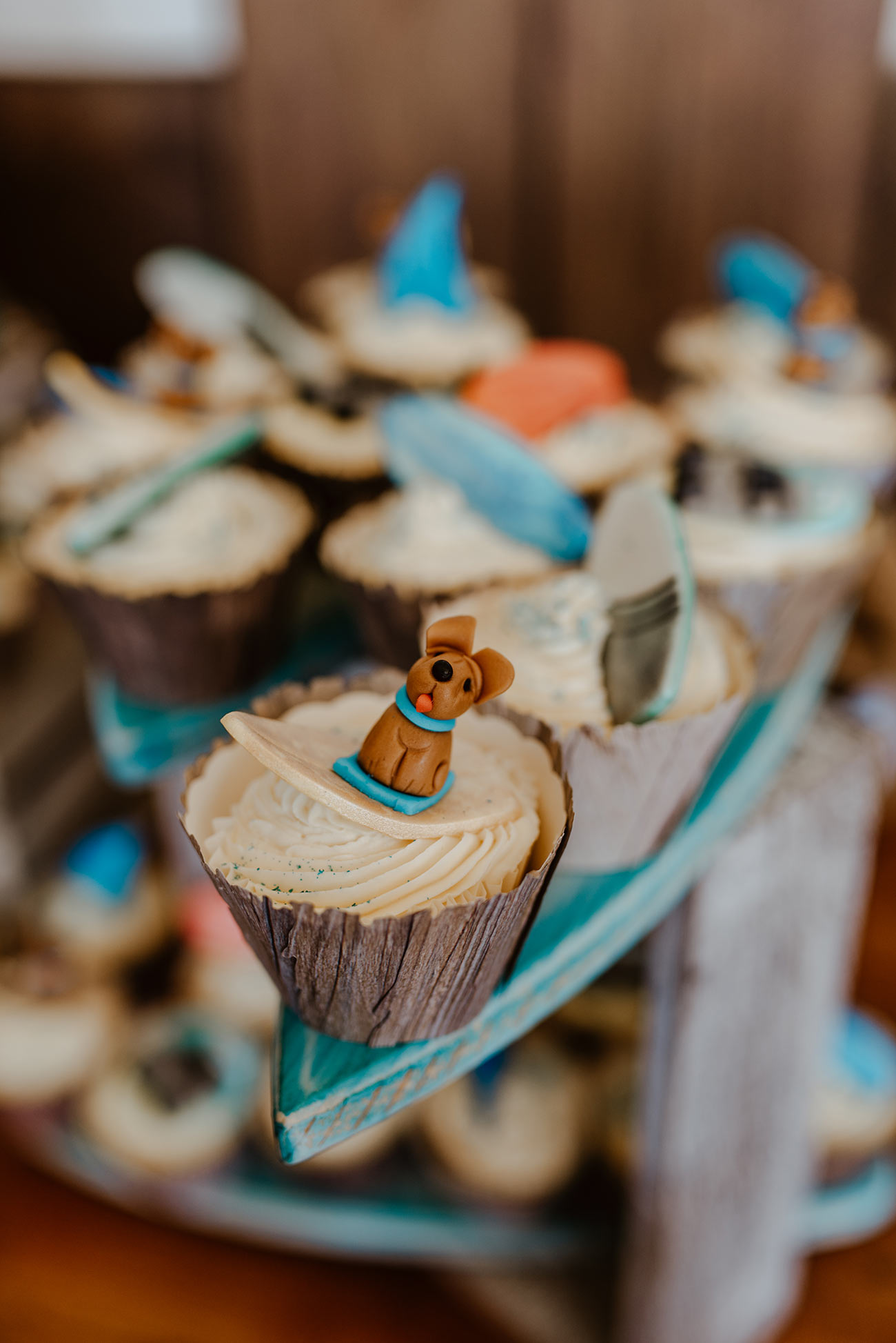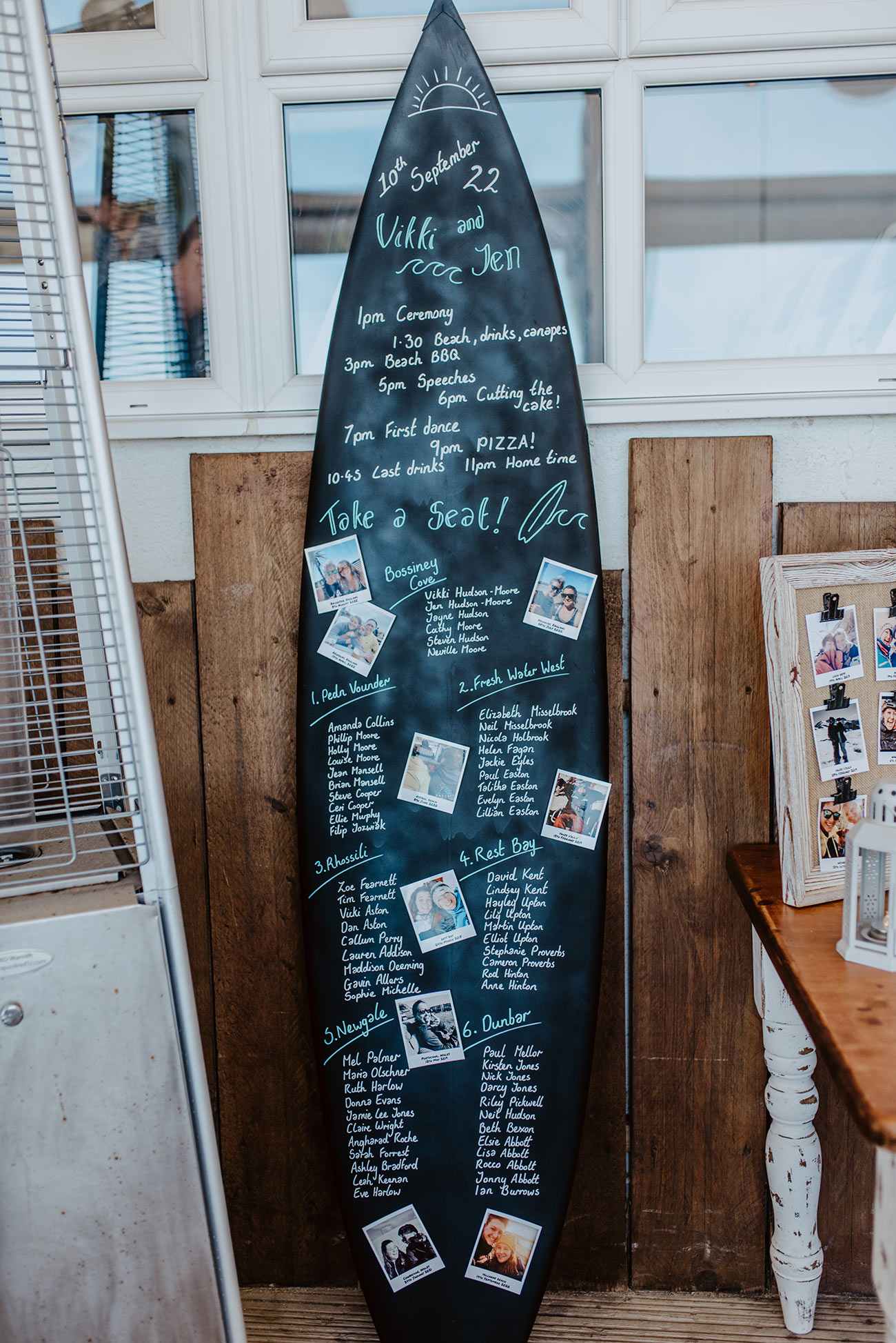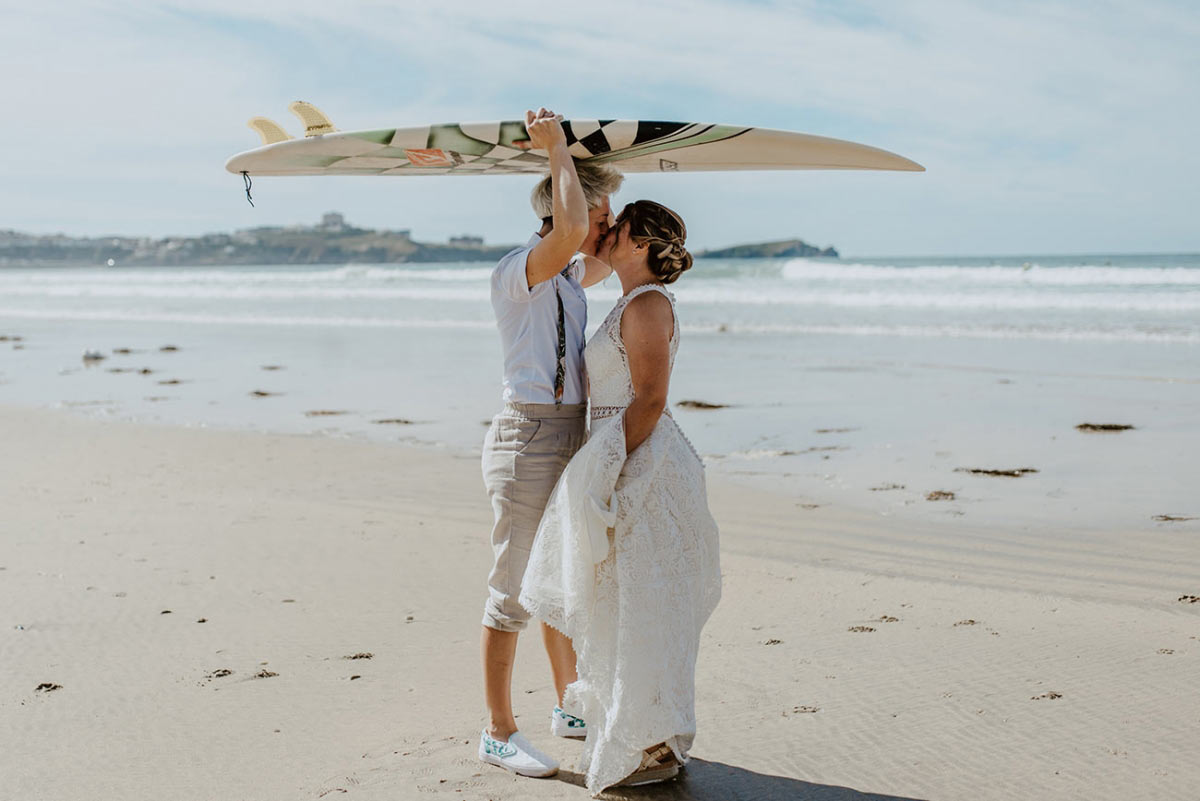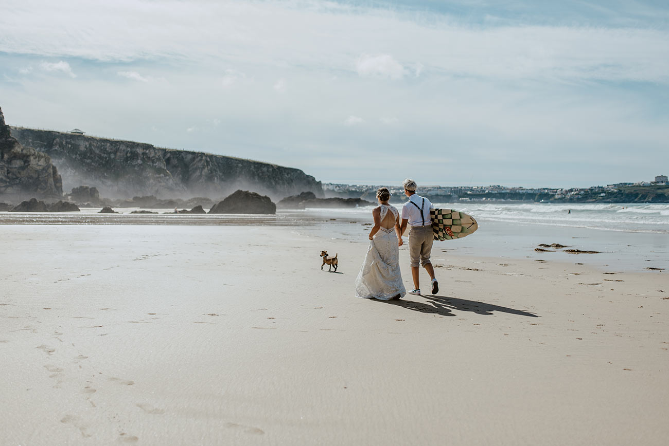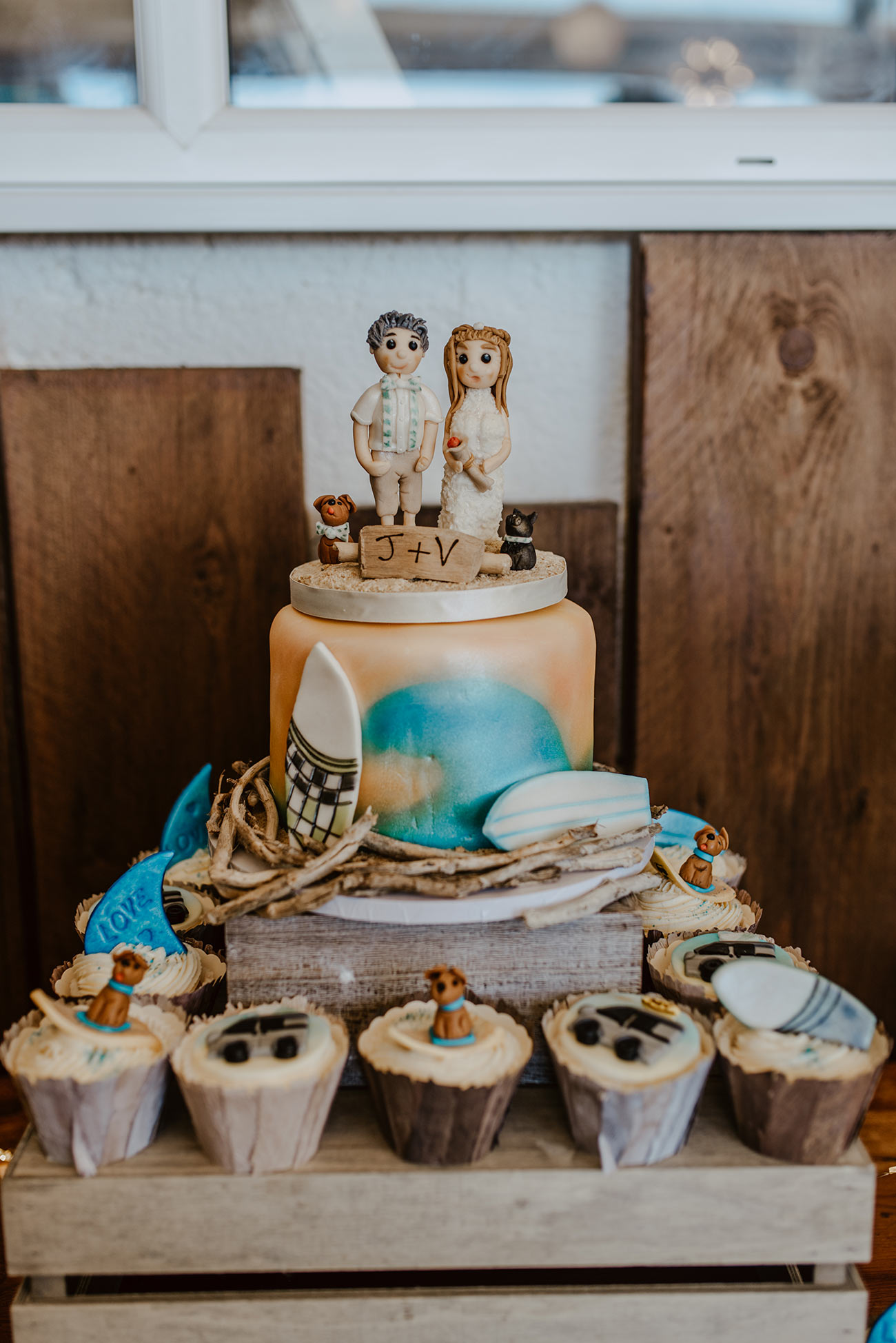 After the vows, everyone made the most of the coastal location, spilling onto the sand for mojitos and canapés before a 'surf and turf' beach barbecue with steak and grilled prawns. An “amazing” cake made by Jen’s mum and auntie was complemented by cupcakes that featured their dog, surfboards and “Kev, our trusty camper”, which were enjoyed before photos on the beach – and in the sea!