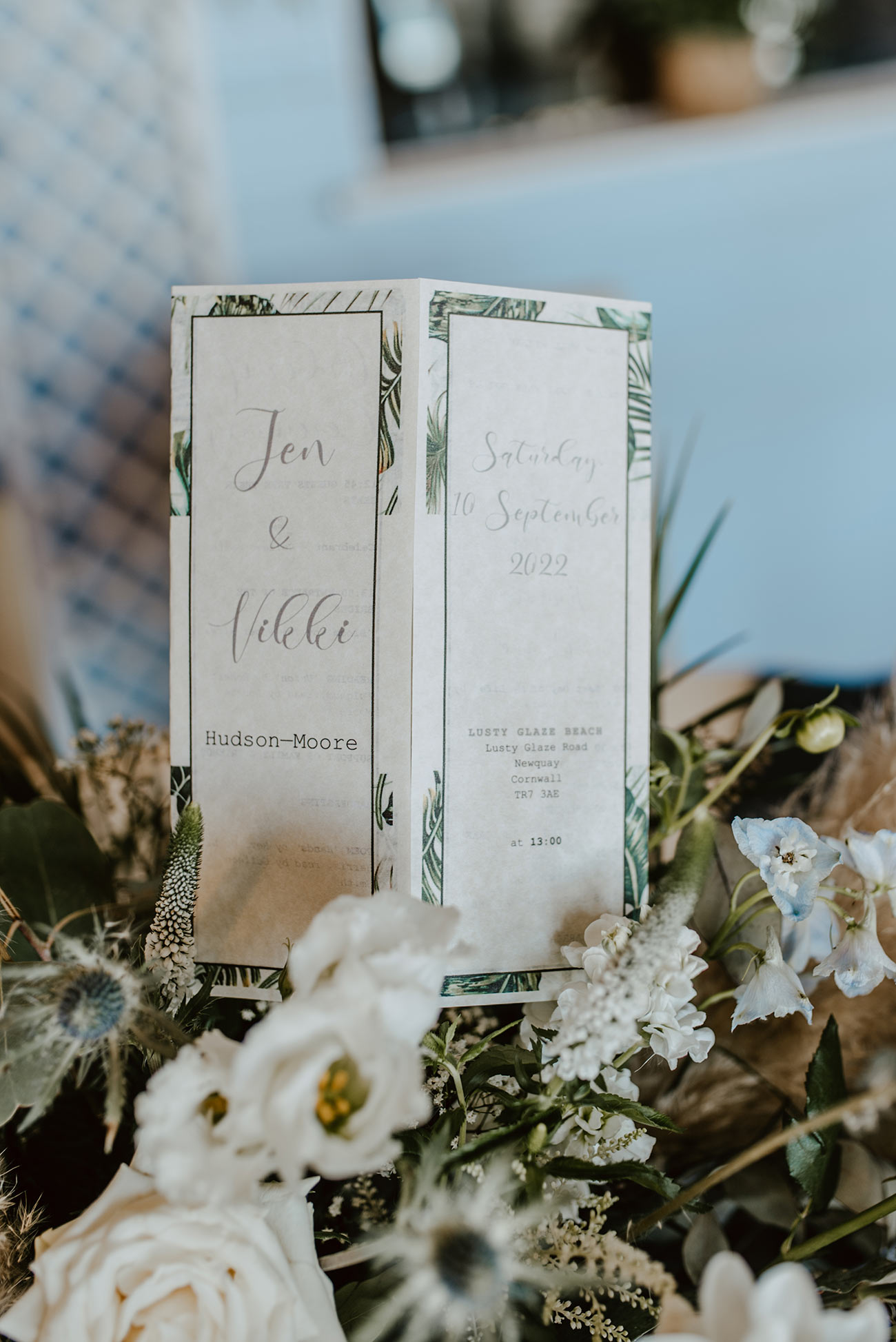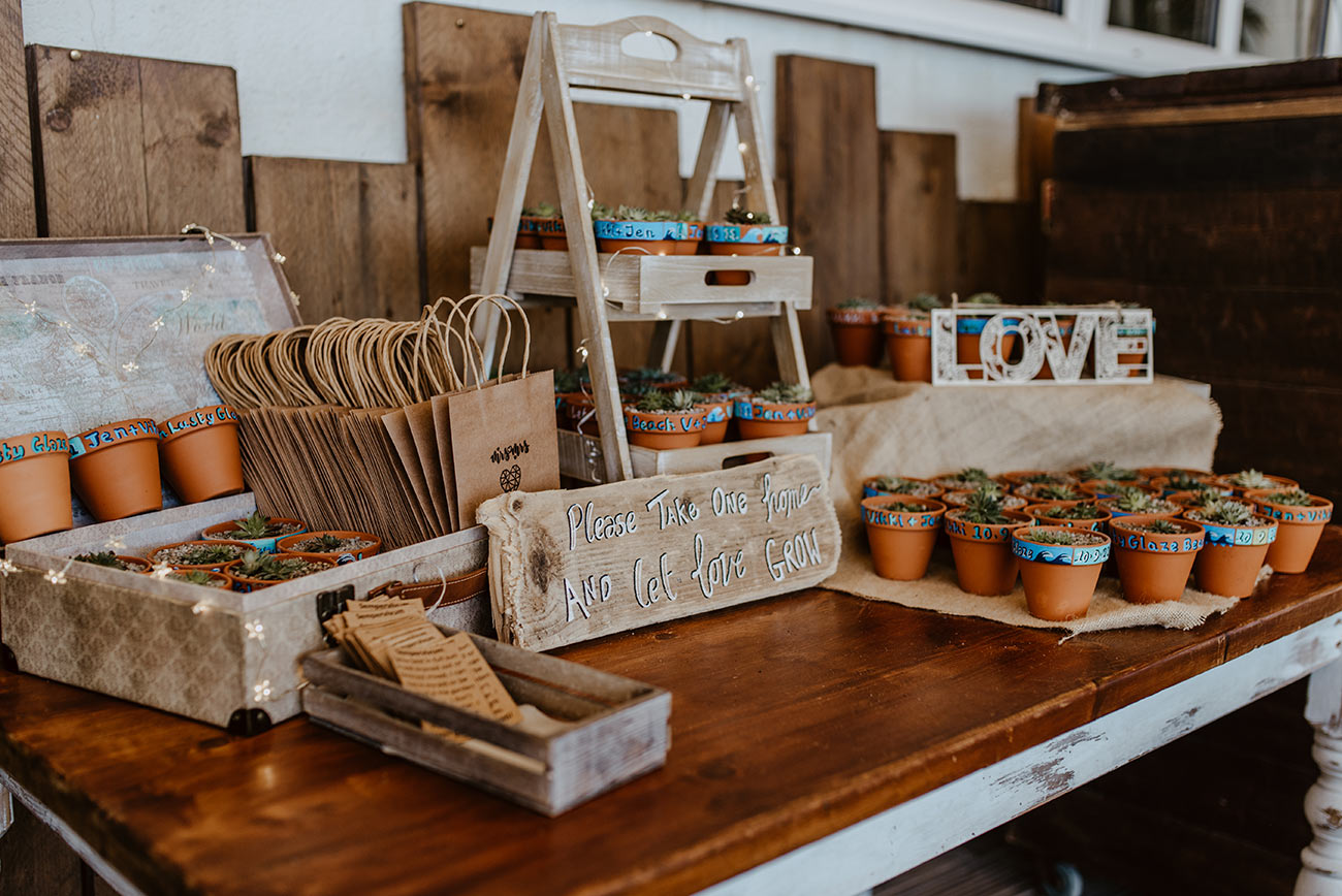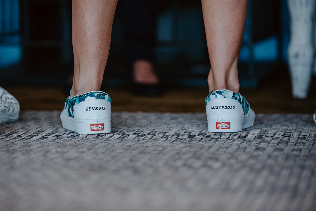 Jen’s design for her custom Vans was the starting point for the look and feel of the day. “The whole theme was centred around Jen’s trainers: green tropical leaf print and surfer vibes,” says Vikki, who adds that Jen’s mum designed the succulent favours in bespoke painted pots as well as the table decorations inspired by the couple’s favourite beaches.