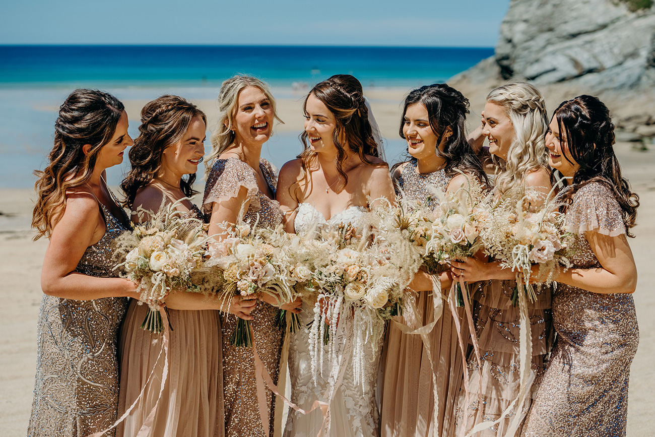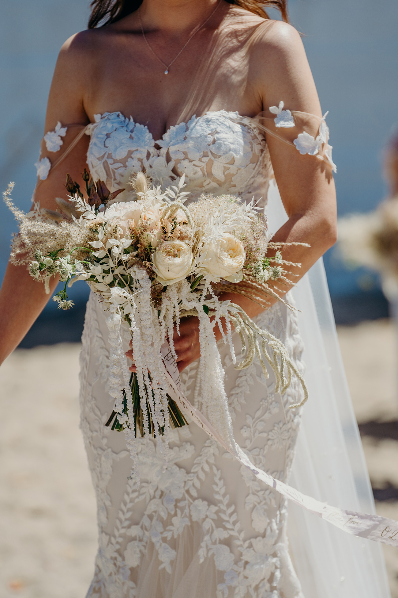 The easy-breezy beach setting inspired the day’s boho coastal styling. “I love dried foliage mixed with fresh roses in natural and blush colours,” says Daisy-Mae, who teamed her off-the-shoulder lace gown with a beautiful bouquet of neutral hues. Echoing the florals, the bridesmaids donned dresses in shades of taupe and blush – “with lots of sparkle!” – and boho braids in keeping with the day’s laidback vibe.