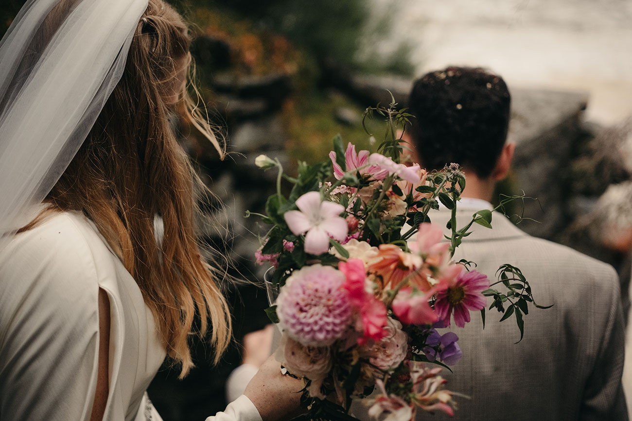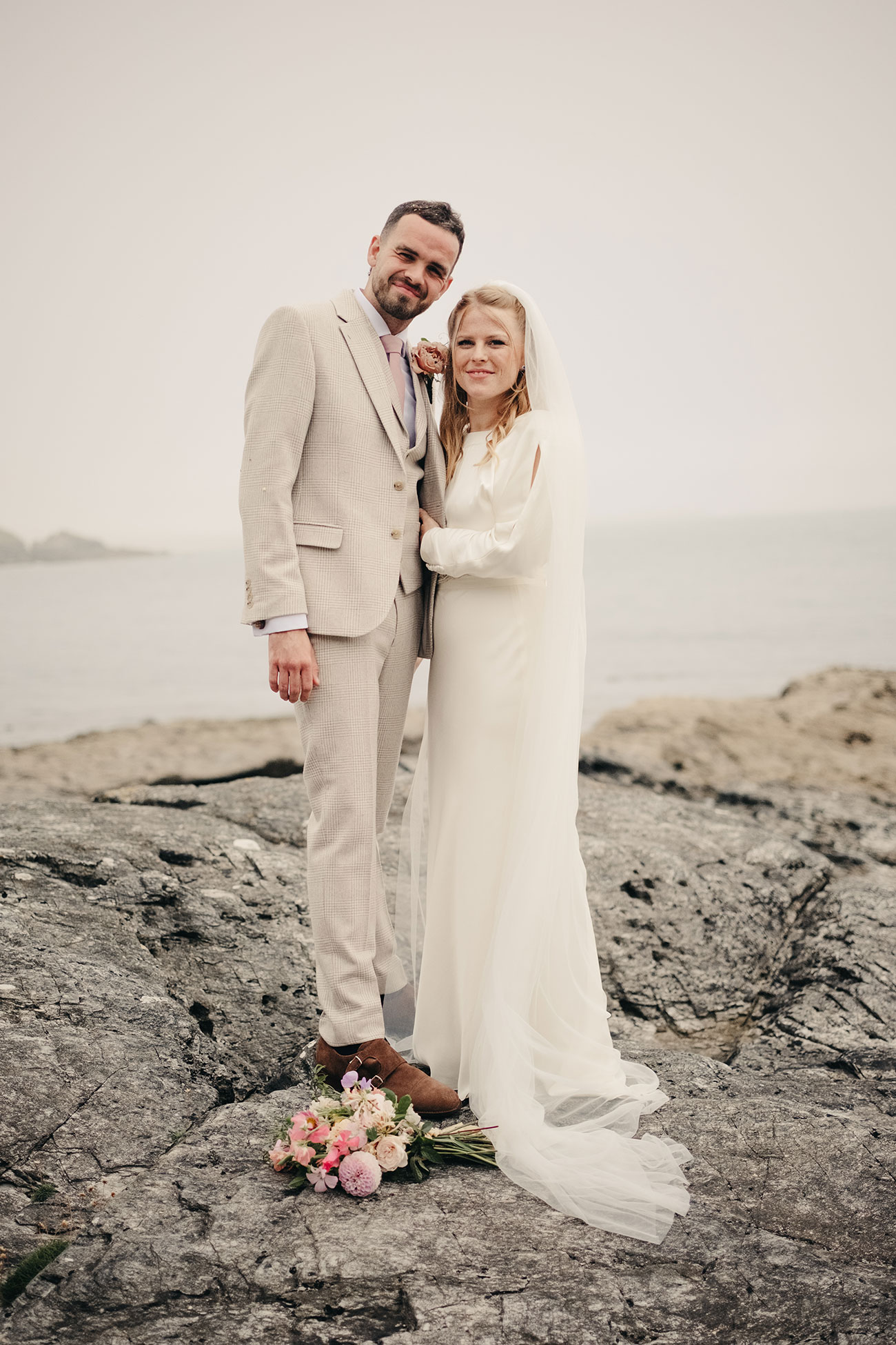 The couple chose Prussia Cove for their weekend-long celebration – a place close to their hearts that Kit first visited at the age of four and returns to every October. “It’s always been a special place for me,” she says. Their joyful, pink-hued wedding featured shades of rose throughout, from the bridesmaids’ dresses to the wild, locally grown blooms.