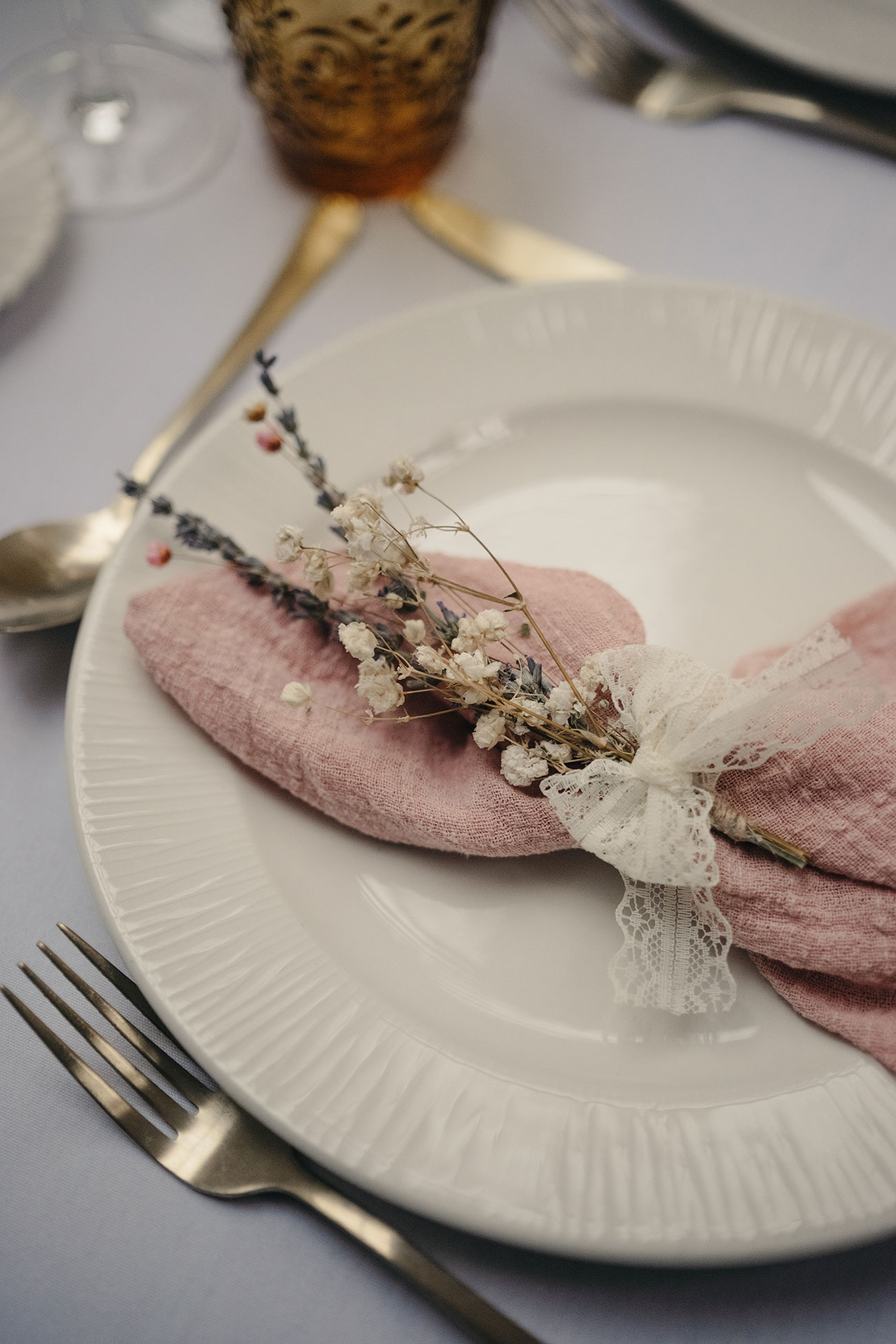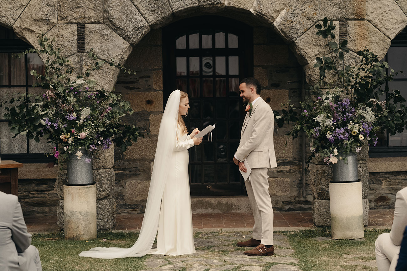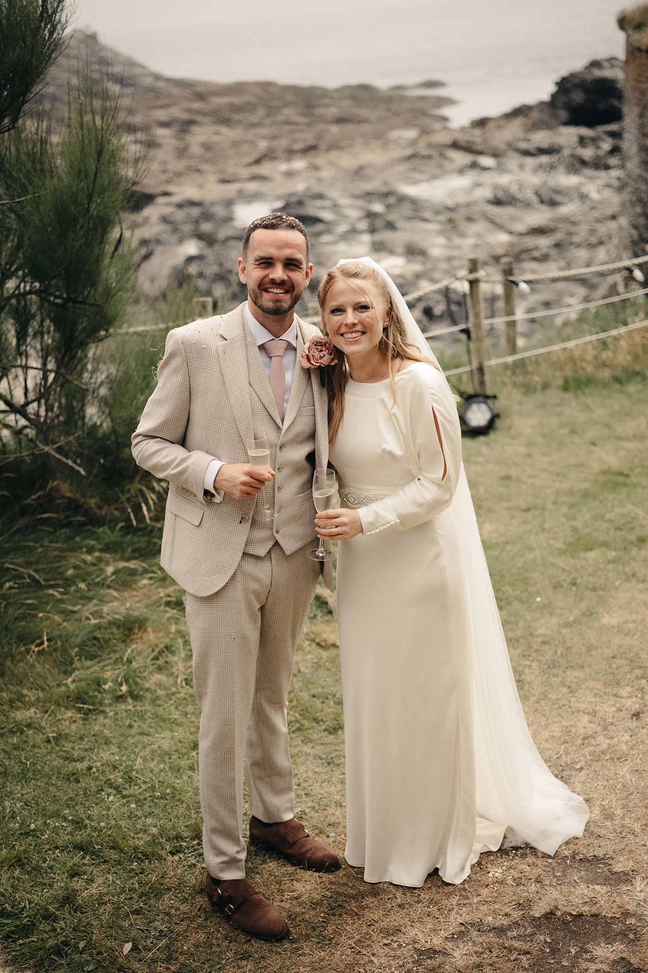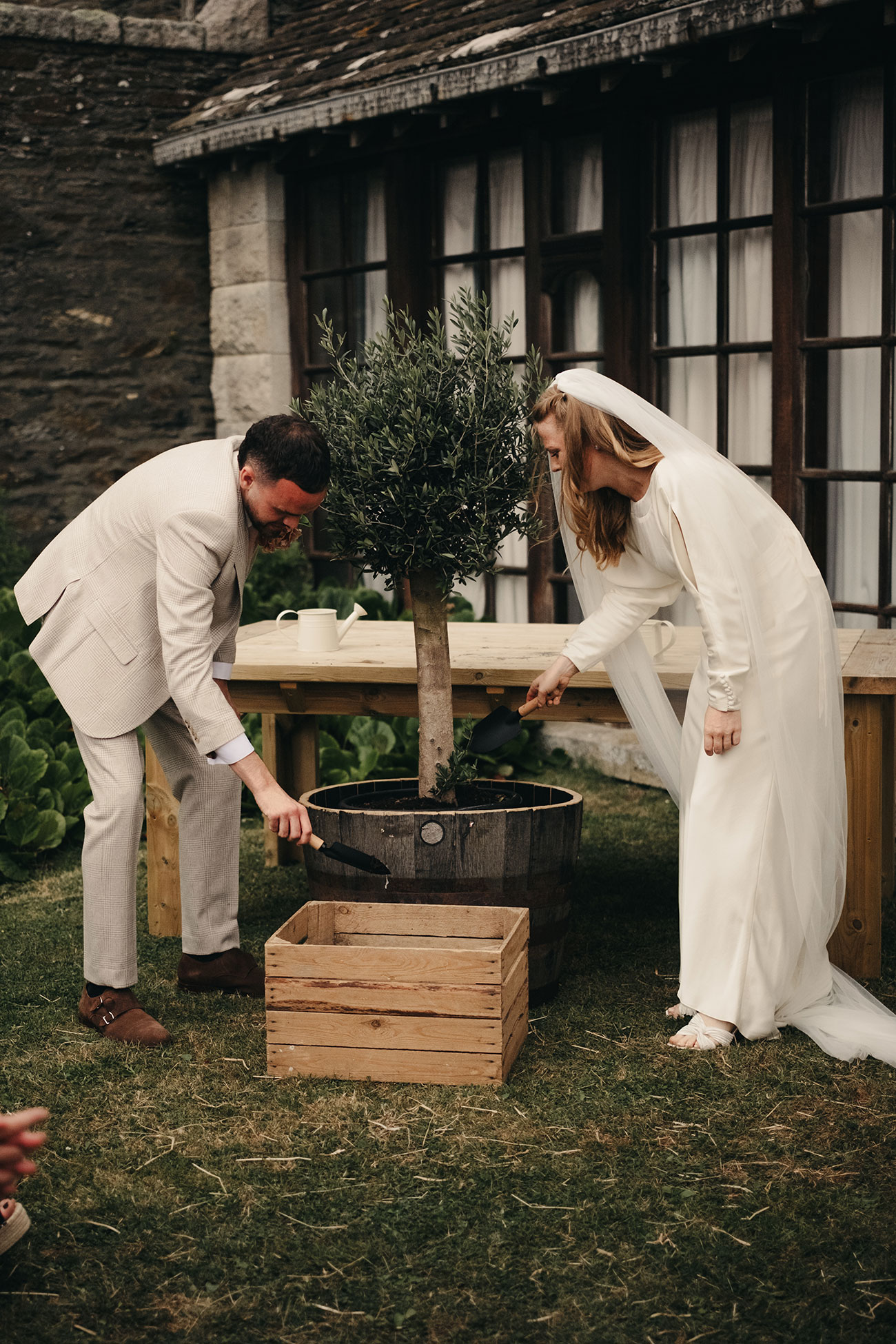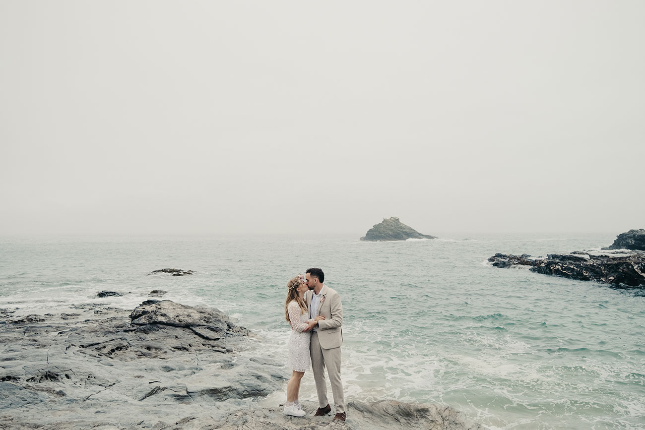 Having legally married in London the week before, Kit and Chris held a personal, celebrant-led ceremony by the sea, accompanied by the gentle murmur of the tide. Kit walked down the aisle to Billane’s cover of Simply the Best, before the couple exchanged their own vows and rings – with their sausage dog acting as ring-bearer. They also planted an olive tree on the grounds, “so we can visit it when we go to Prussia Cove each year,” smiles Kit.