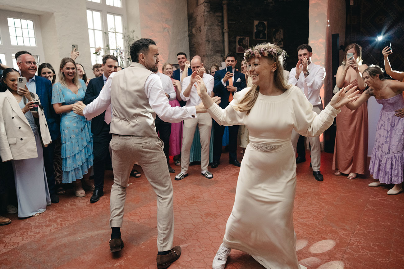 For their first dance, Kit and Chris chose a choreographed routine to Land of 1000 Dances. “This was a complete surprise for everyone, and they loved it,” says Kit. “We followed it with Fatboy Slim’s Praise You to make it clear we were there to party – definitely a highlight!”
