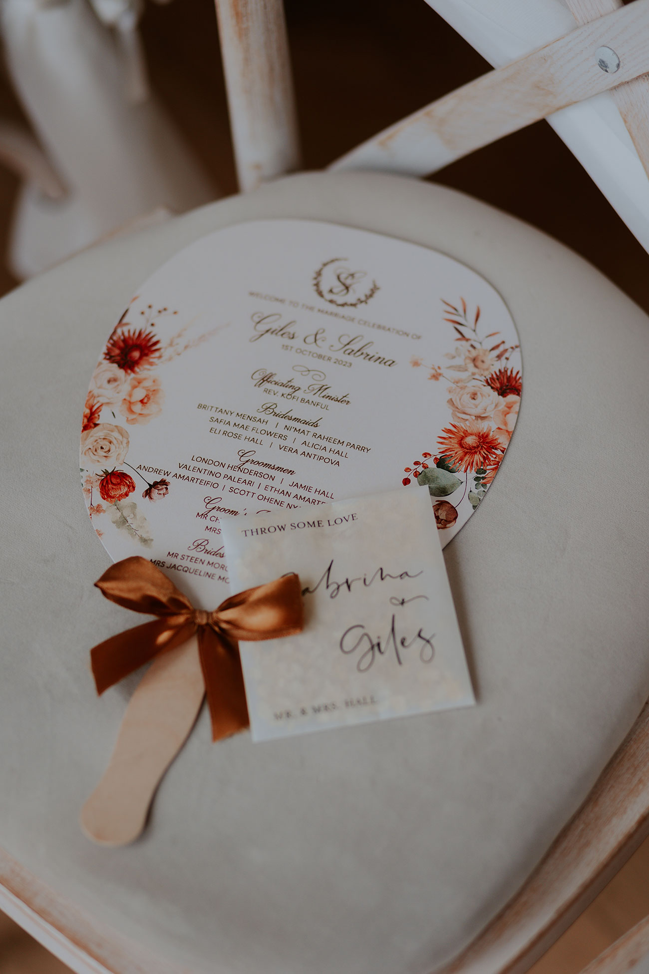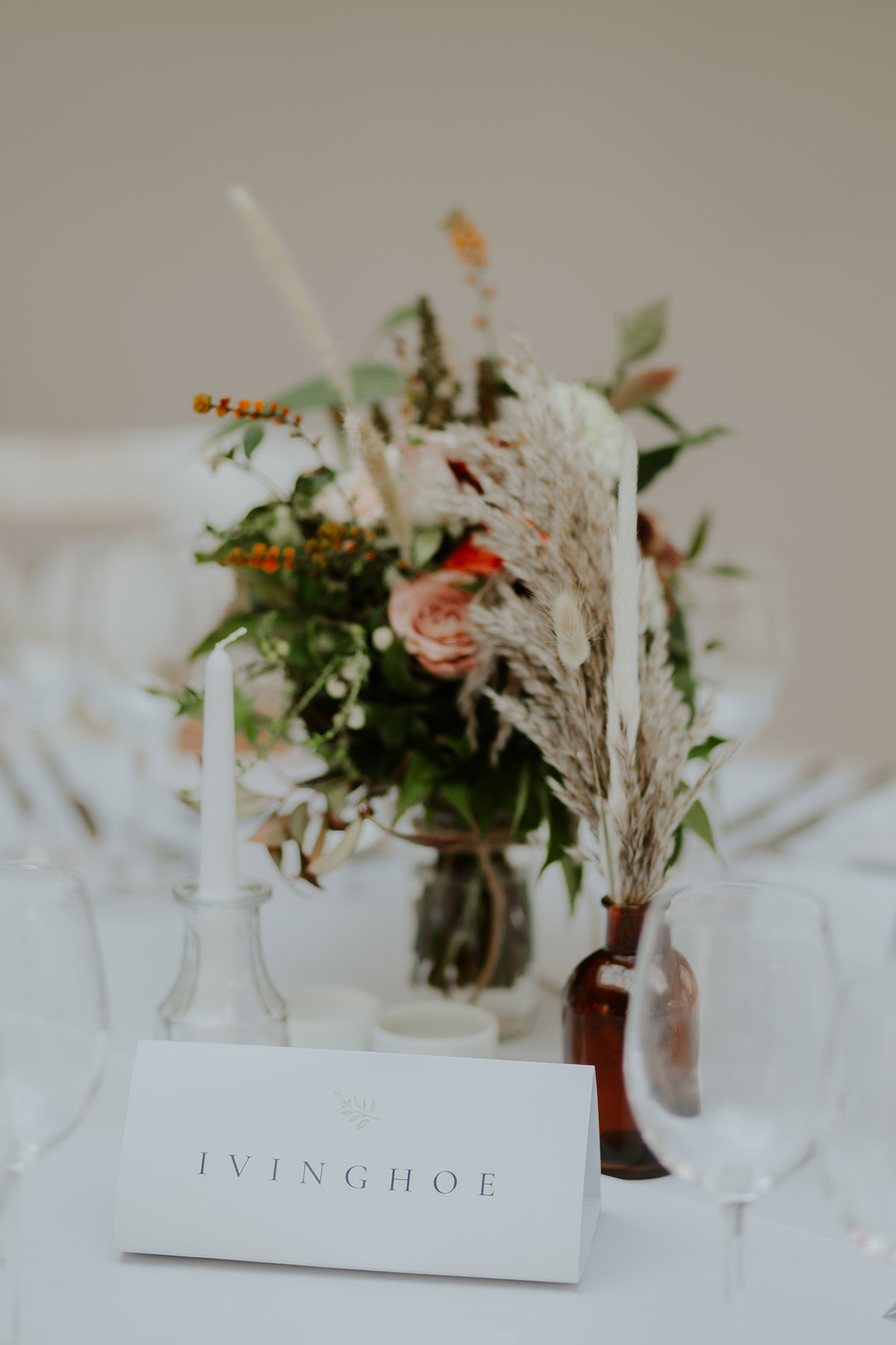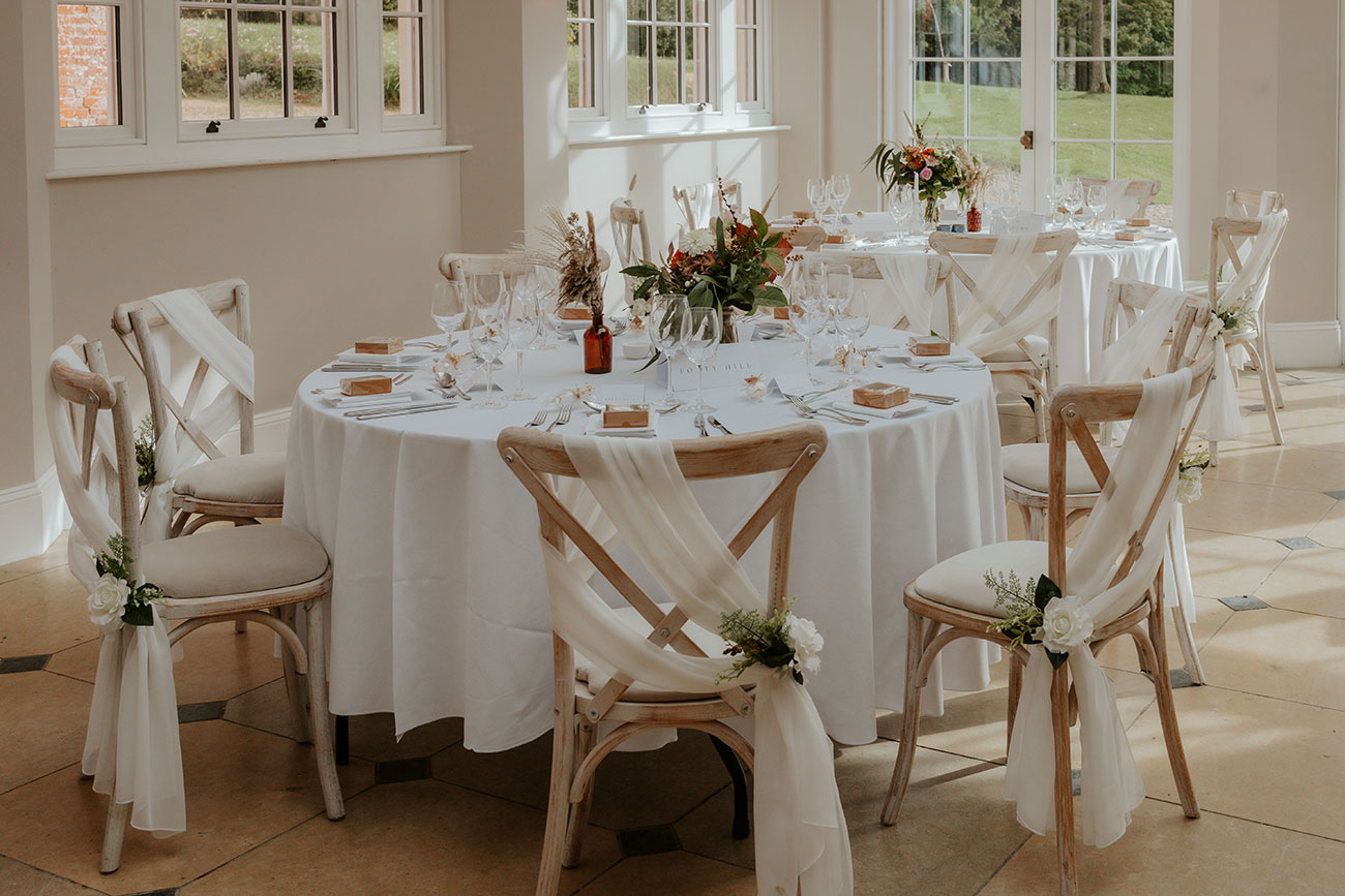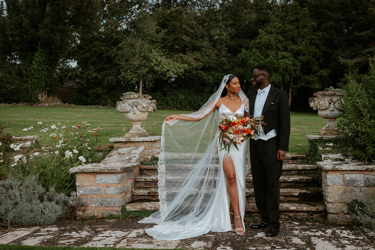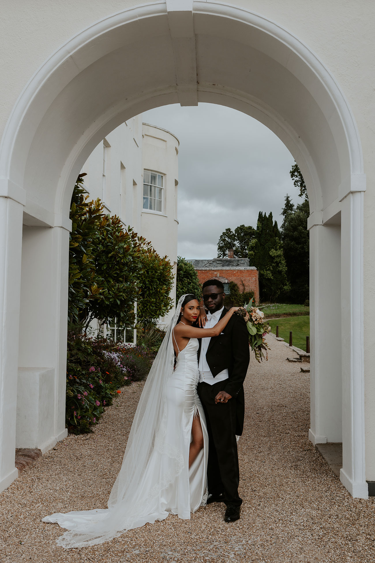 Choosing to wed outside of the “hustle and bustle of London”, the couple’s venue search took them to the Devon countryside and the elegant country house setting of Rockbeare Manor. Selecting a minimalist theme, the couple allowed the beauty of the venue to shine through, with a complementary colour scheme of burnt orange and white with pops of rust. “I wanted pampas grass incorporated into our floral theme and our florist brought the vision to life seamlessly, combining fresh and dried flowers,” says Sabrina.