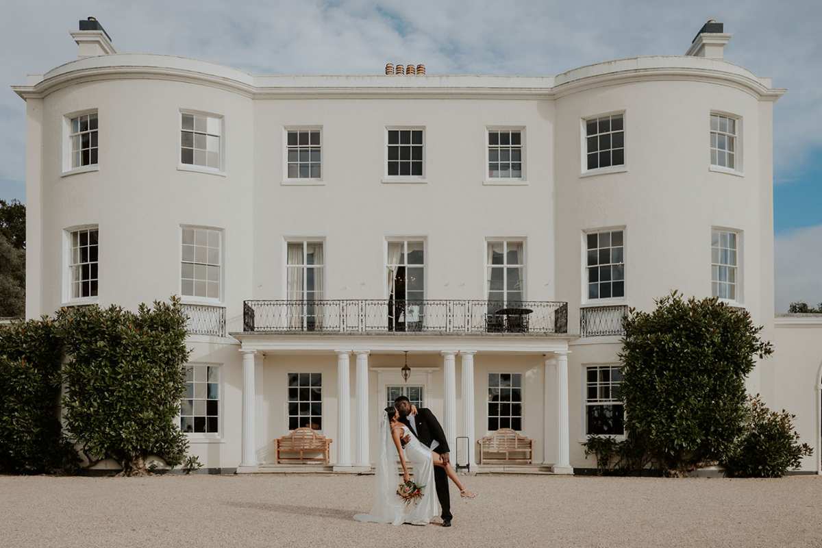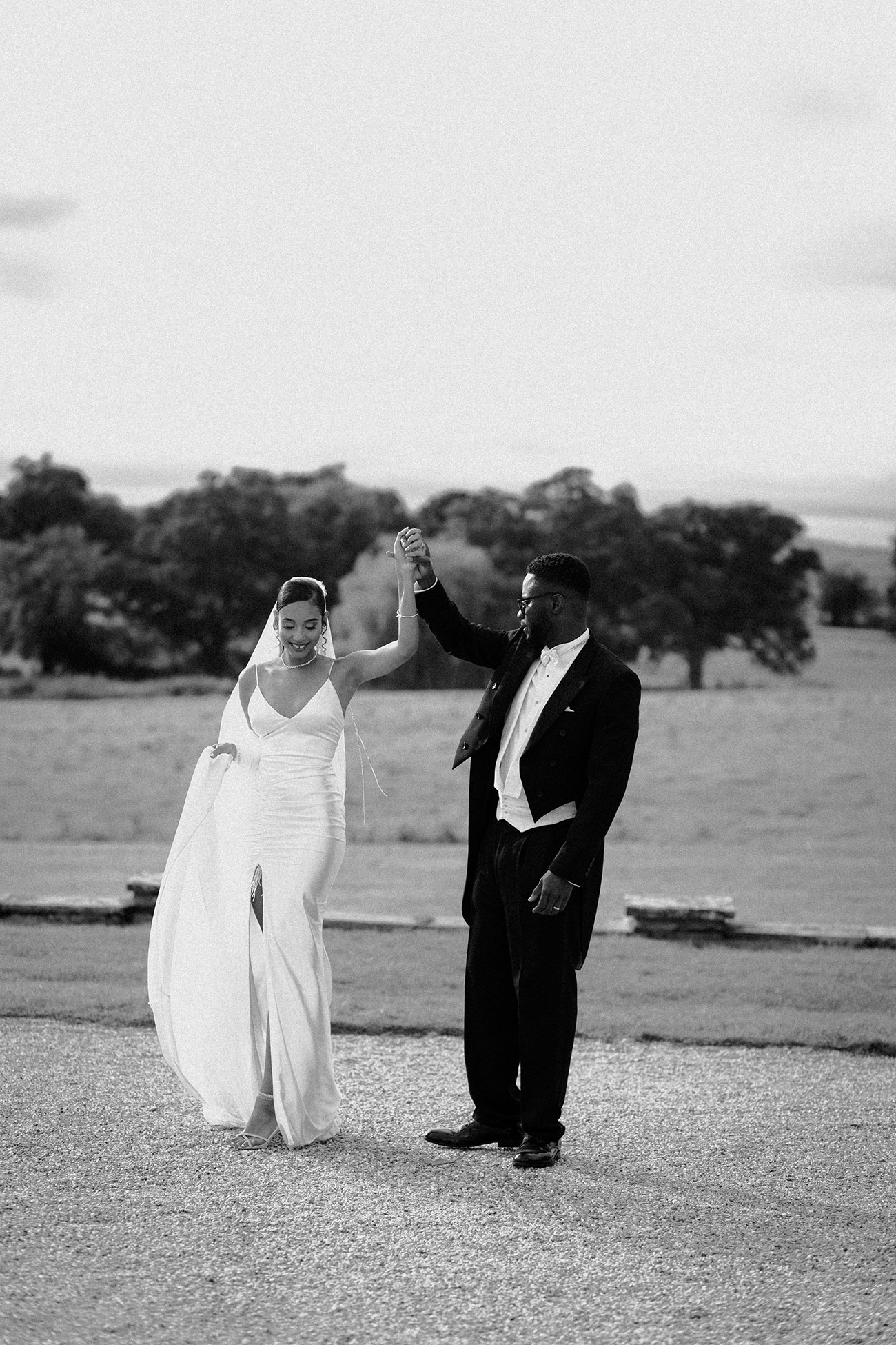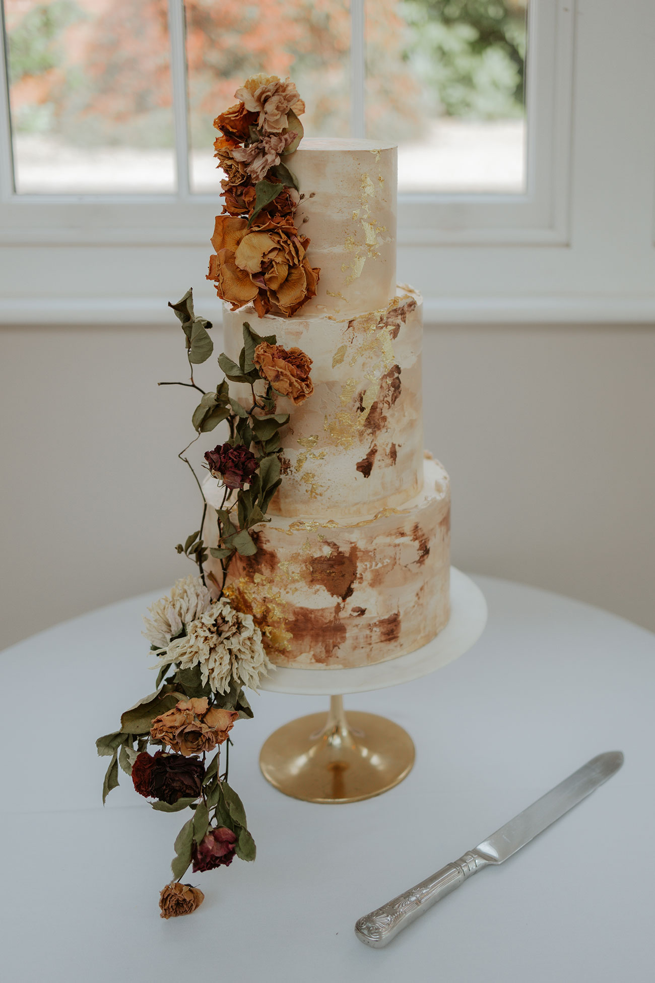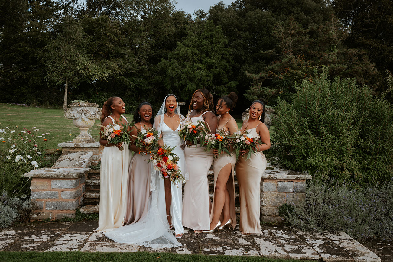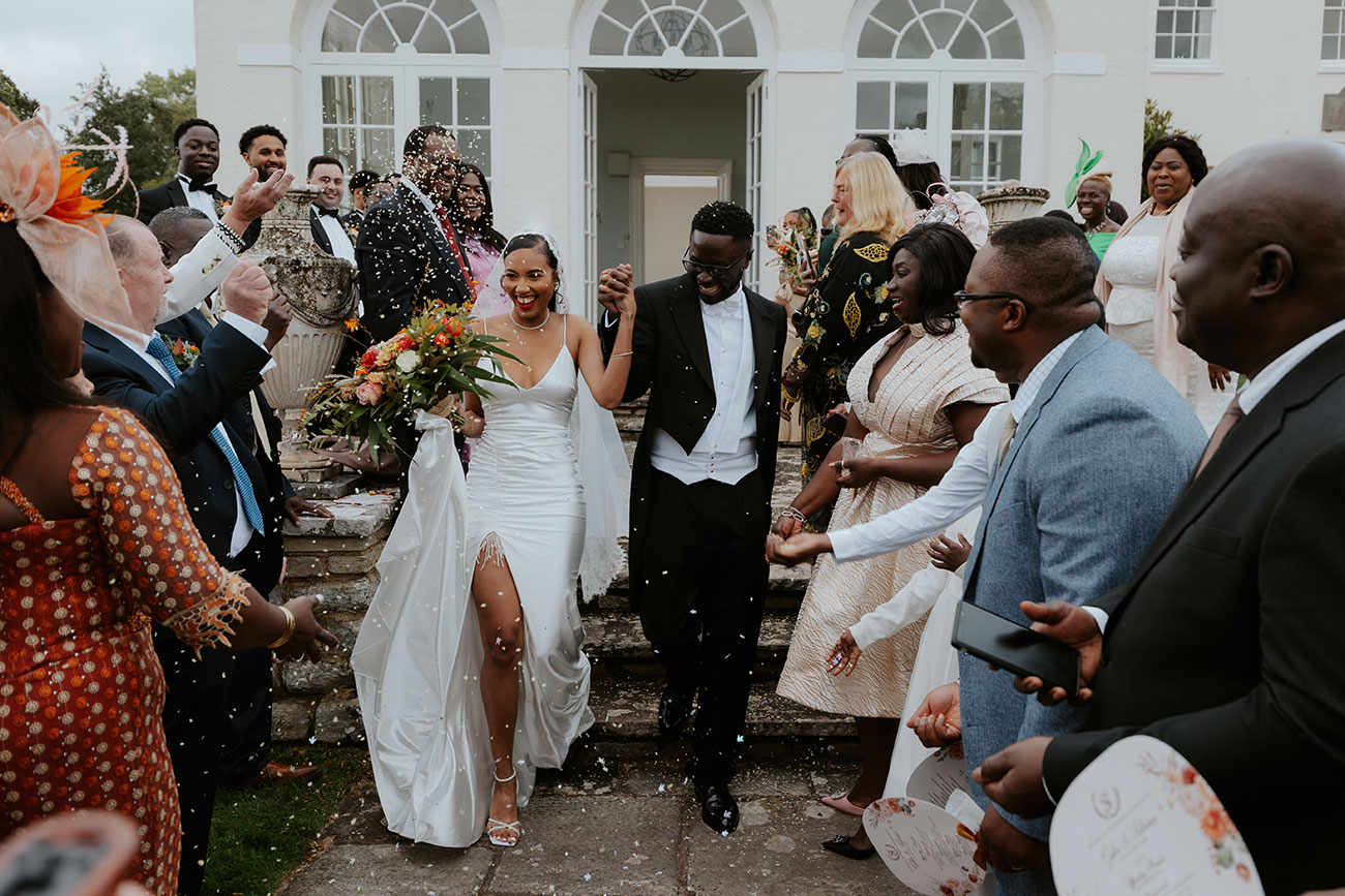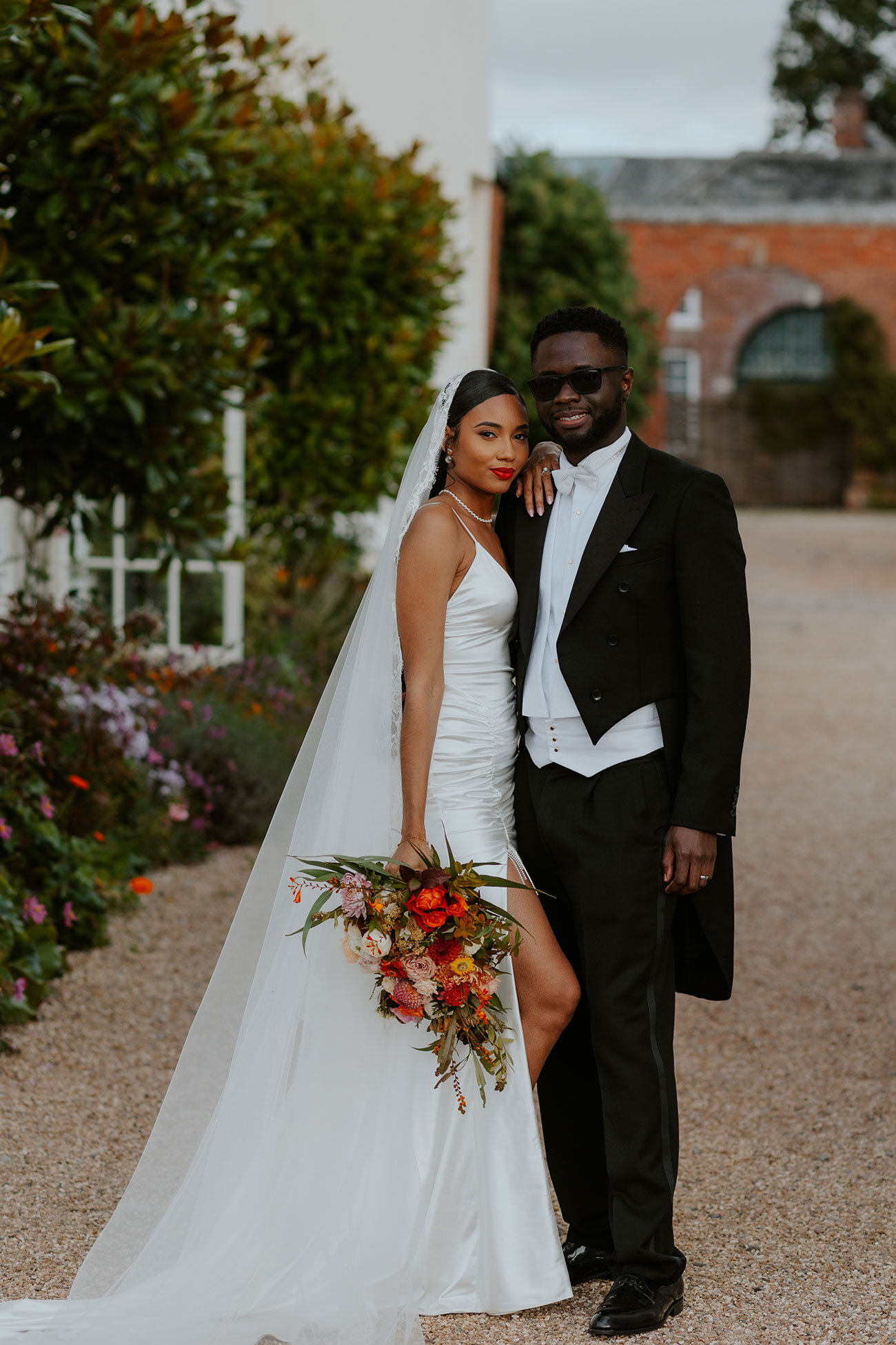 Choosing to wed outside of the “hustle and bustle of London”, the couple’s venue search took them to the Devon countryside and the elegant country house setting of Rockbeare Manor. Selecting a minimalist theme, the couple allowed the beauty of the venue to shine through, with a complementary colour scheme of burnt orange and white with pops of rust. “I wanted pampas grass incorporated into our floral theme and our florist brought the vision to life seamlessly, combining fresh and dried flowers,” says Sabrina.