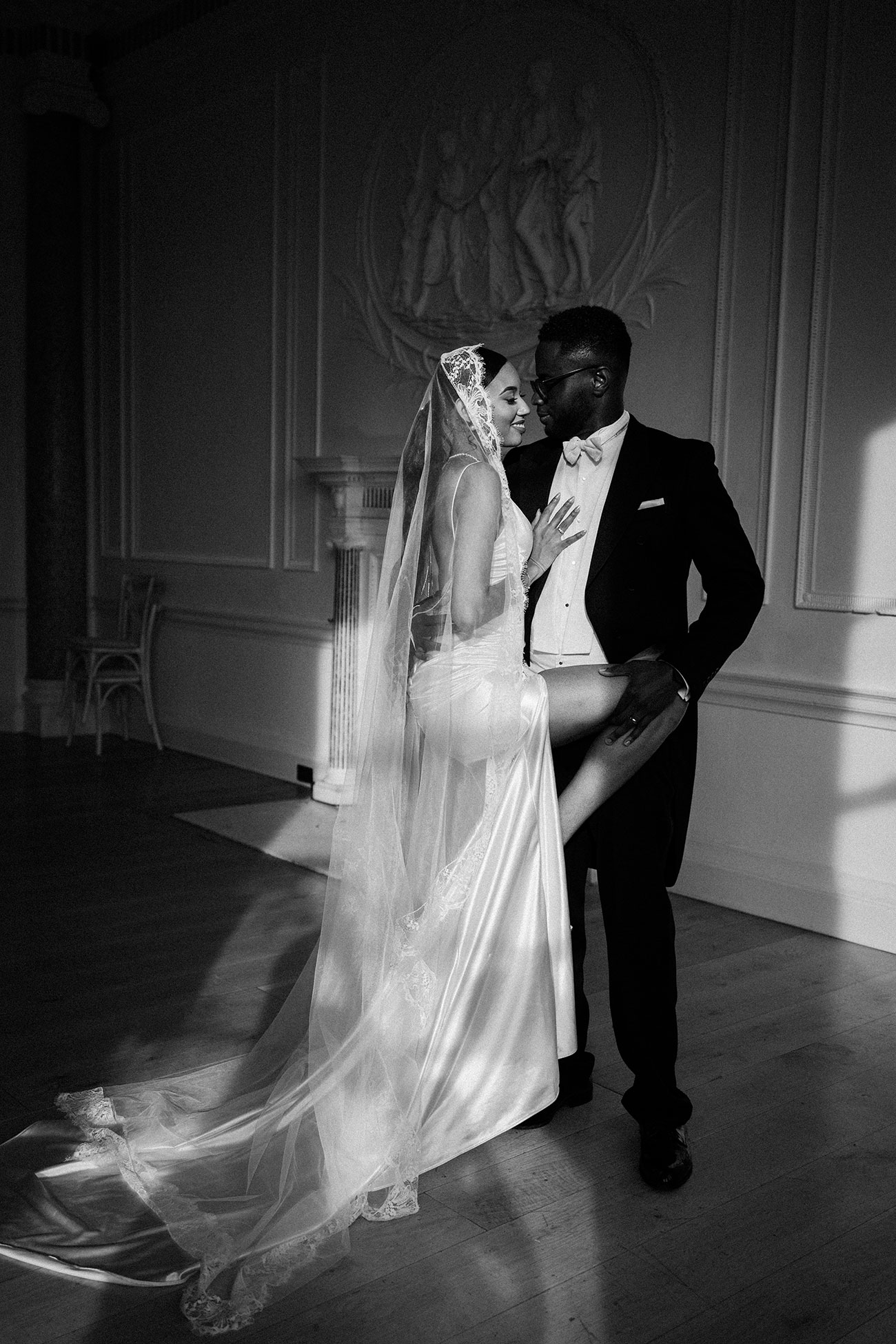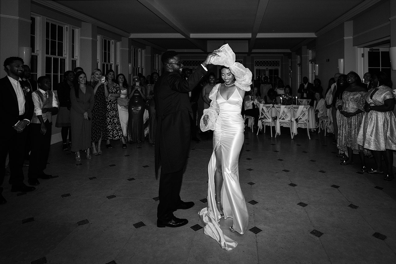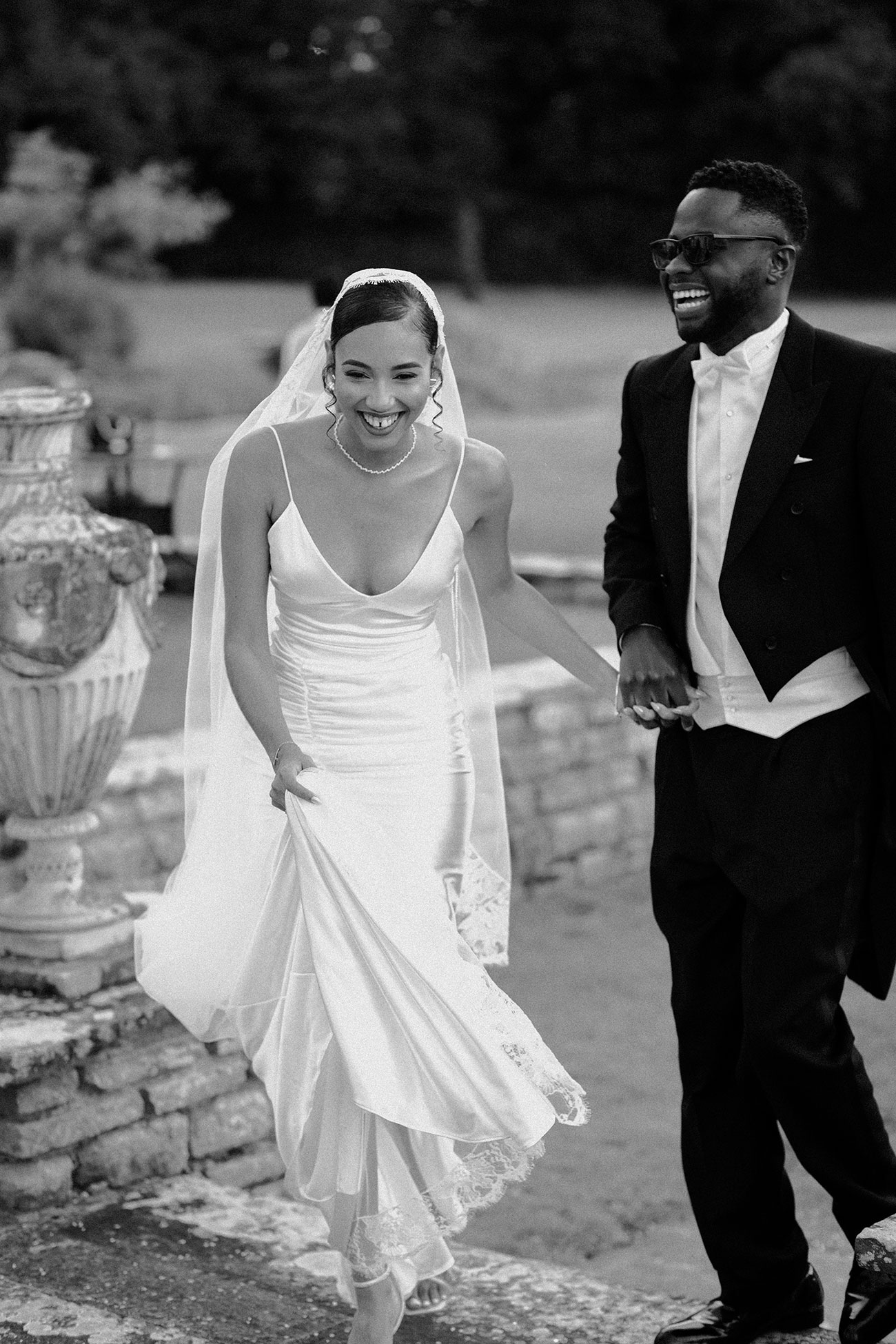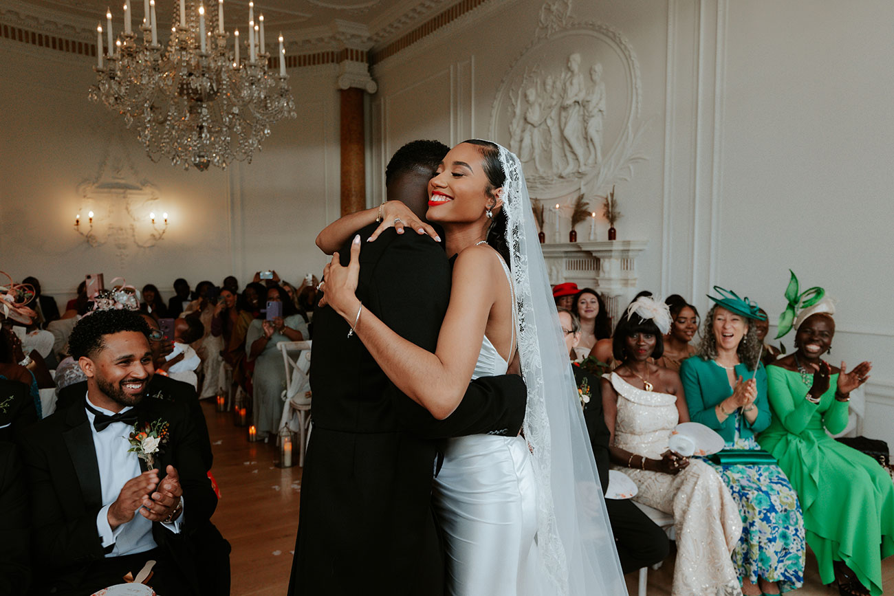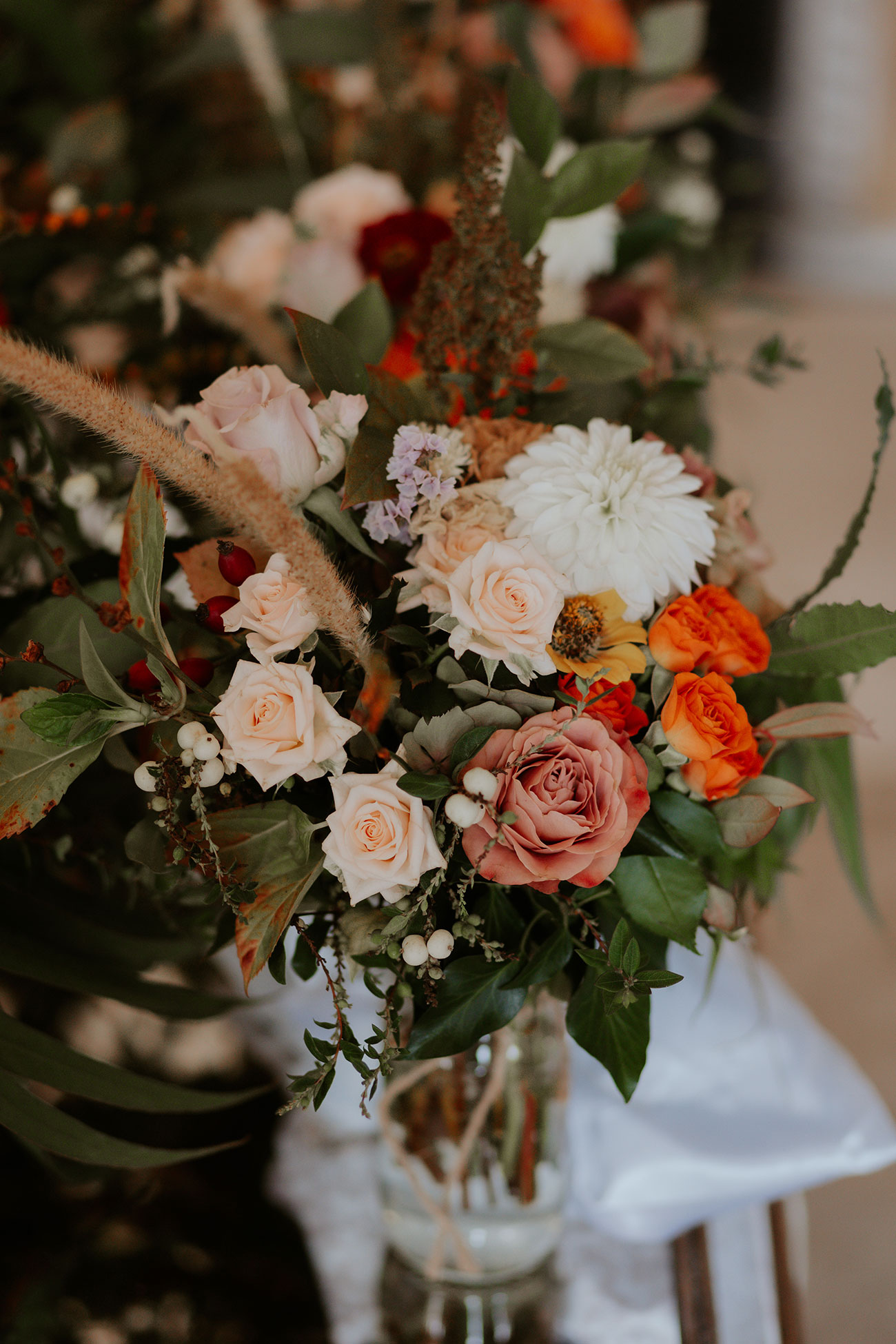 Choosing to wed outside of the “hustle and bustle of London”, the couple’s venue search took them to the Devon countryside and the elegant country house setting of Rockbeare Manor. Selecting a minimalist theme, the couple allowed the beauty of the venue to shine through, with a complementary colour scheme of burnt orange and white with pops of rust. “I wanted pampas grass incorporated into our floral theme and our florist brought the vision to life seamlessly, combining fresh and dried flowers,” says Sabrina.