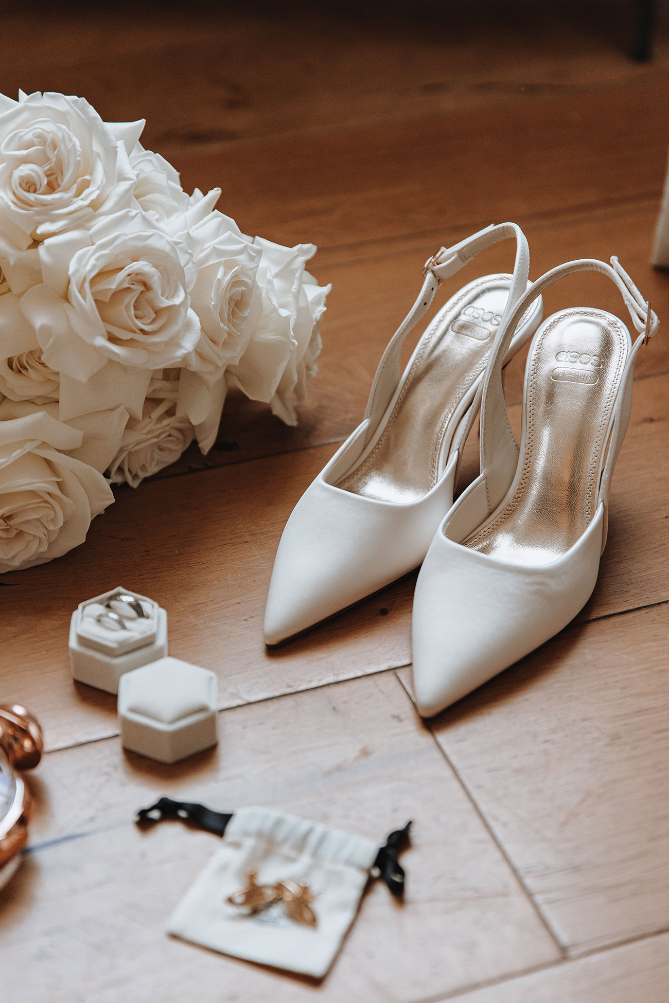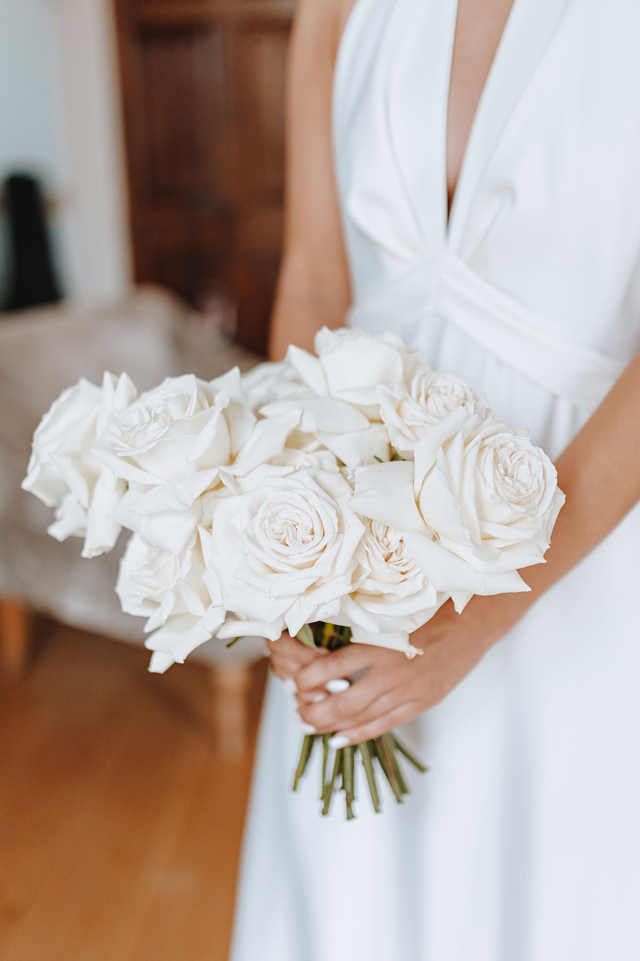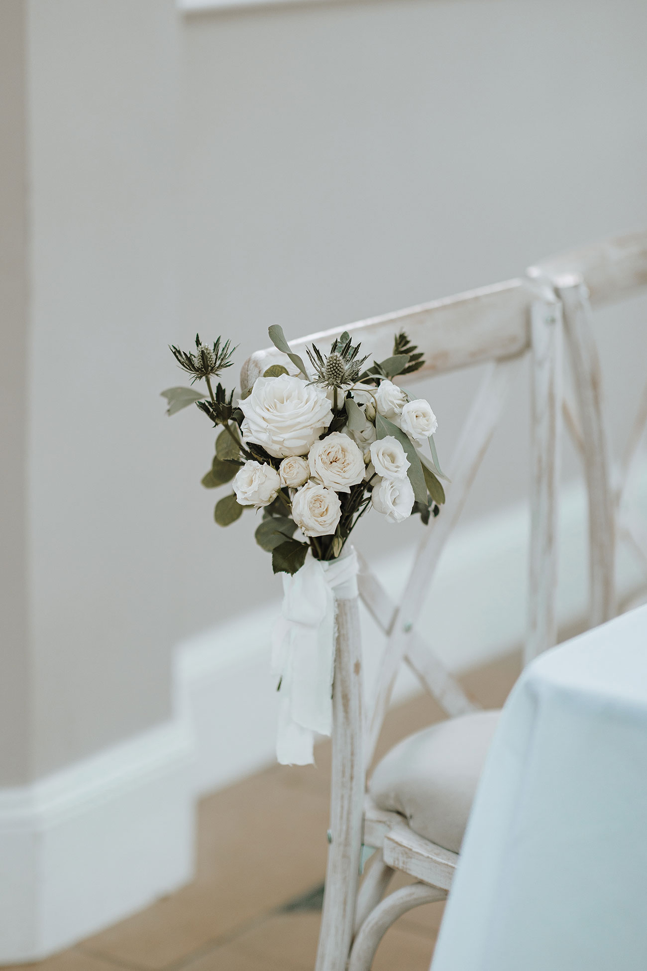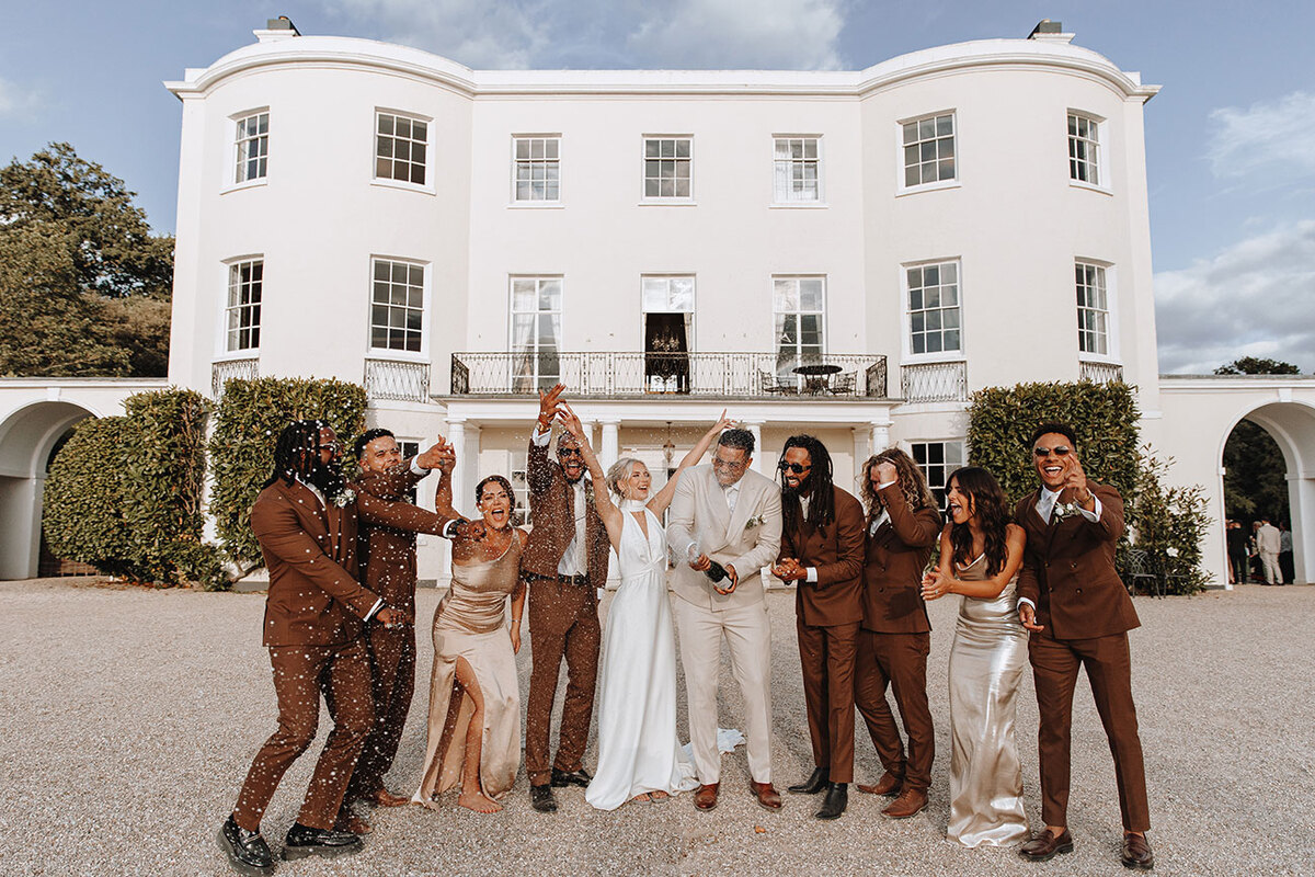 Plans began in earnest for their wedding at Rockbeare Manor, which took a classic colour scheme of champagne and brown. The sumptuous palette was carried in everything from the groom’s taupe and groomsmen’s coffee brown suits to the bridesmaid’s beautiful light biscuit hued gowns. Lucy teamed her striking white gown with a bouquet of crisp white roses, while posies of white blooms in dainty glass vases and contemporary stationery created a modern romantic aesthetic for the celebrations.