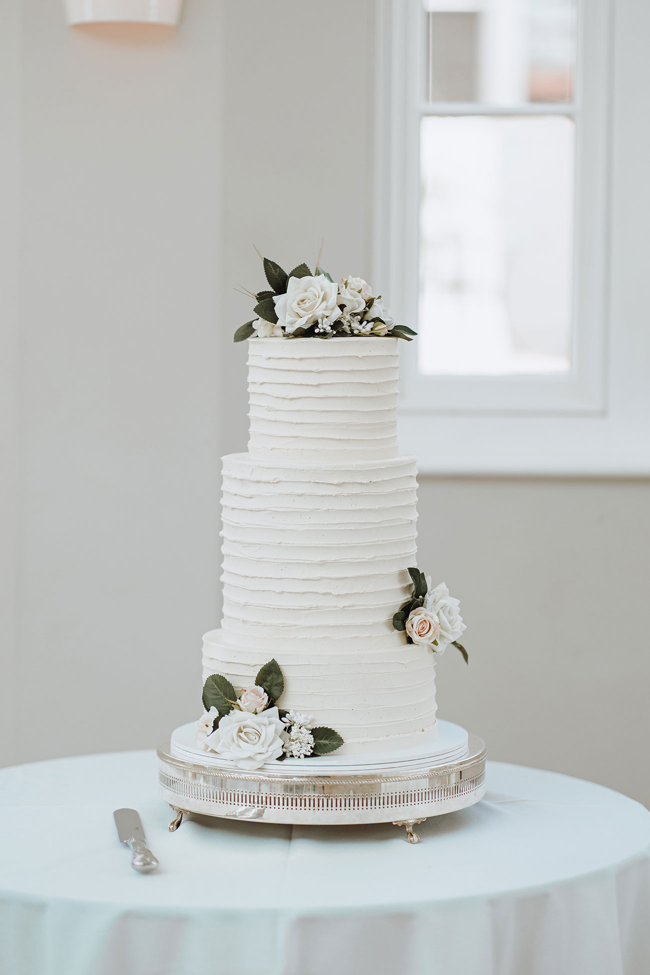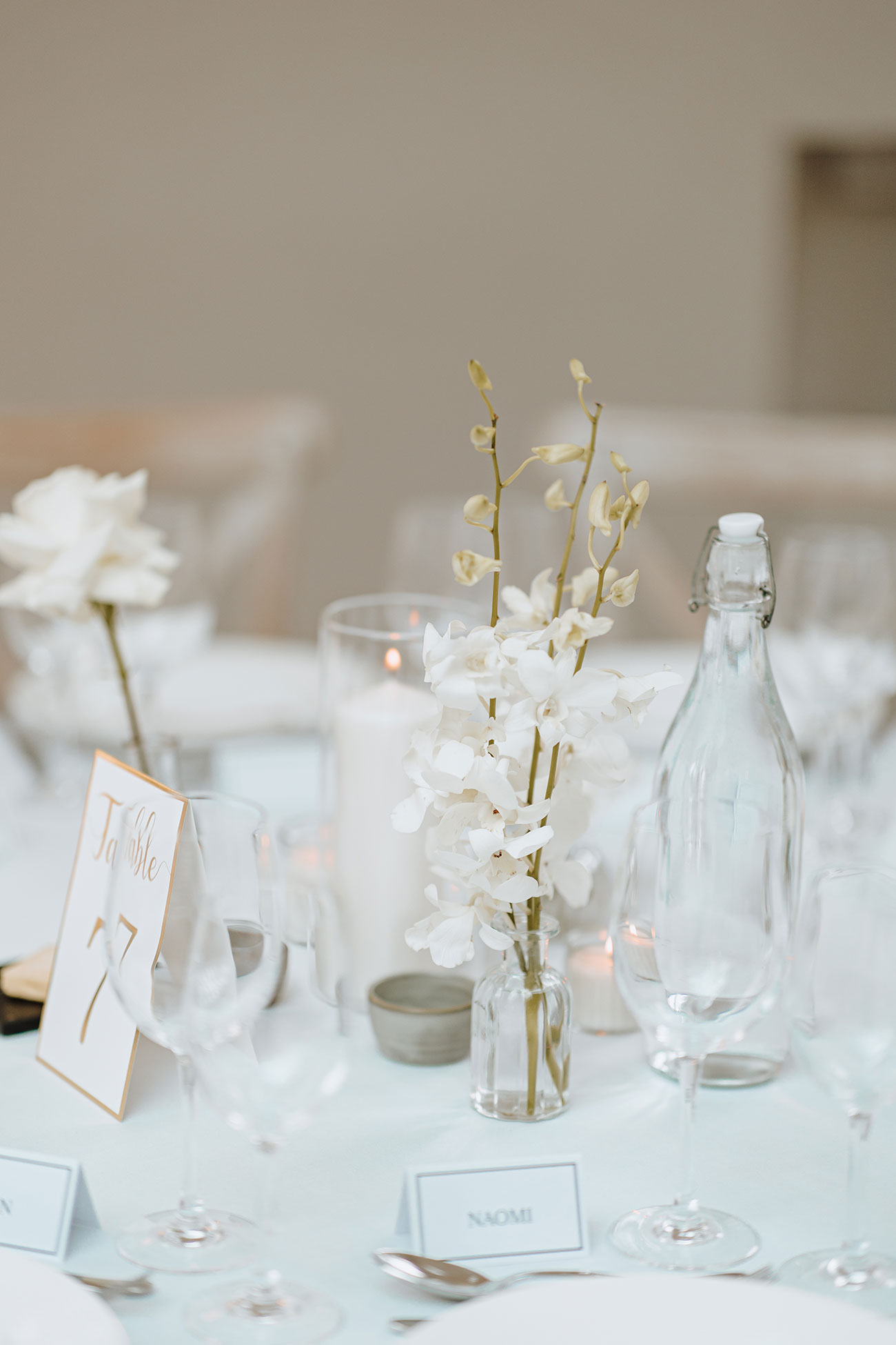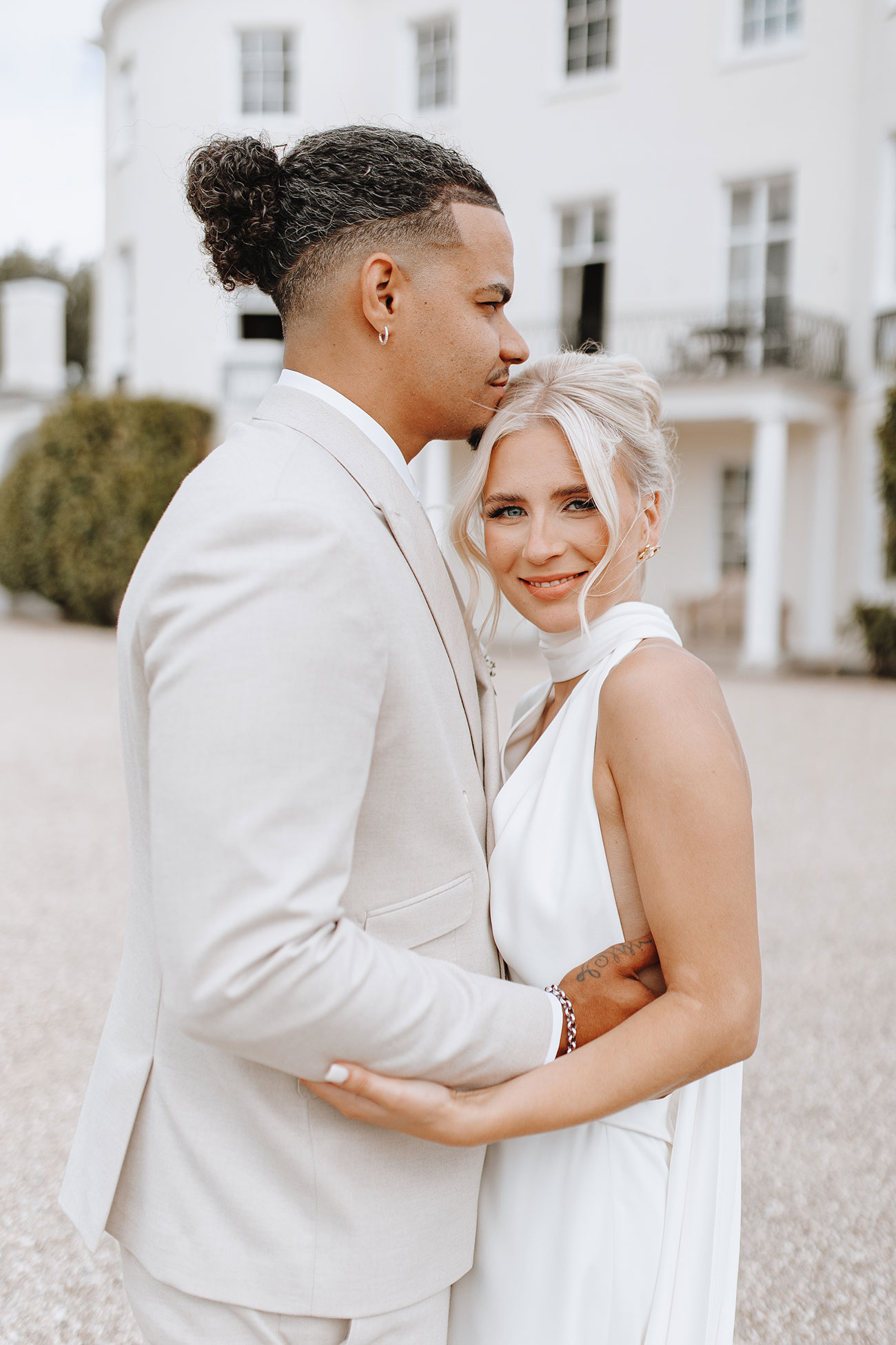 Plans began in earnest for their wedding at Rockbeare Manor, which took a classic colour scheme of champagne and brown. The sumptuous palette was carried in everything from the groom’s taupe and groomsmen’s coffee brown suits to the bridesmaid’s beautiful light biscuit hued gowns. Lucy teamed her striking white gown with a bouquet of crisp white roses, while posies of white blooms in dainty glass vases and contemporary stationery created a modern romantic aesthetic for the celebrations.
