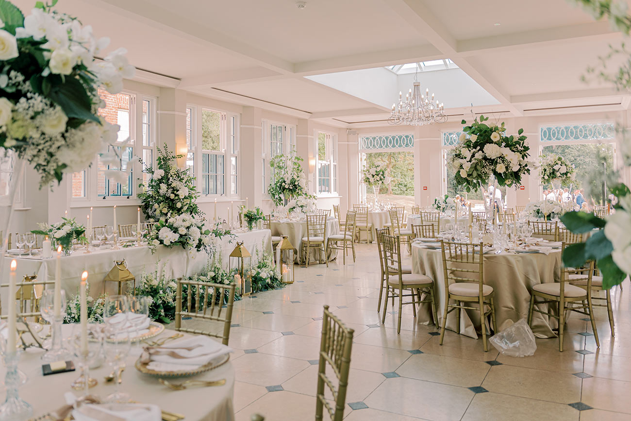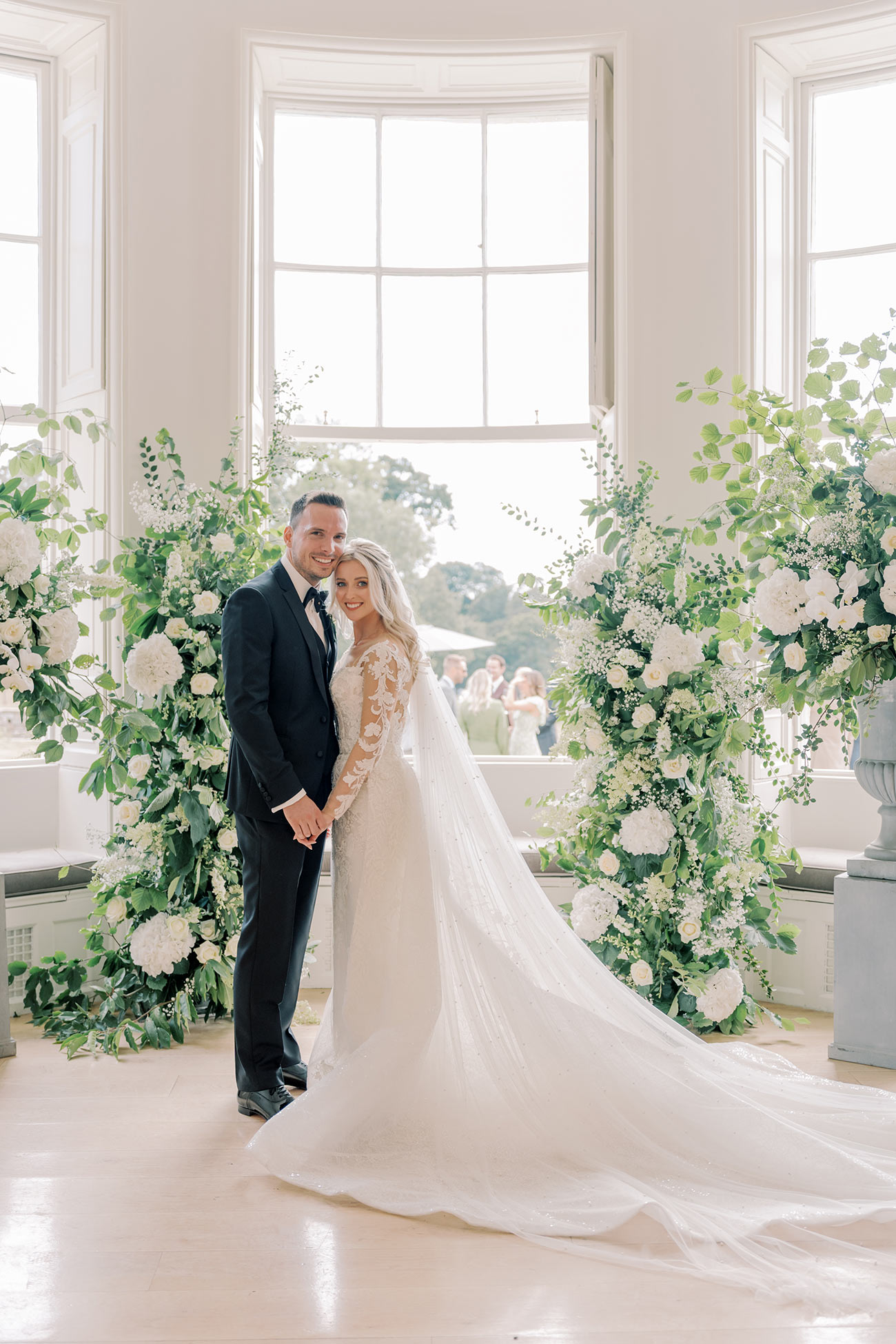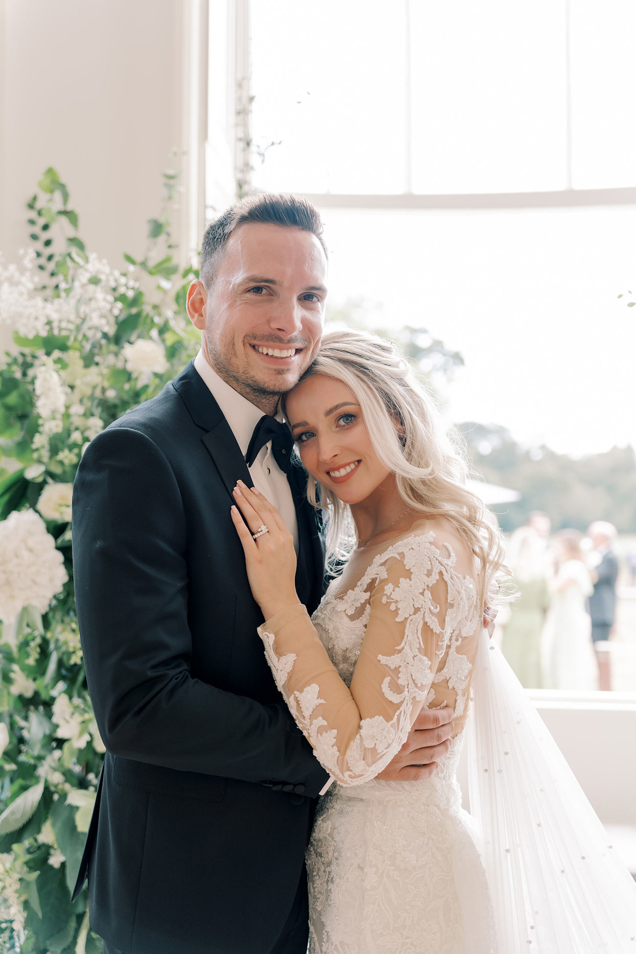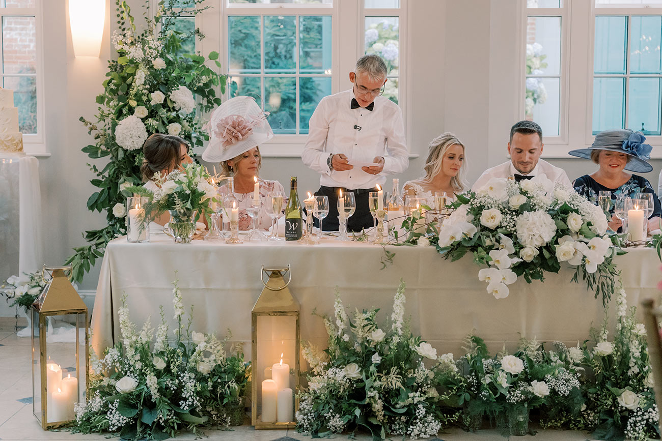 Wedding planning then took centre stage. “We knew we wanted a manor house and Rockbeare Manor was elegant, glamorous and timeless – exactly what we wanted our wedding to be!” says Megan. Choosing a palette of white, green, champagne and gold to match the décor of the venue, the flowers played a key role in the styling. Dramatic arrangements of orchids, hydrangeas, roses, gypsophila and wild greenery adorned the celebration spaces of the venue, beautifully framing the key moments, from the ceremony to the wedding breakfast. “I must admit – the flowers were my favourite detail on the day!” she says.