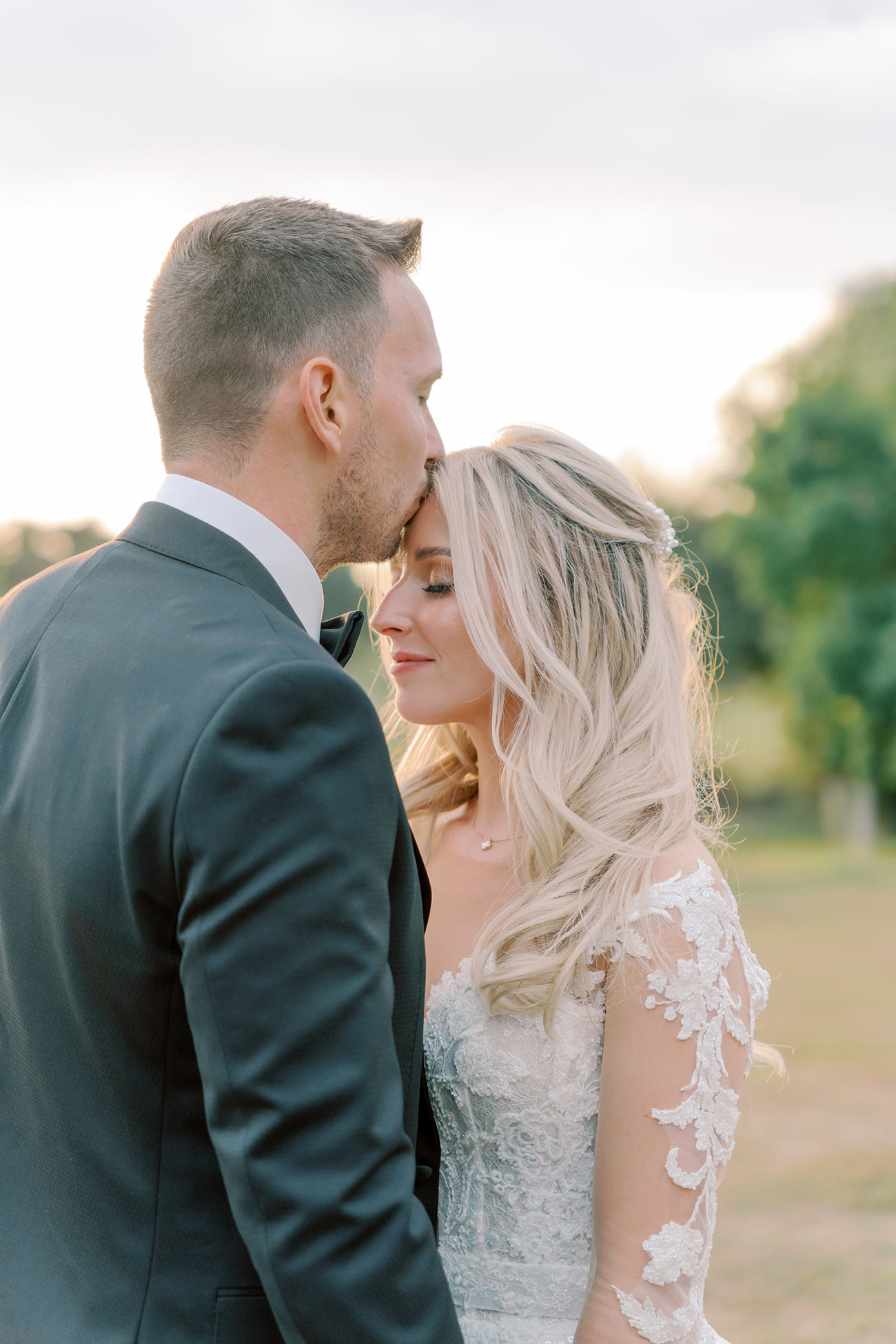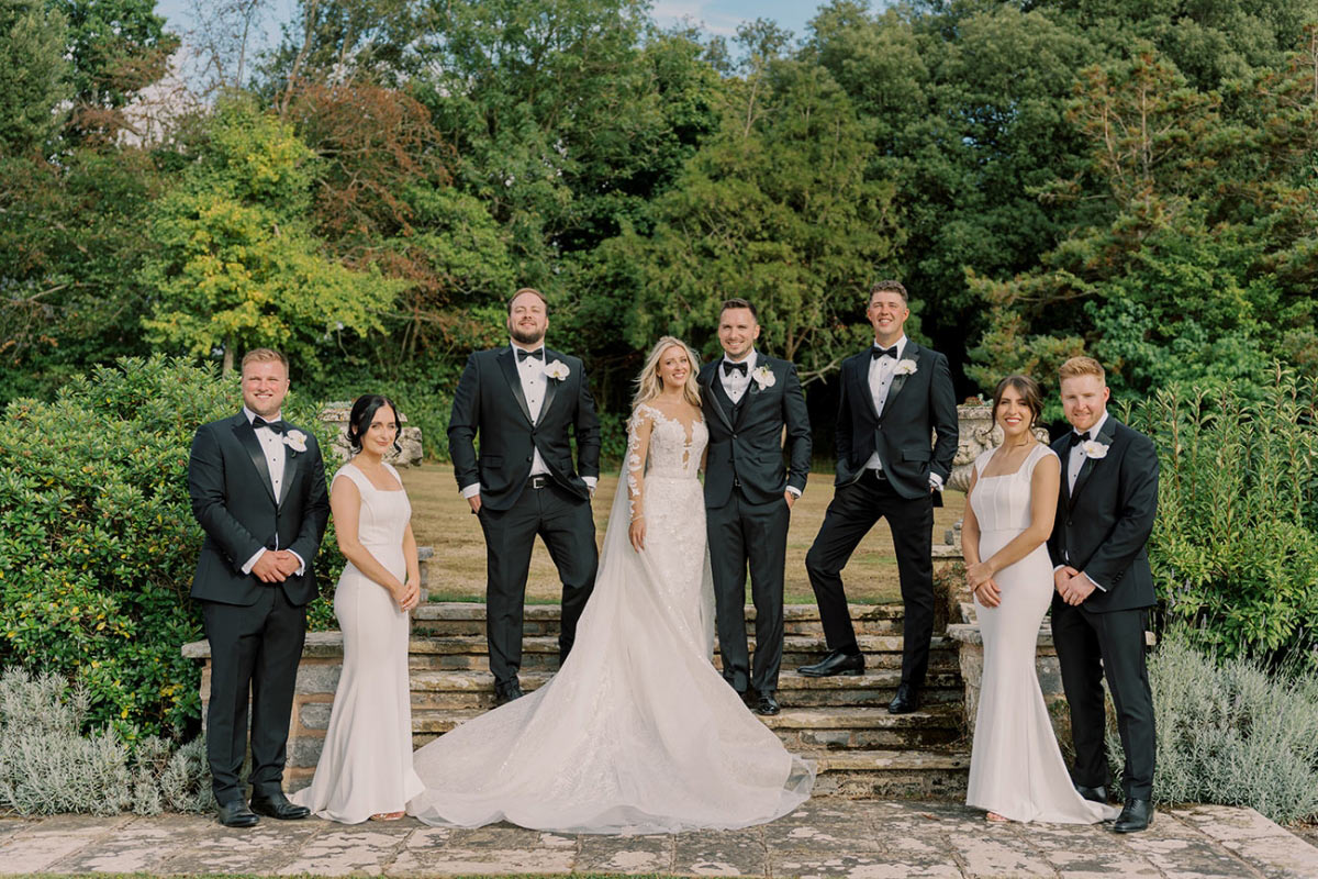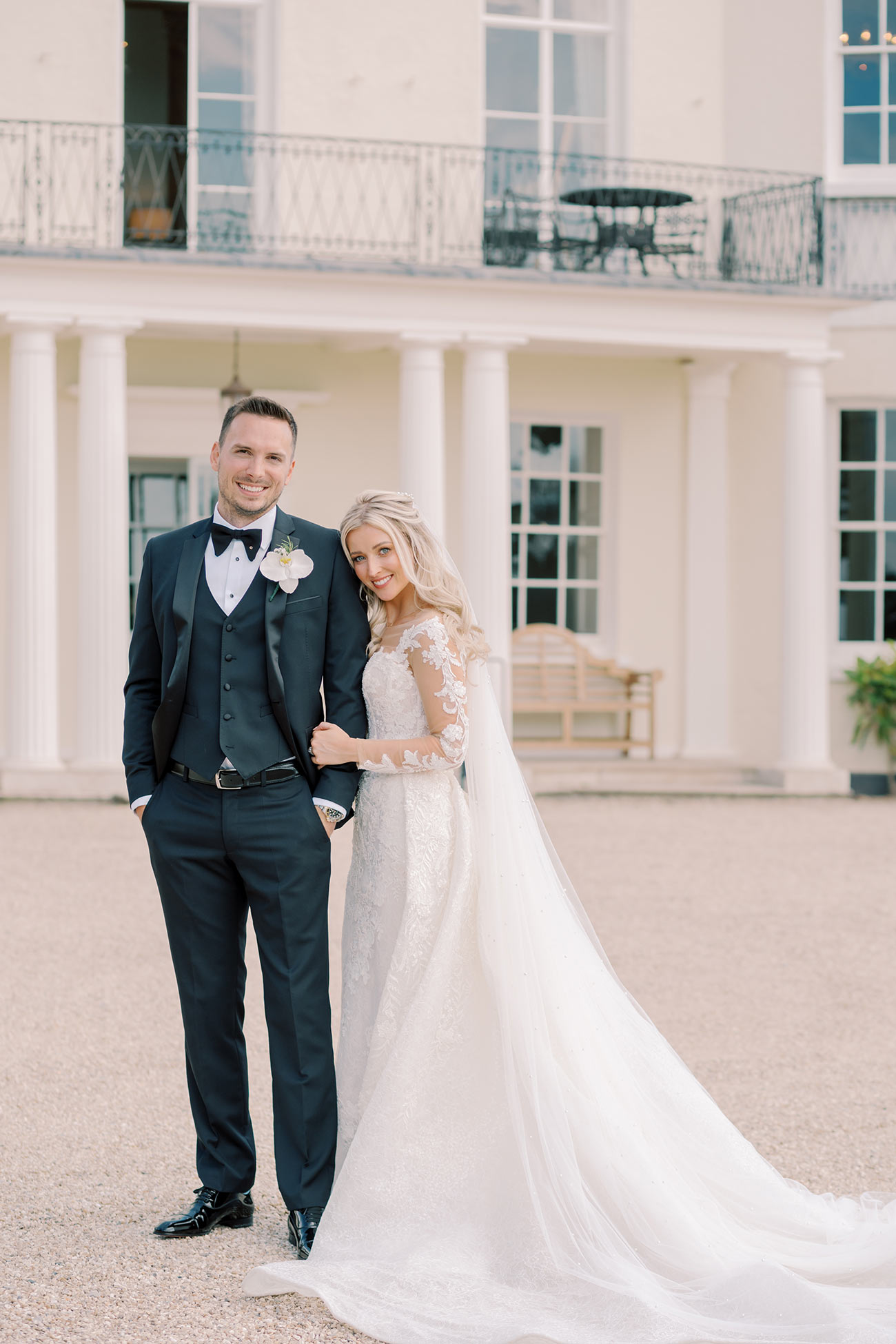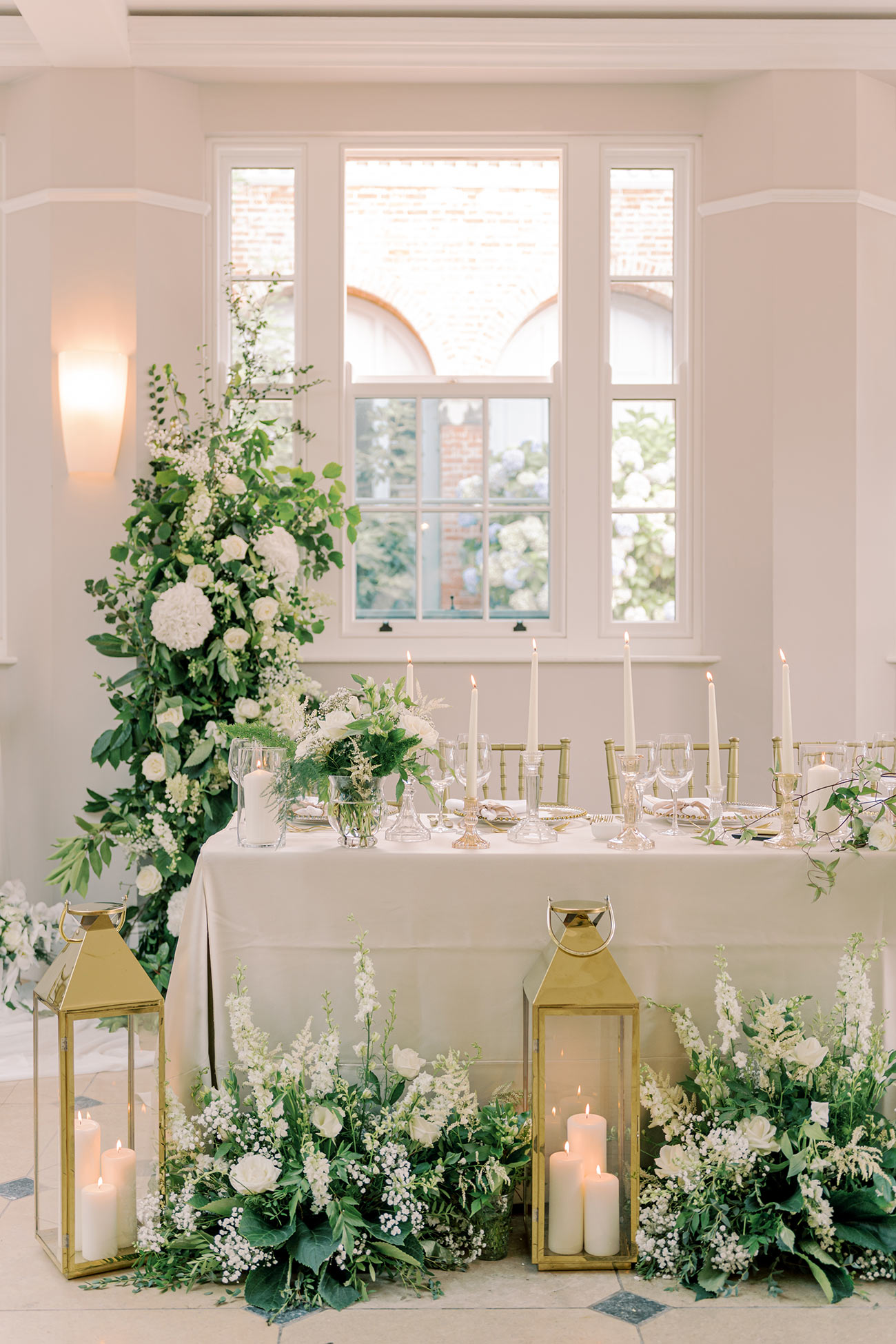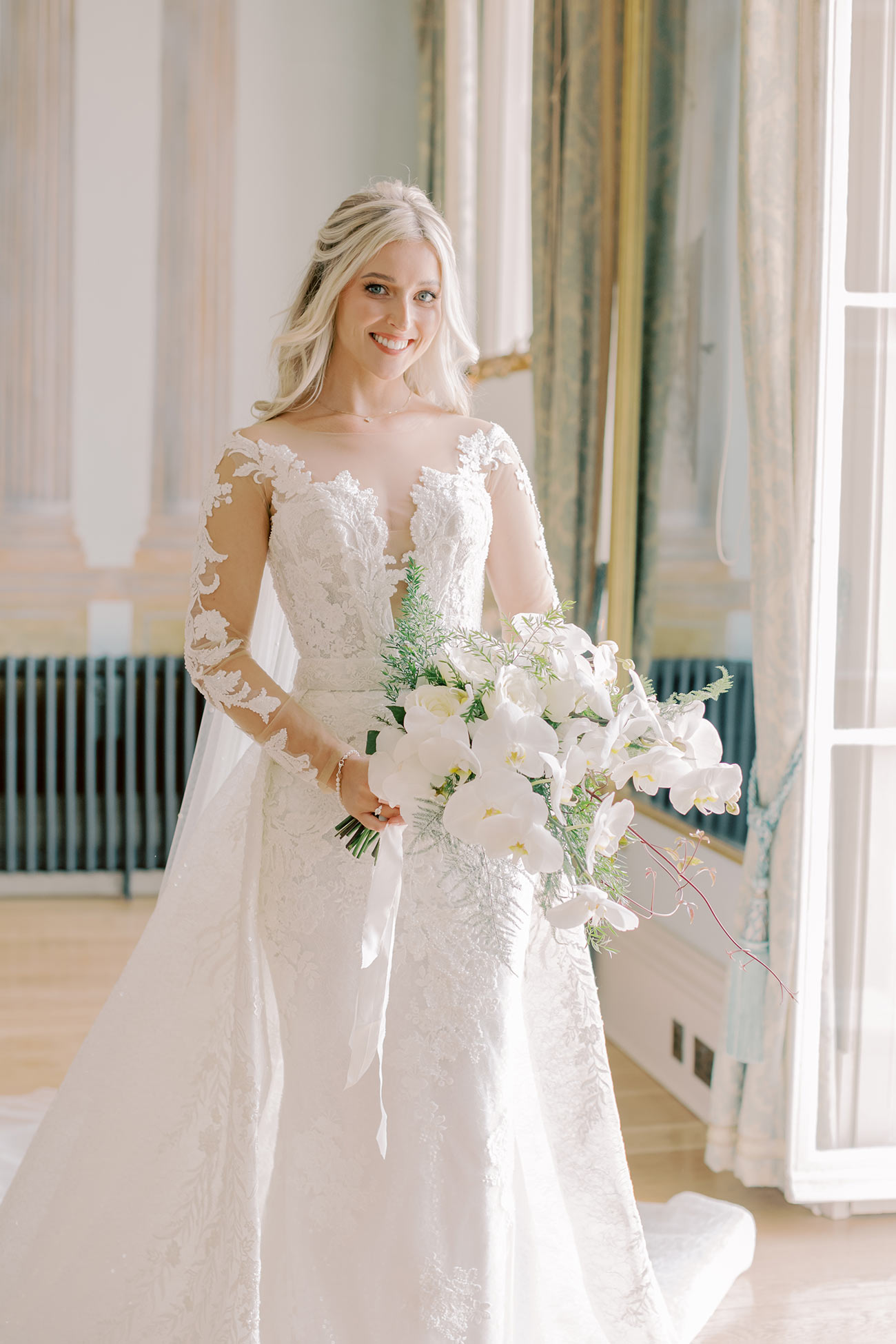 Wedding planning then took centre stage. “We knew we wanted a manor house and Rockbeare Manor was elegant, glamorous and timeless – exactly what we wanted our wedding to be!” says Megan. Choosing a palette of white, green, champagne and gold to match the décor of the venue, the flowers played a key role in the styling. Dramatic arrangements of orchids, hydrangeas, roses, gypsophila and wild greenery adorned the celebration spaces of the venue, beautifully framing the key moments, from the ceremony to the wedding breakfast. “I must admit – the flowers were my favourite detail on the day!” she says.