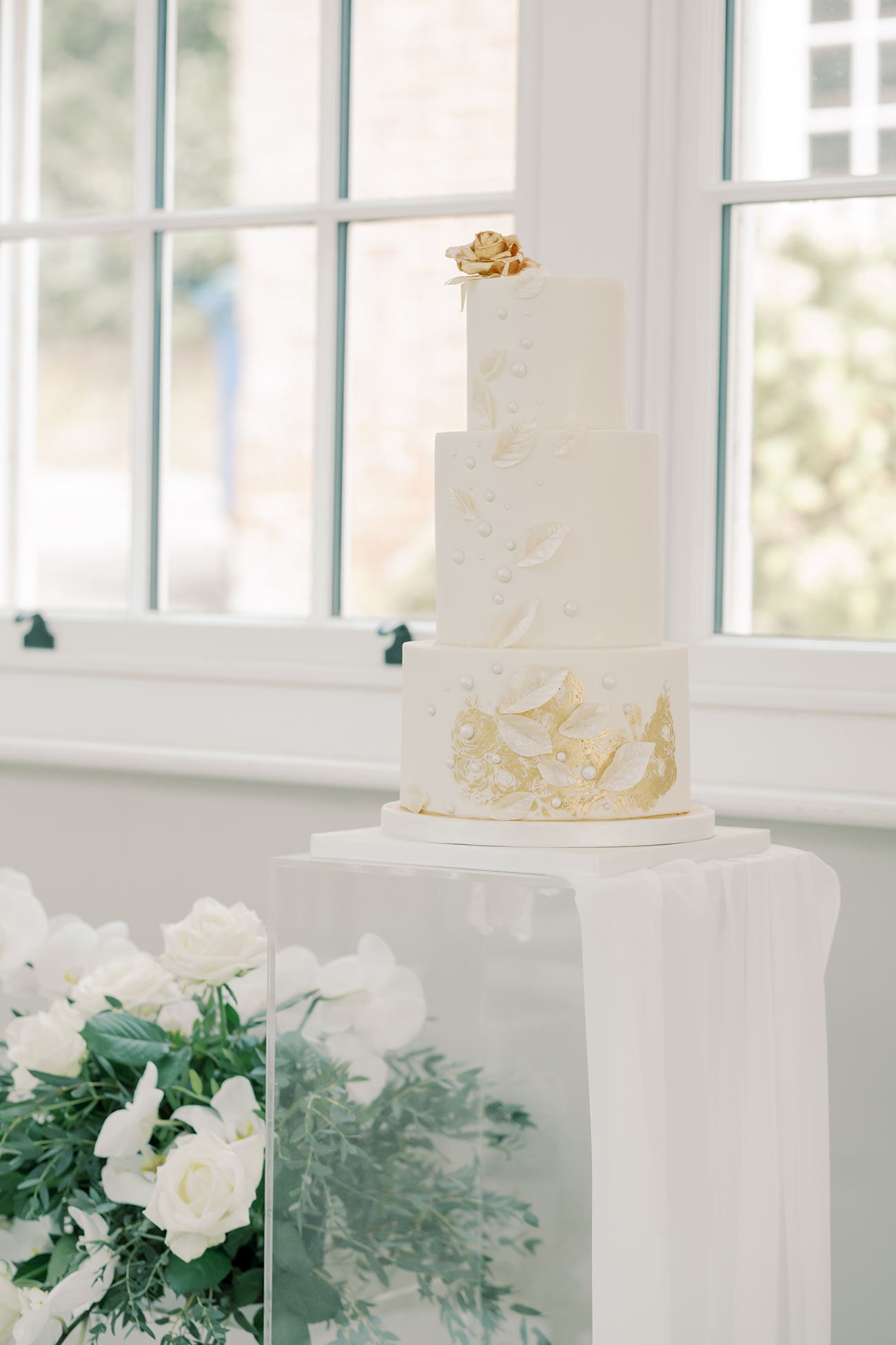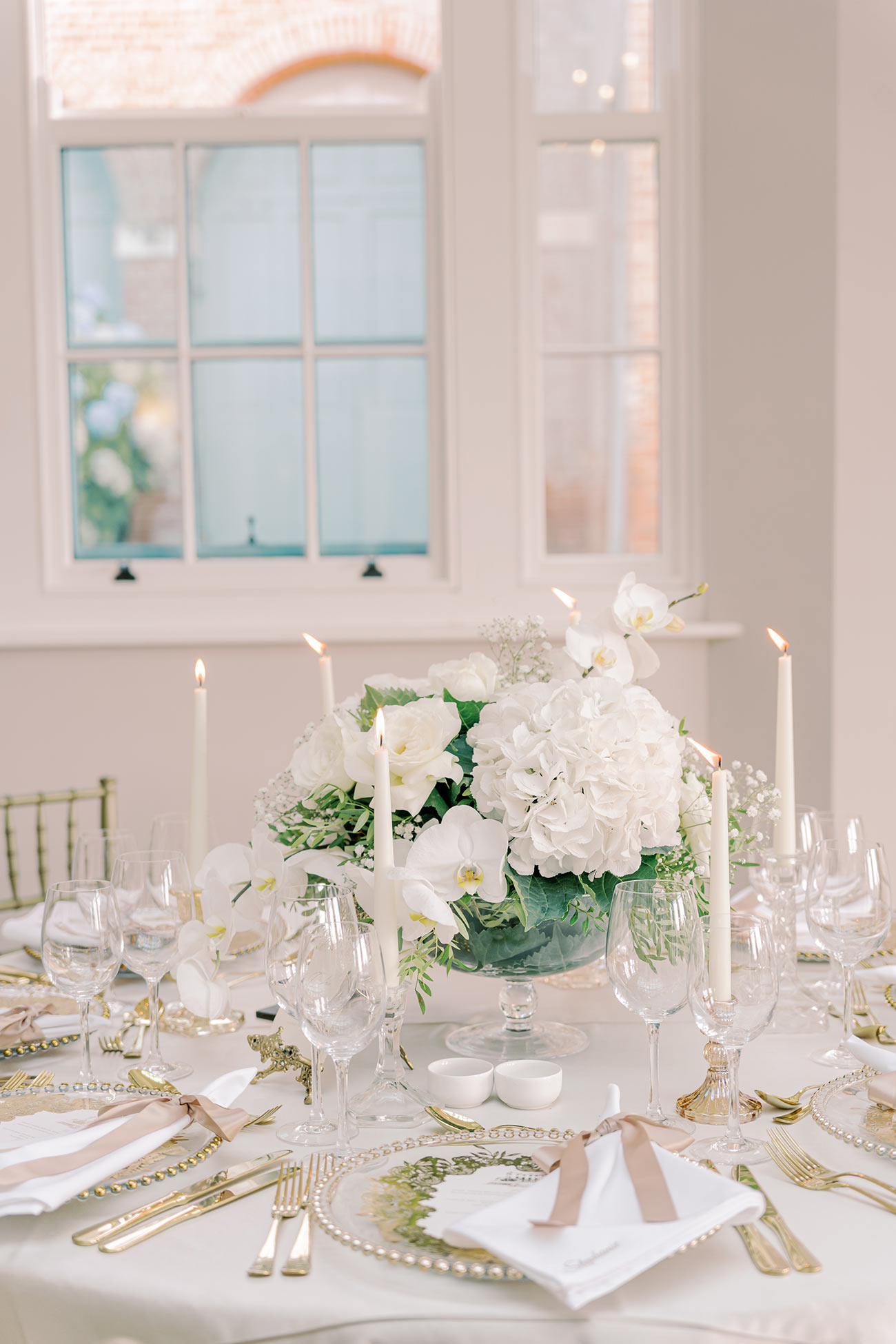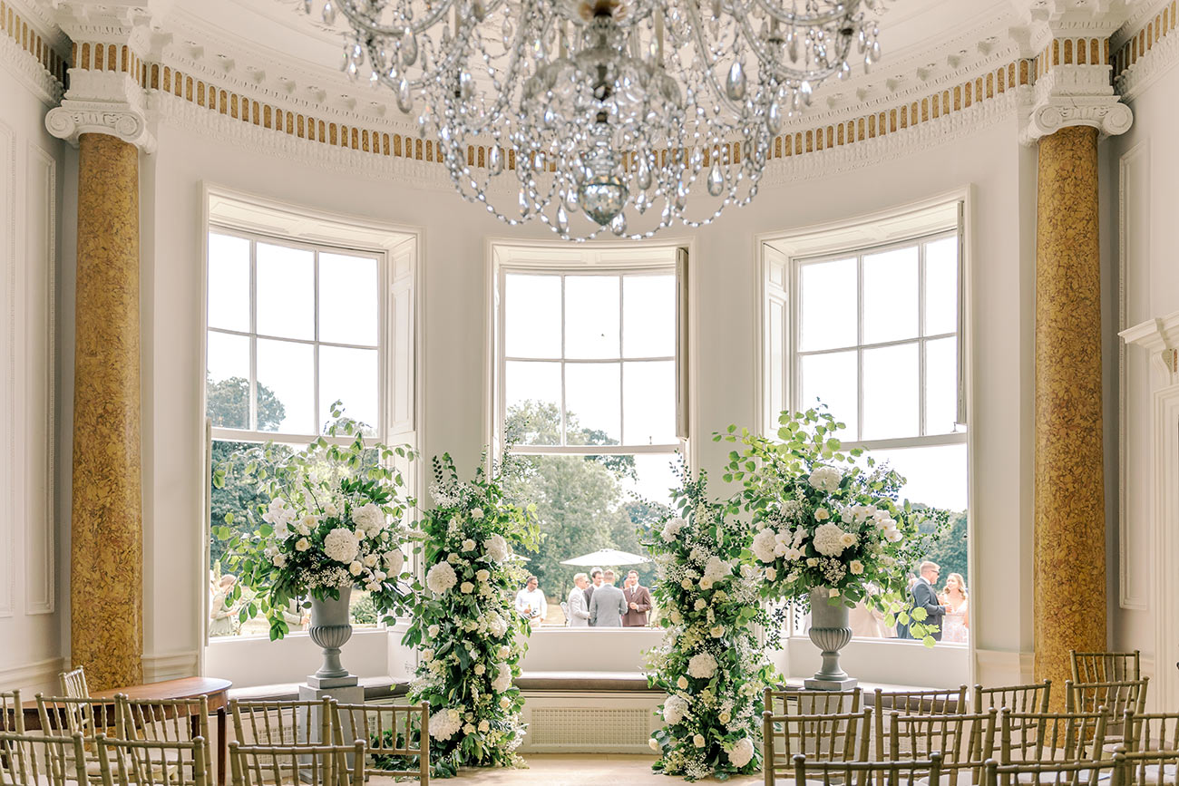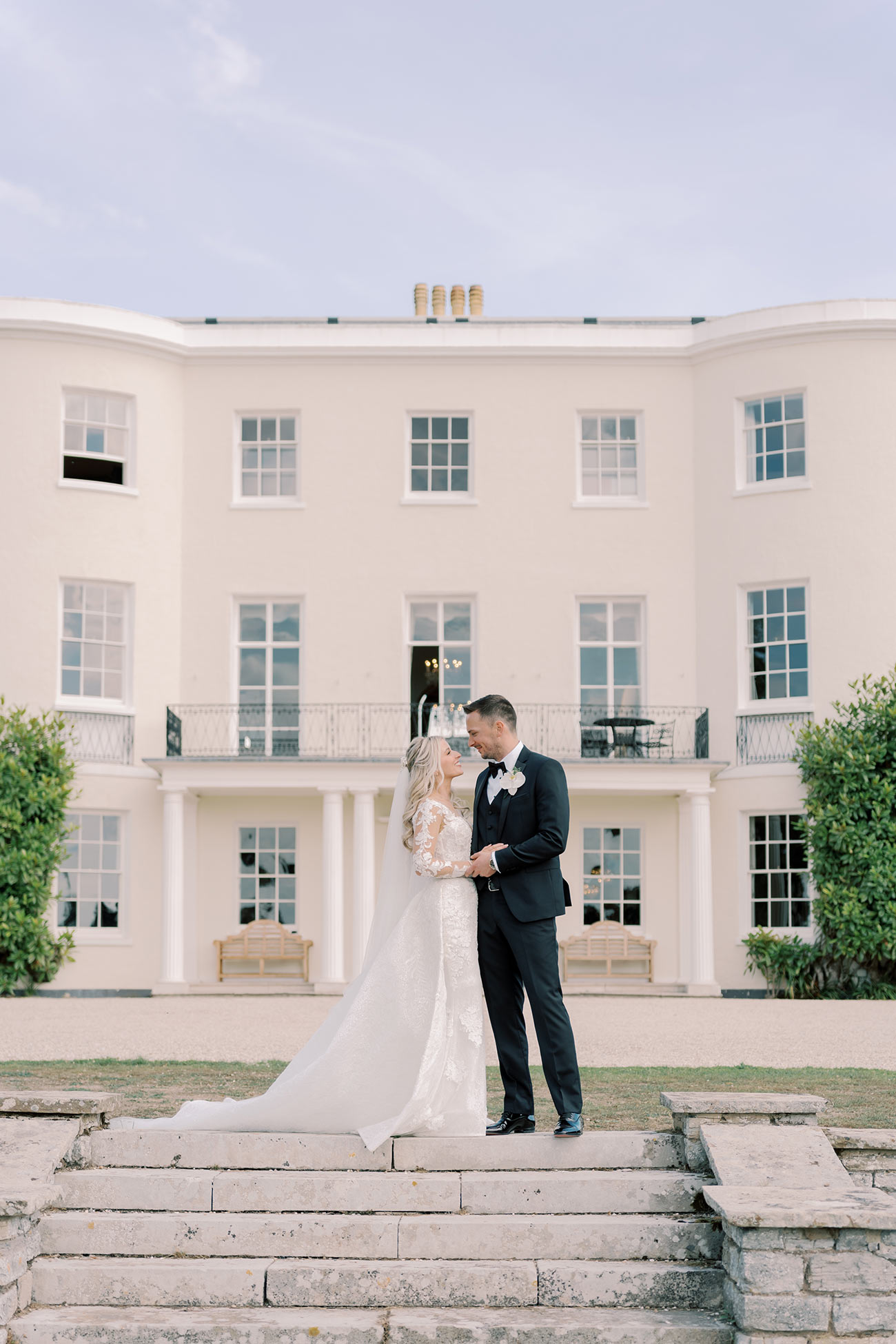 Wedding planning then took centre stage. “We knew we wanted a manor house and Rockbeare Manor was elegant, glamorous and timeless – exactly what we wanted our wedding to be!” says Megan. Choosing a palette of white, green, champagne and gold to match the décor of the venue, the flowers played a key role in the styling. Dramatic arrangements of orchids, hydrangeas, roses, gypsophila and wild greenery adorned the celebration spaces of the venue, beautifully framing the key moments, from the ceremony to the wedding breakfast. “I must admit – the flowers were my favourite detail on the day!” she says.