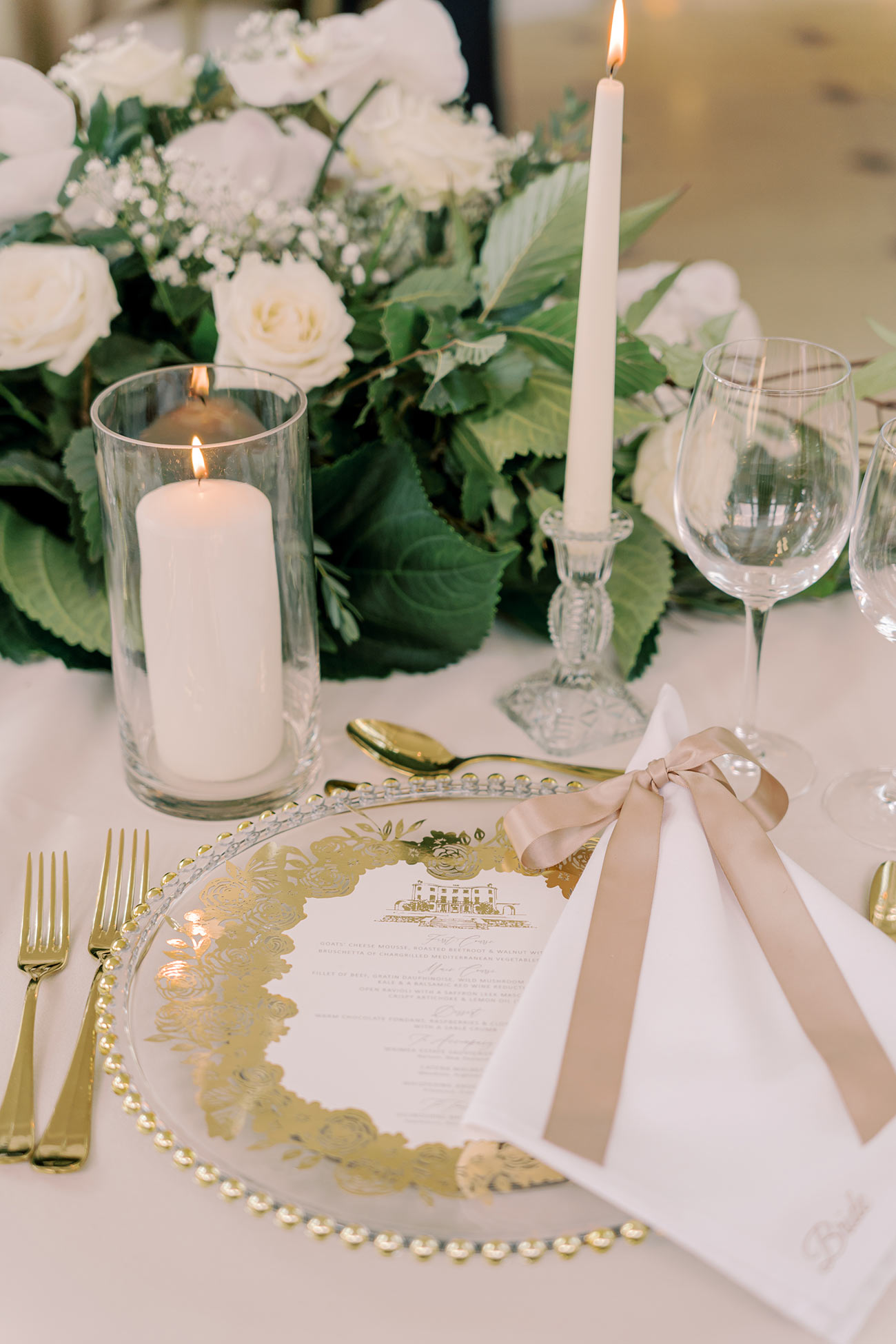 After the vows, guests enjoyed drinks and canapés to a live soundtrack from The Dragonflies. “The sun was shining and it was such a good vibe!” recalls Megan. Adding personal touches throughout their day, the paper napkins for the canapés featured ‘five funny facts about the bride and groom’, while the table napkins on the gorgeously styled tables had each guest’s name ironed onto the corners, hand-tied with a silk ribbon.