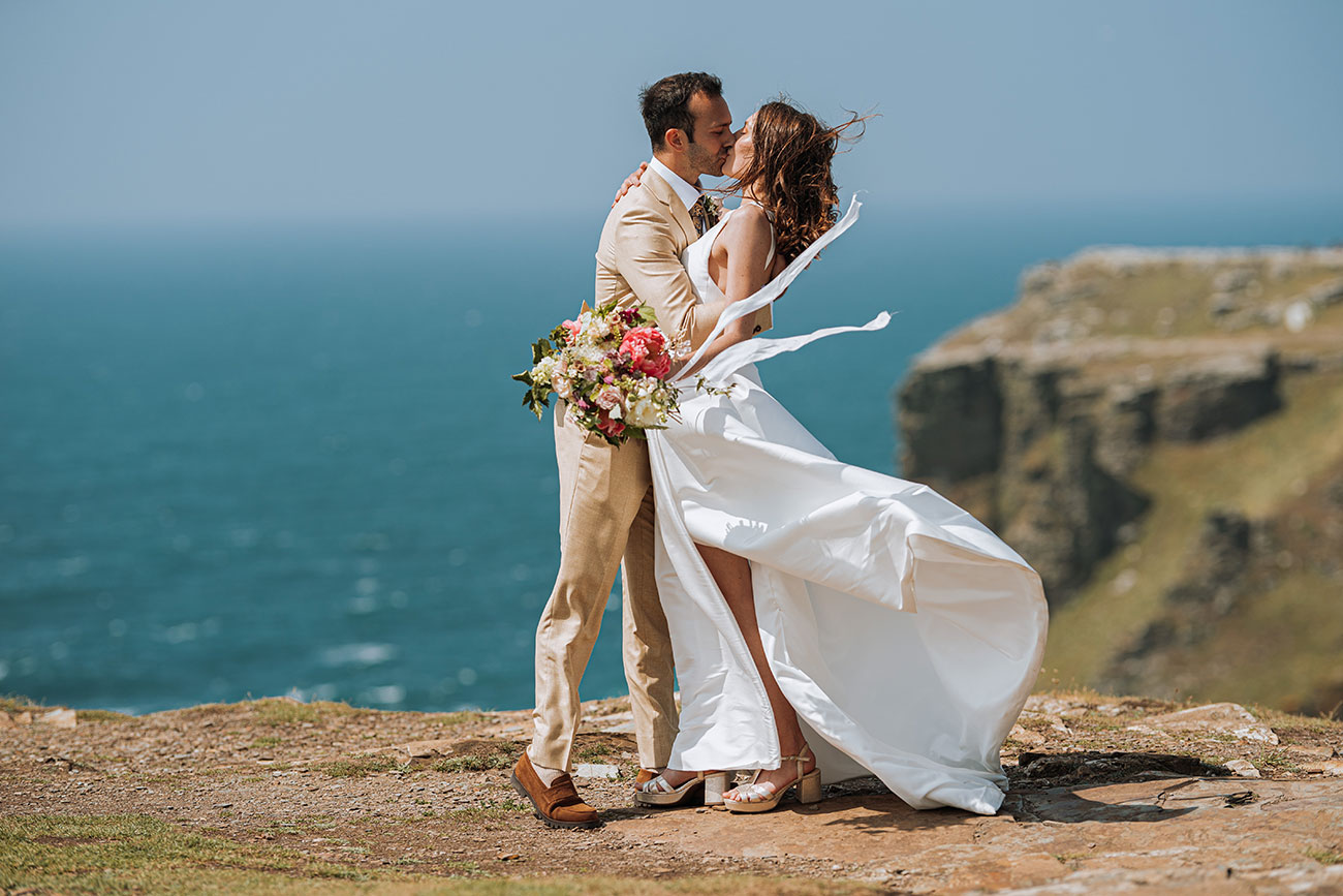 The couple married at St Materiana’s Church on the cliffside at Tintagel. The blue-sky day came with strong winds, which caused a few issues for Jenny – after an extremely windy ride to the church in an open-top car, on leaving the church, her veil flew off and landed on the roof! “We took this as a good omen. Even luckier, one of my cousins managed to chase it down before it ended up in the sea!” she laughs.