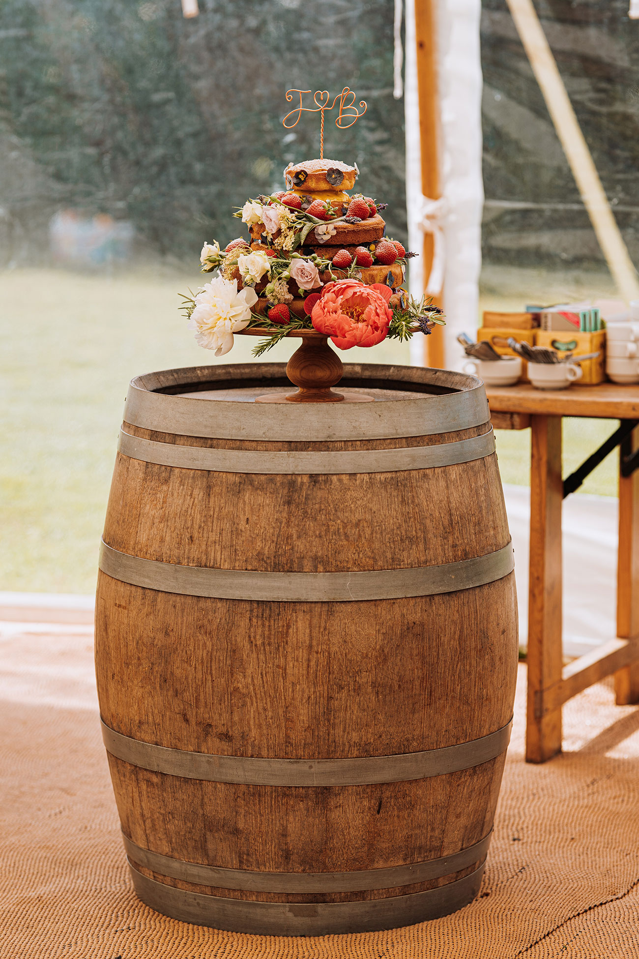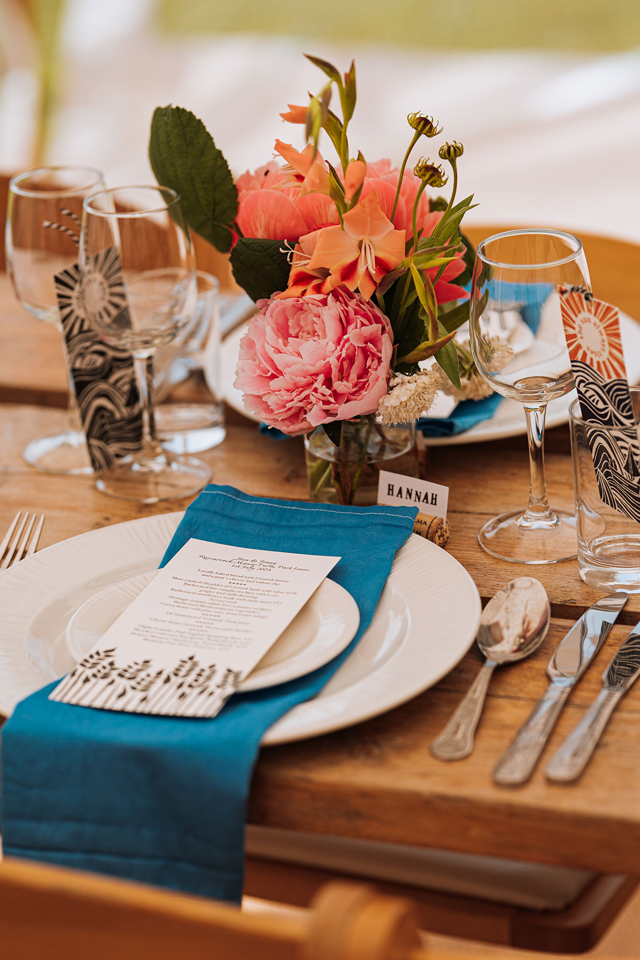 Jenny created the stationery herself, opting for a monochrome lino printed design – “and then we injected some colour into the marquee with apricot, peach, cream and cherry flowers, and a pop of cobalt with the napkins.” A plethora of bunting lovingly handmade by Jenny’s granny gave the scene a British garden party feel, while shell-decorated signage provided a nod to their ocean surrounds. The flowers were a key feature, following Jenny’s brief for “bright, country garden-style blooms for the bouquets and table flowers, and a huge foliage-filled floral arch in the church”, all of which were locally grown and seasonal.