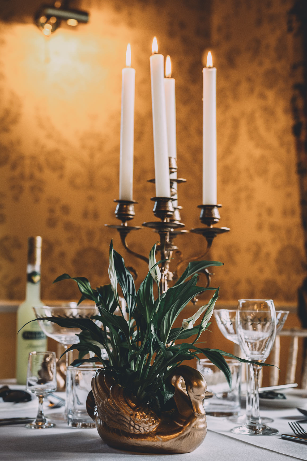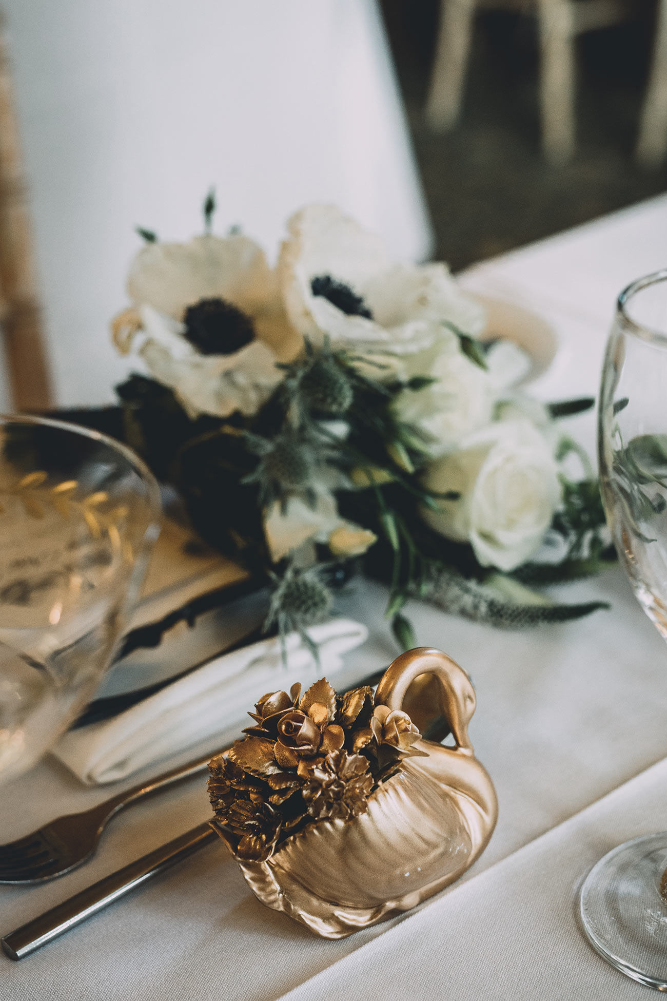 The black tie affair was styled with swans and gold accents. “I had a clear vision of ornate gold, regal tablescapes, swan planters, white amaryllis in the church, anemones and thistles in our whimsical bouquets, and large stone vases and beautiful church candles throughout,” explains Grace.