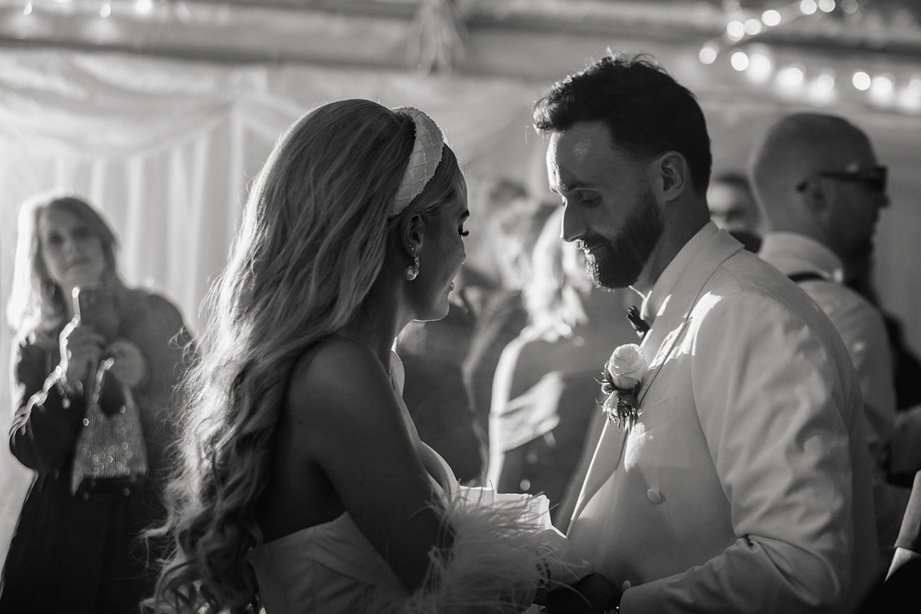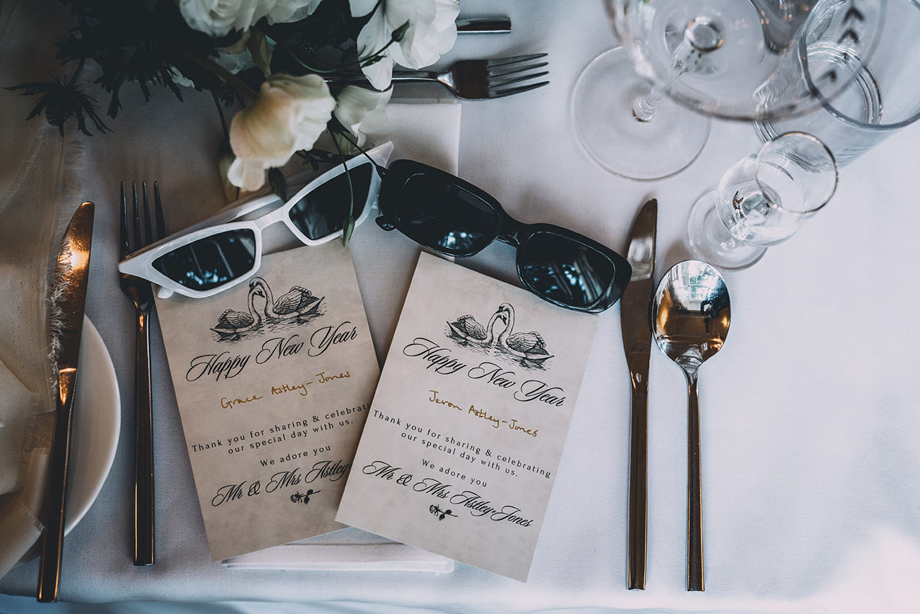 Looking back, entering the dining room was a real standout moment, thanks to their party-loving friends. “Our raucous wedding guests were all dancing and cheering to Jennifer Lopez’s Let’s Get Loud – with matching chic sunglasses and napkins swinging in the air,” laughs Grace.