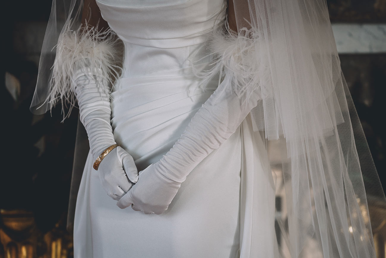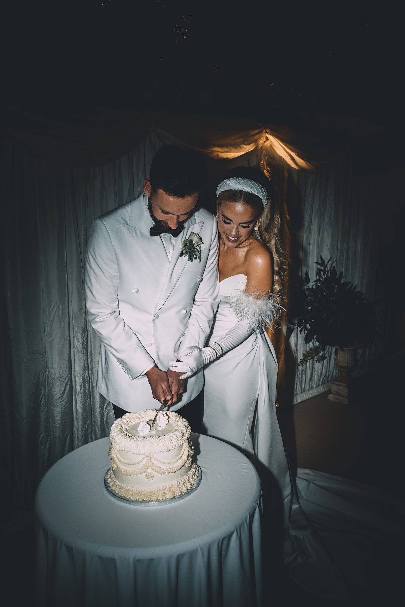 Style took a front seat, with the nearlyweds knowing just how they wanted to look for their dazzling day. “I wanted to combine the elegance and gracefulness of the beautiful Grace Kelly and the timeless style of Marilyn Monroe,” explains Grace, who wore a stunning minimalist gown with a detachable overskirt and custom silk and ostrich feather gloves. “My wonderful bridesmaids’ inspiration was Audrey Hepburn in Breakfast at Tiffany’s with her iconic black dress, gloves and pearls,” she continues. “Jevon always knew what he wanted to wear too: a classic ivory velvet double-breasted jacket with gold accessories.”