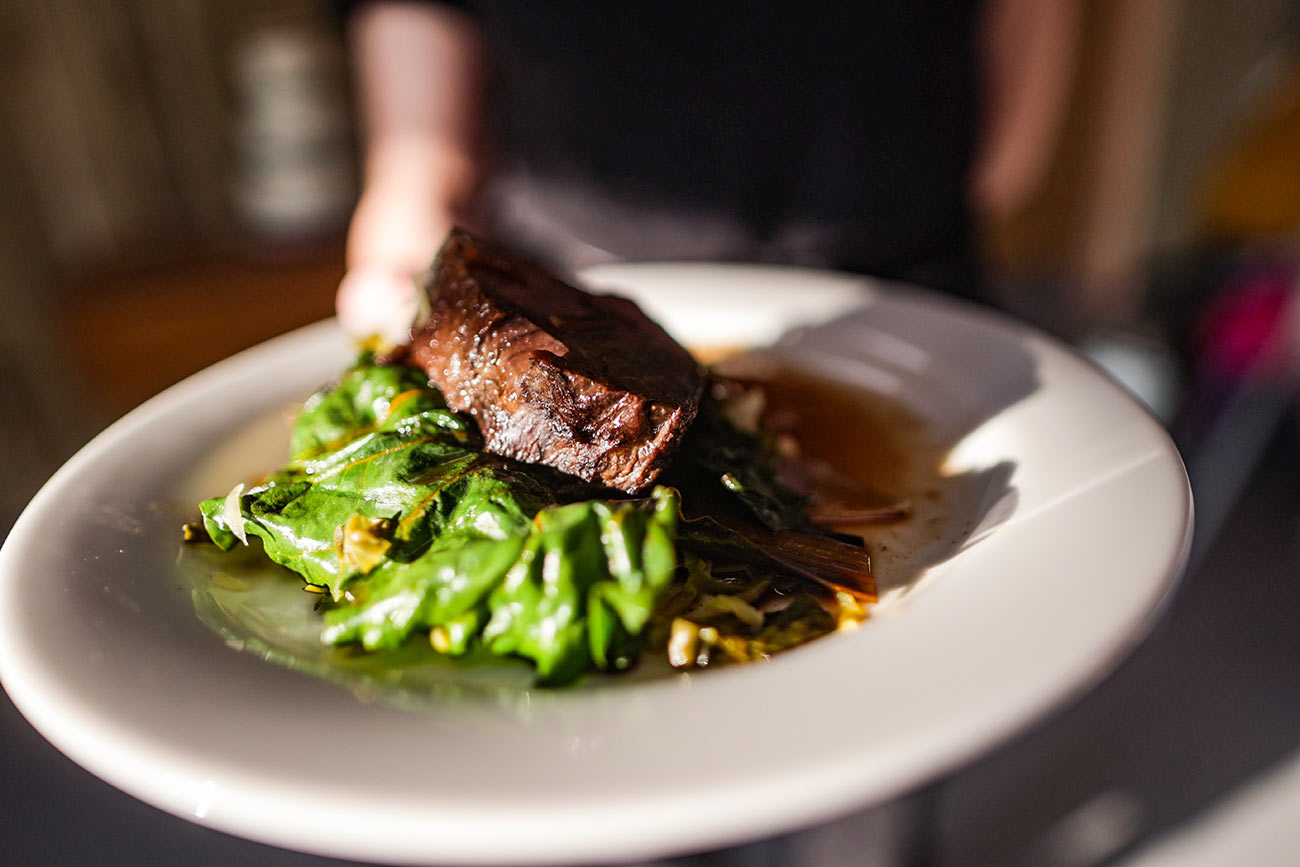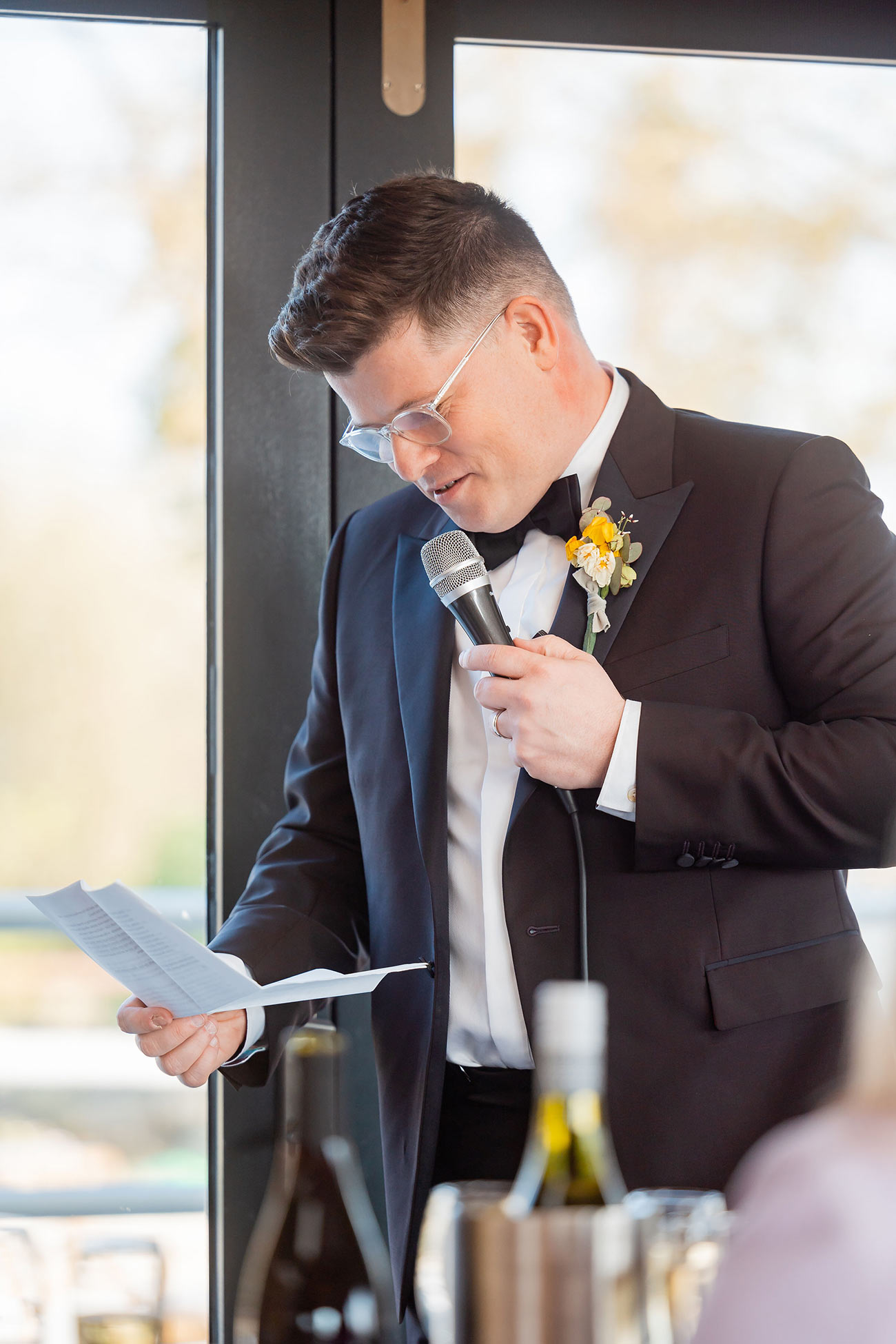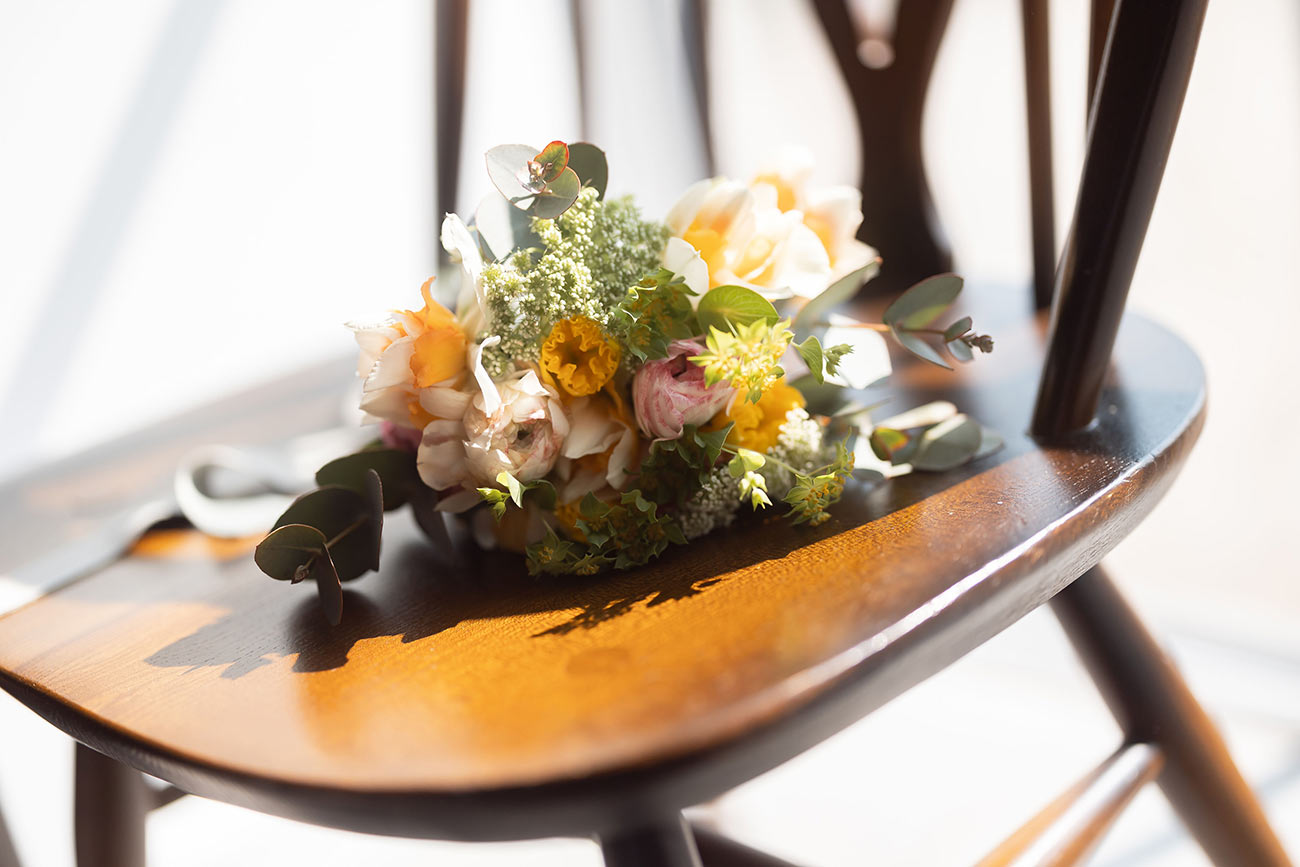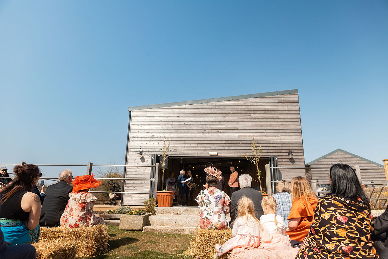 Having originally planned to wed inside, the couple chose to take their vows on the balcony due to an unseasonally warm March day. “For both of us, the ceremony was undoubtedly one of the highlights of the day,” says Matt. “The feeling of having our friends and family gathered together on hay bales created an atmosphere that was both intimate and magical. The cherry trees and weeping willows held a special significance as we gave them as gifts to our friends and family at the end of the day. We also kept two for ourselves to remember the day.”